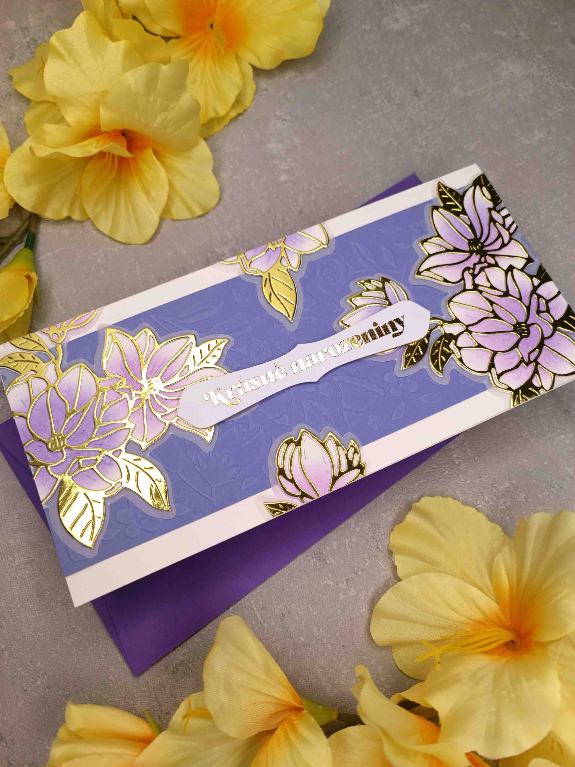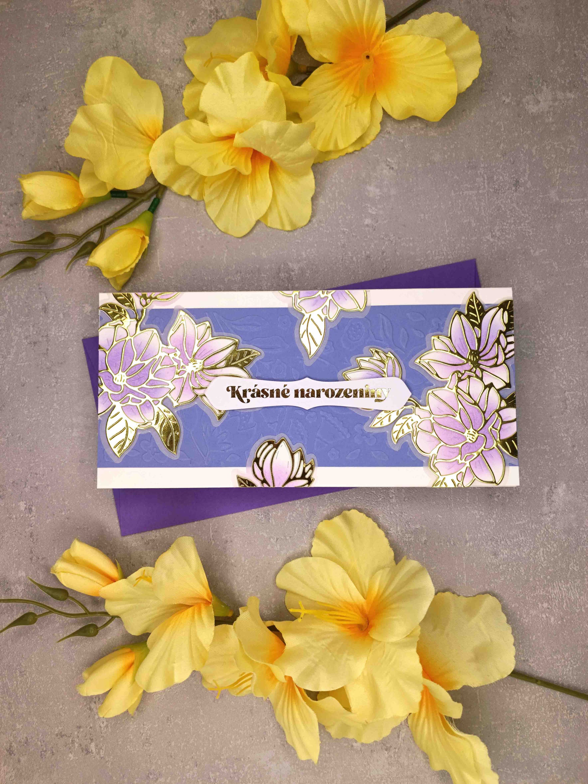 - Přání je laděno do fialové barvy a zdobeno něžnými fialovo-zlatými květinami, je také opatřeno elegantním zlatým nápisem, který mu dodává luxusní vzhled