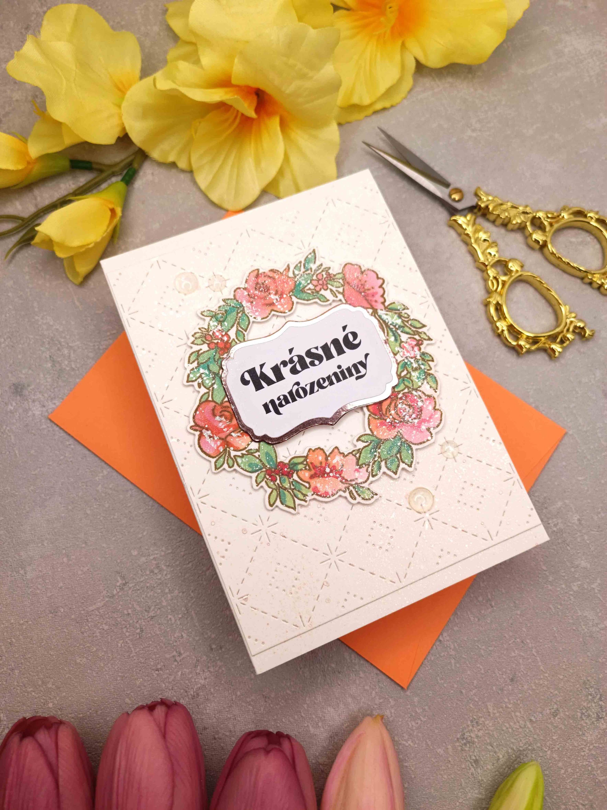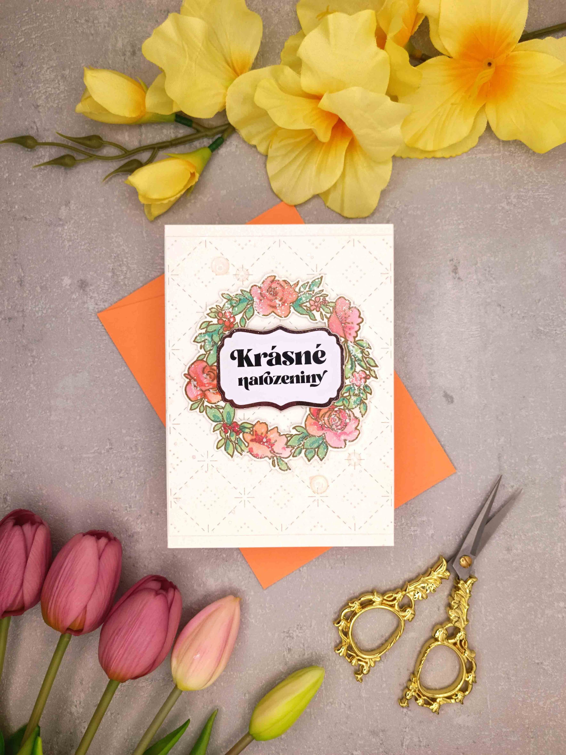 - Přání je zdobeno něžným oranžovým věncem z květin. Je také opatřeno elegantním zlatým (rose gold) rámečkem okolo nápisu, který mu dodává luxusní vzhled. V bílém pozadí je vytlačen motiv lístěčků, větviček a drobných srdíček.