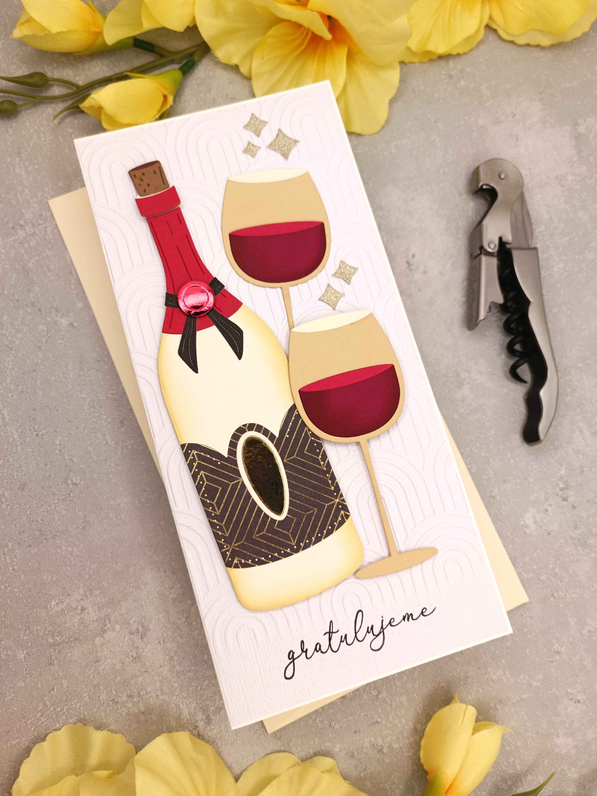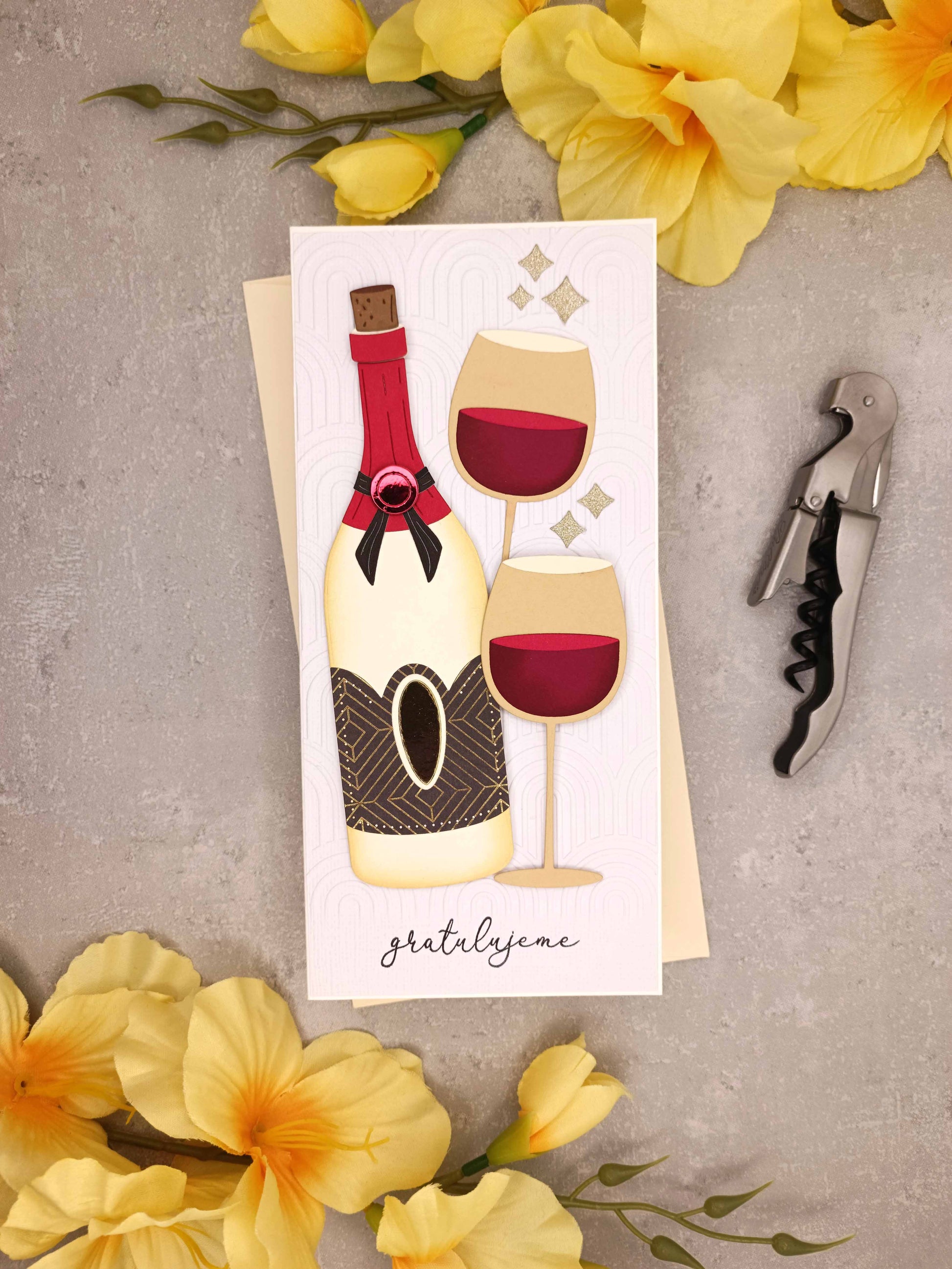 - Přání je podlouhlého tvaru s bílým podkladem, zdobeno lahví vína a skleničkami s červeným vínem