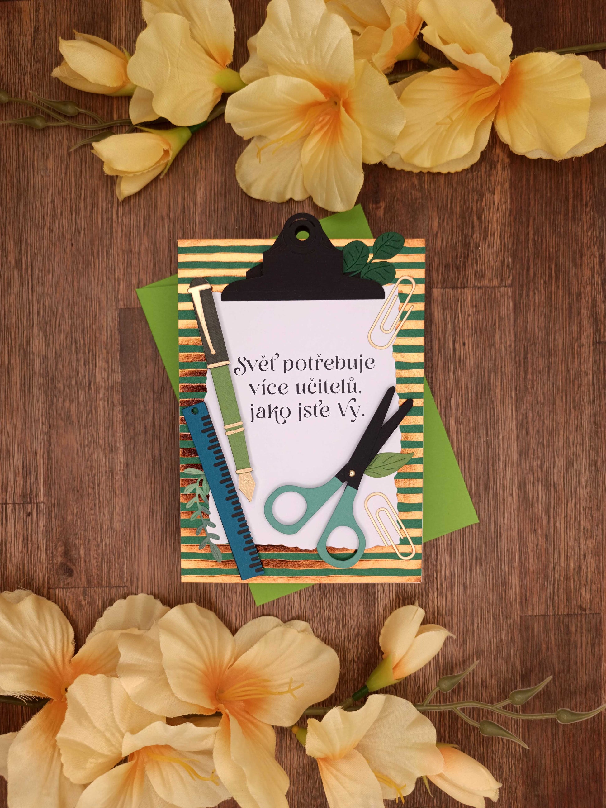 - Přání nese motiv desek s papírem, psacími potřebami a je zdobeno zlatými elementy