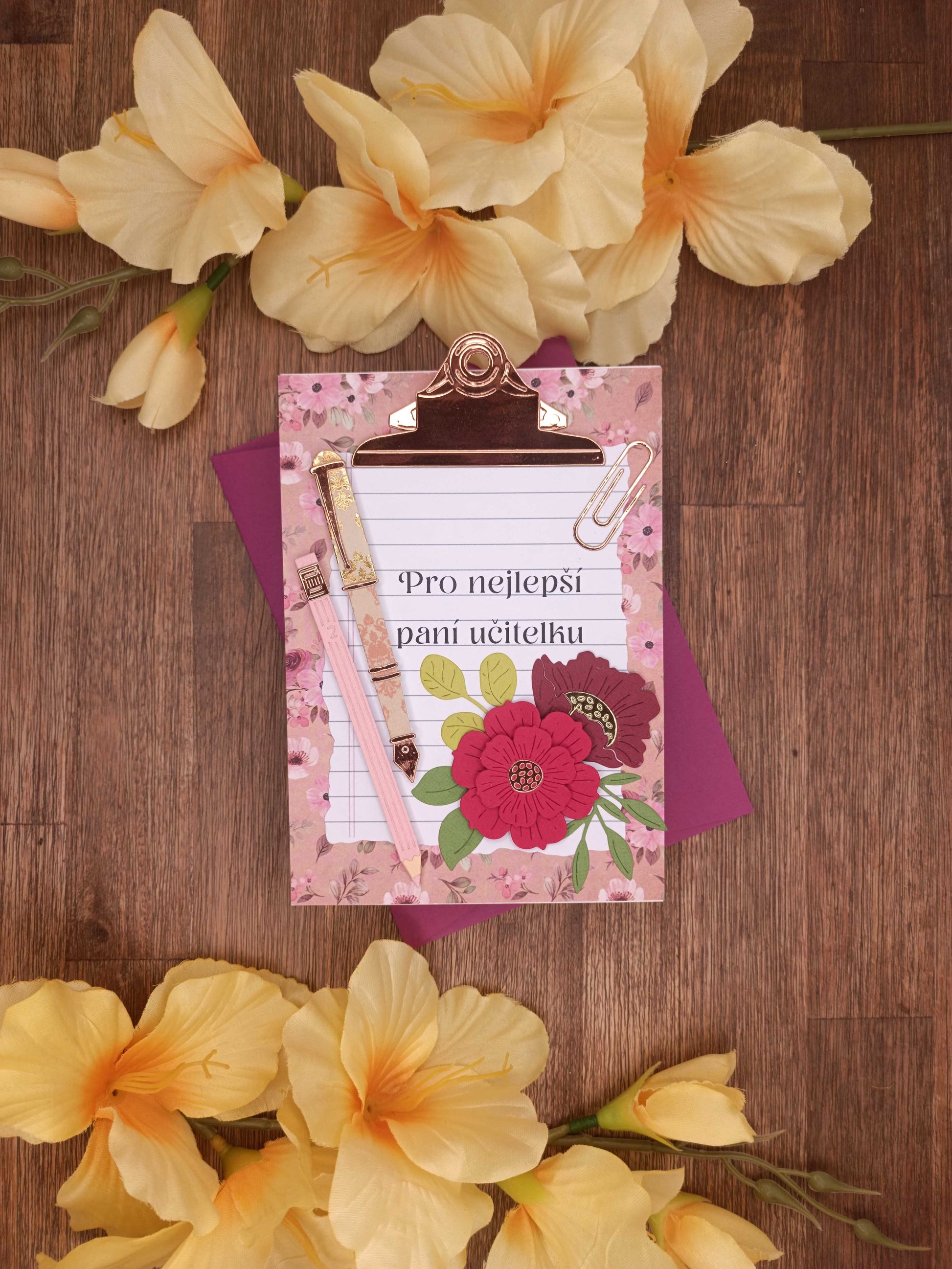 - Přání nese motiv desek s papírem, psacími potřebami a je zdobeno růžovo-zlatými elementy