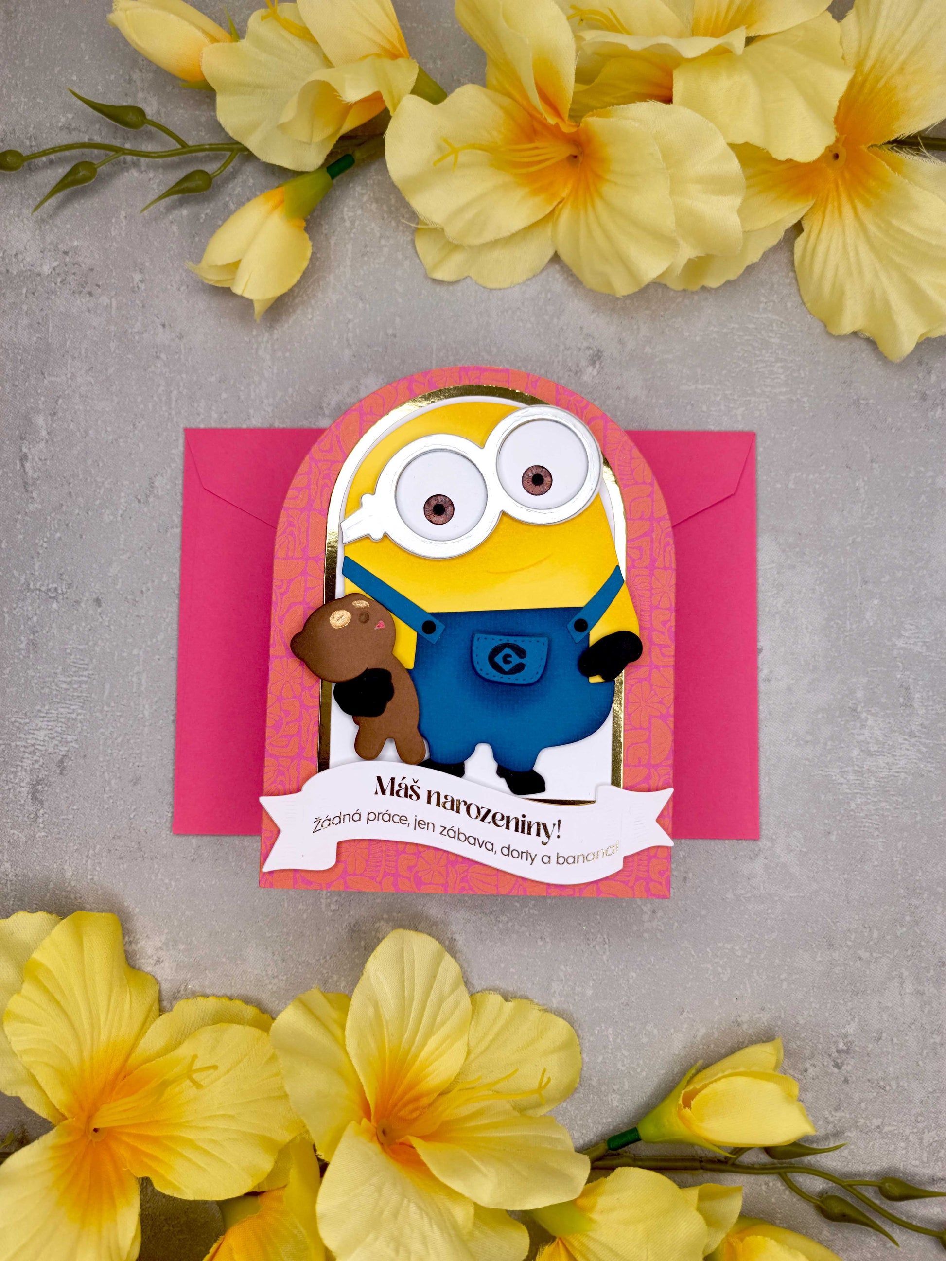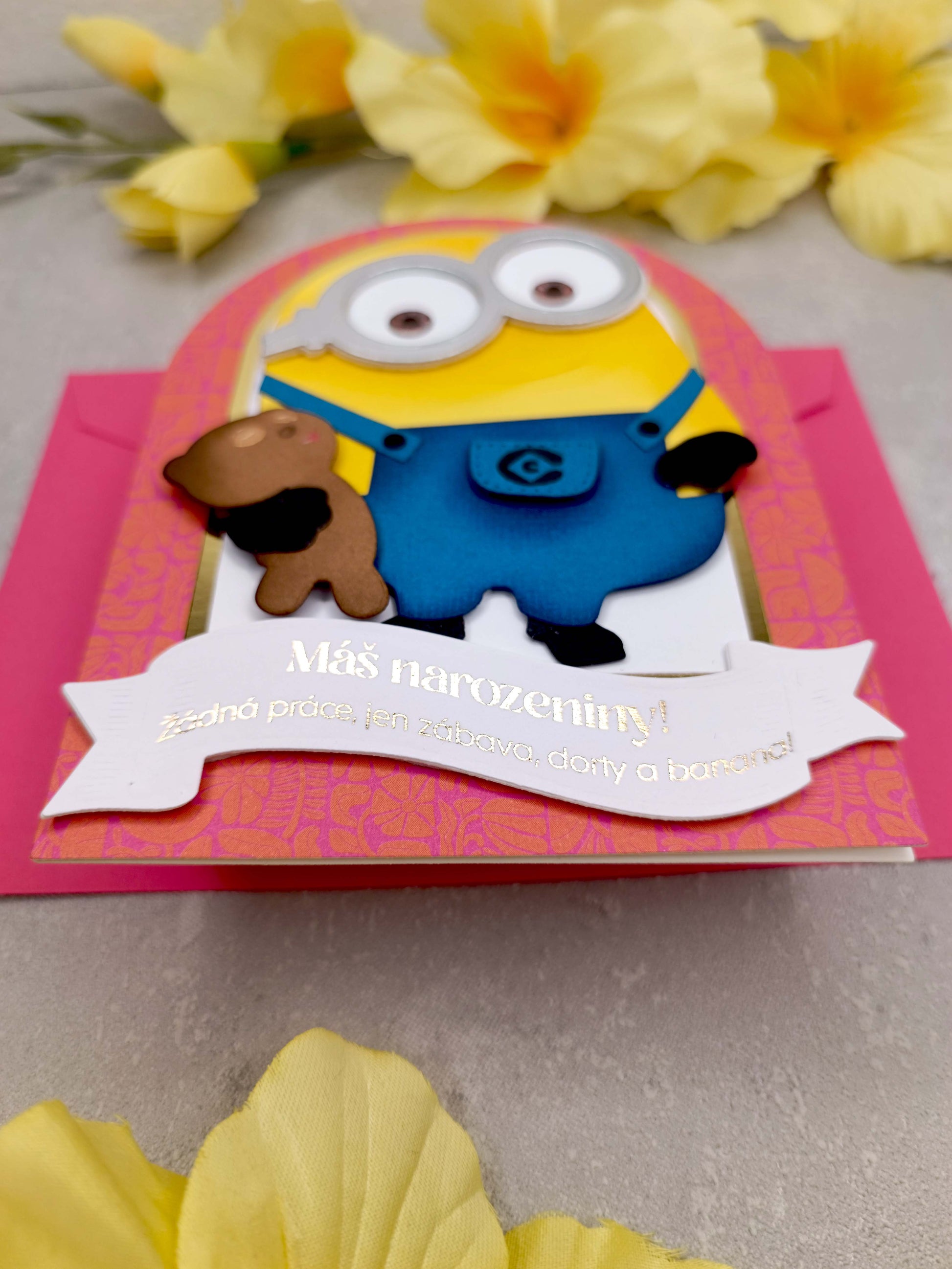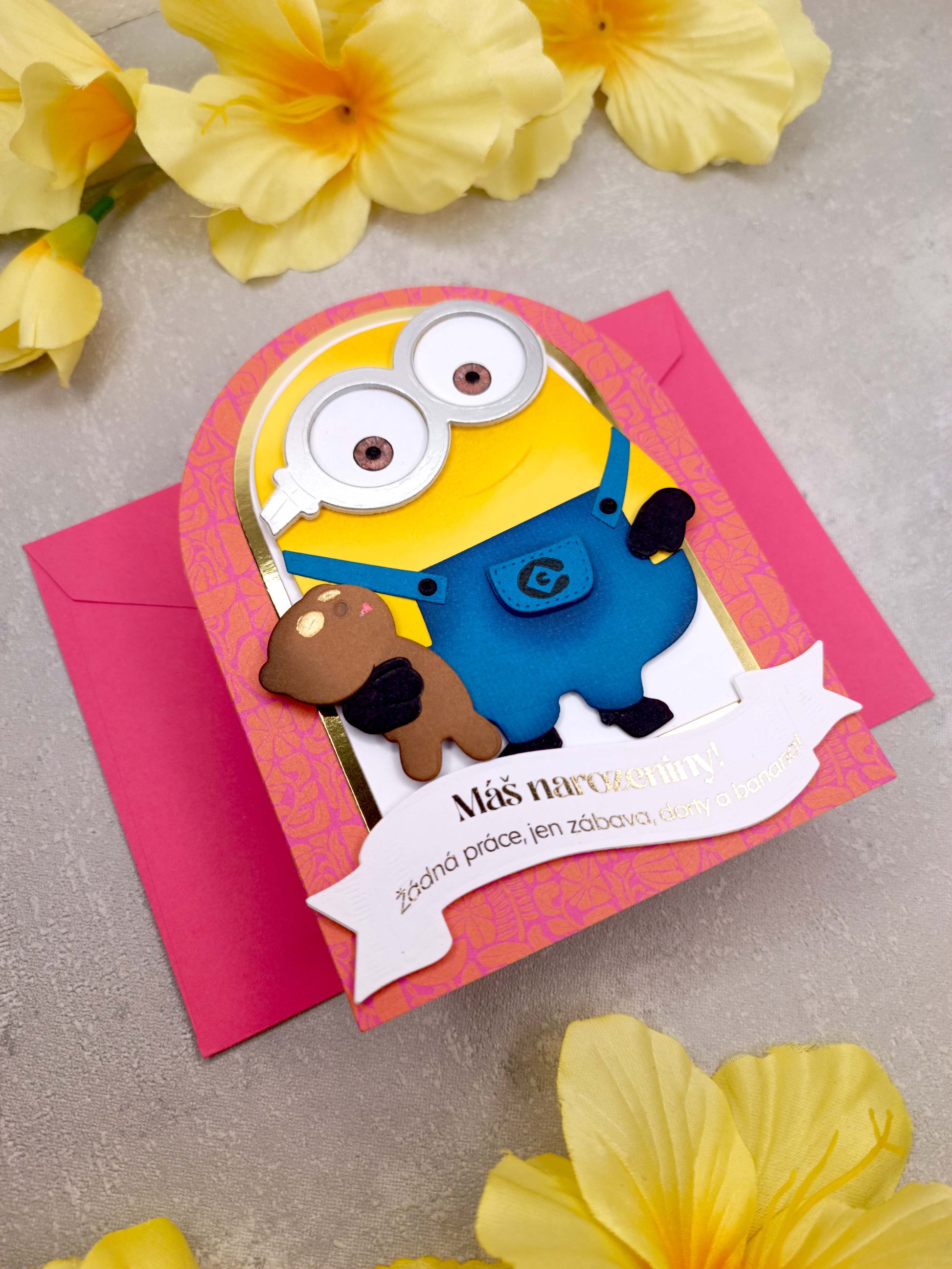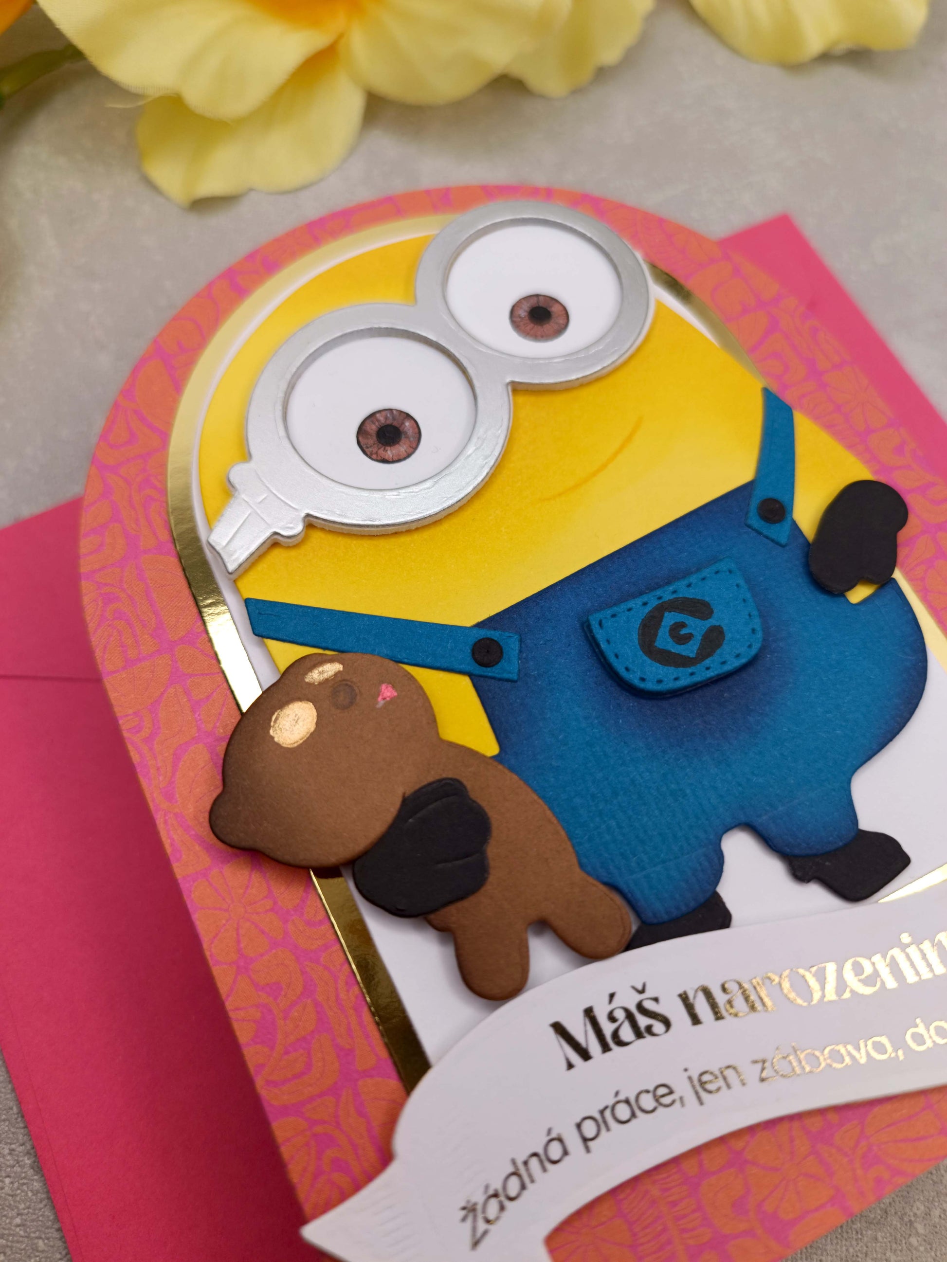 - Přání je ve tvaru oblouku, zdobeno růžovo-oranžovým vzorovaným papírem a zlatými elementy