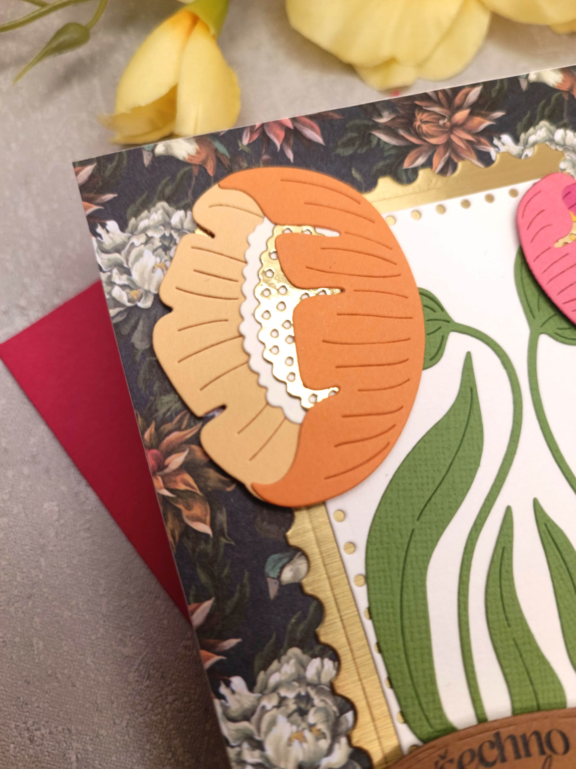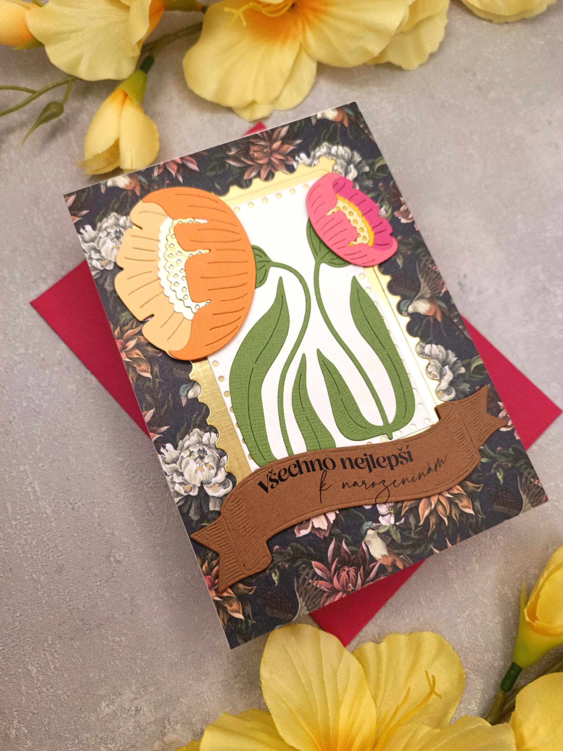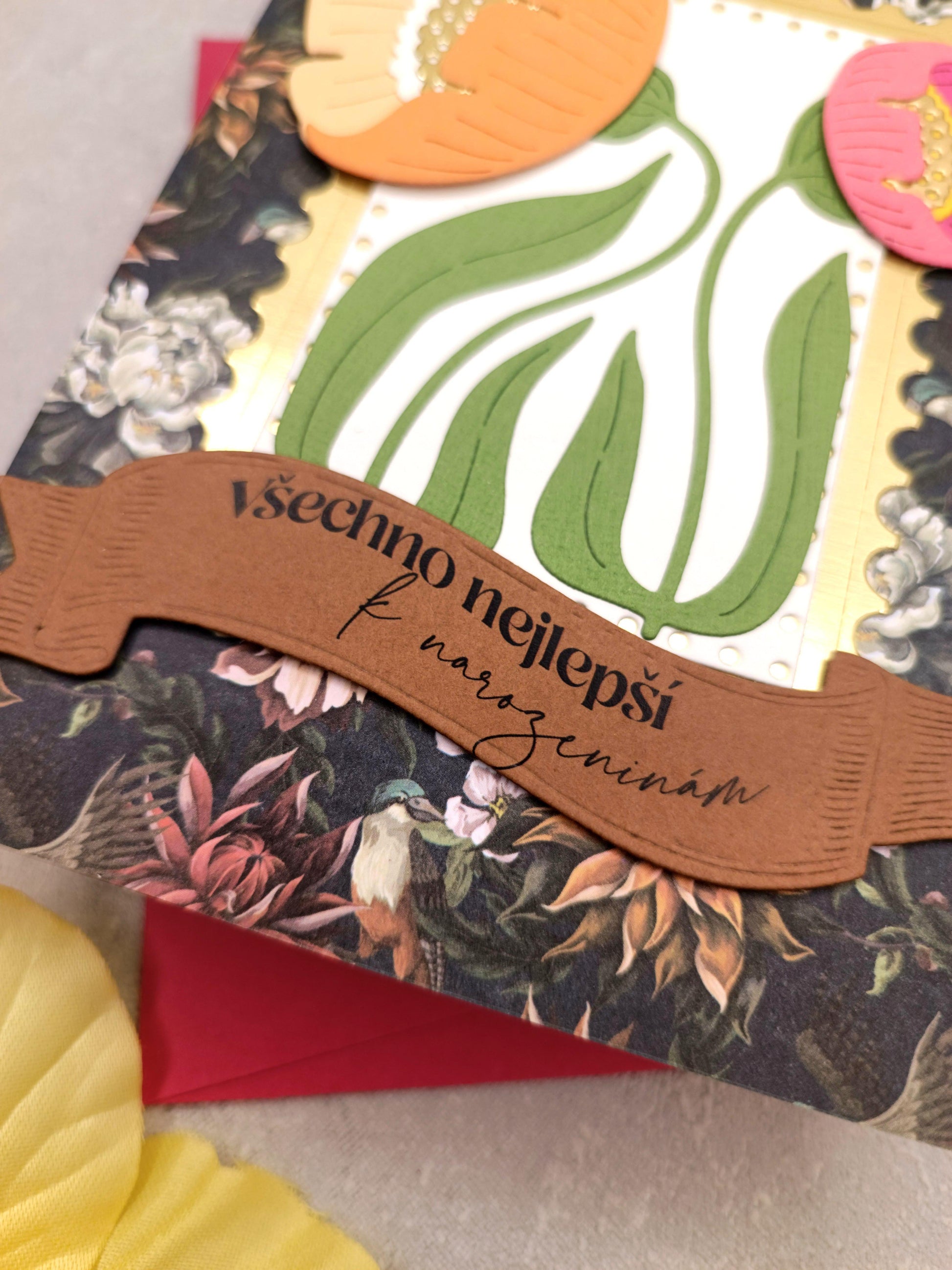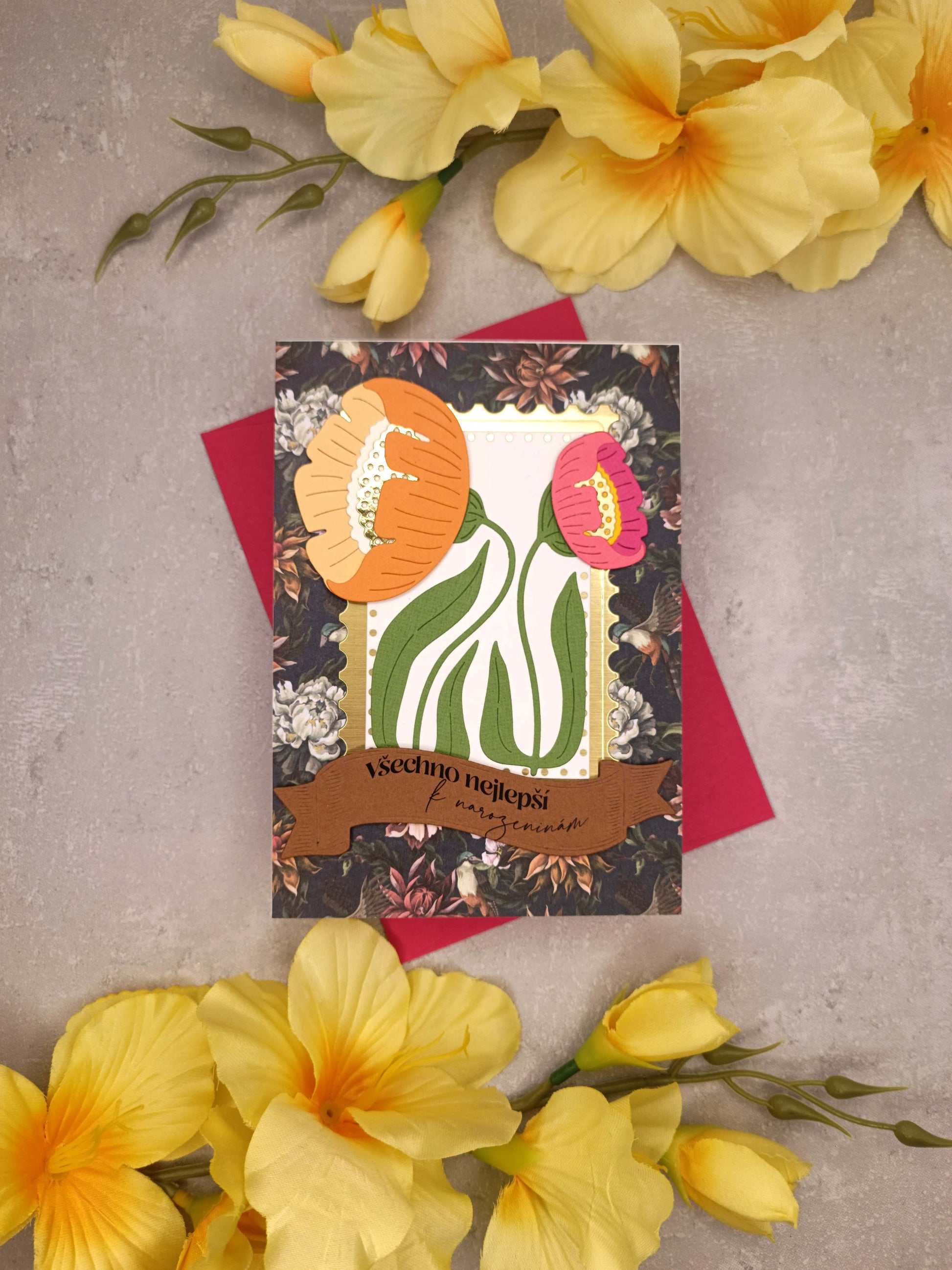 - Přání zdobí tmavé květinové pozadí se sasankami a zlatými elementy v popředí