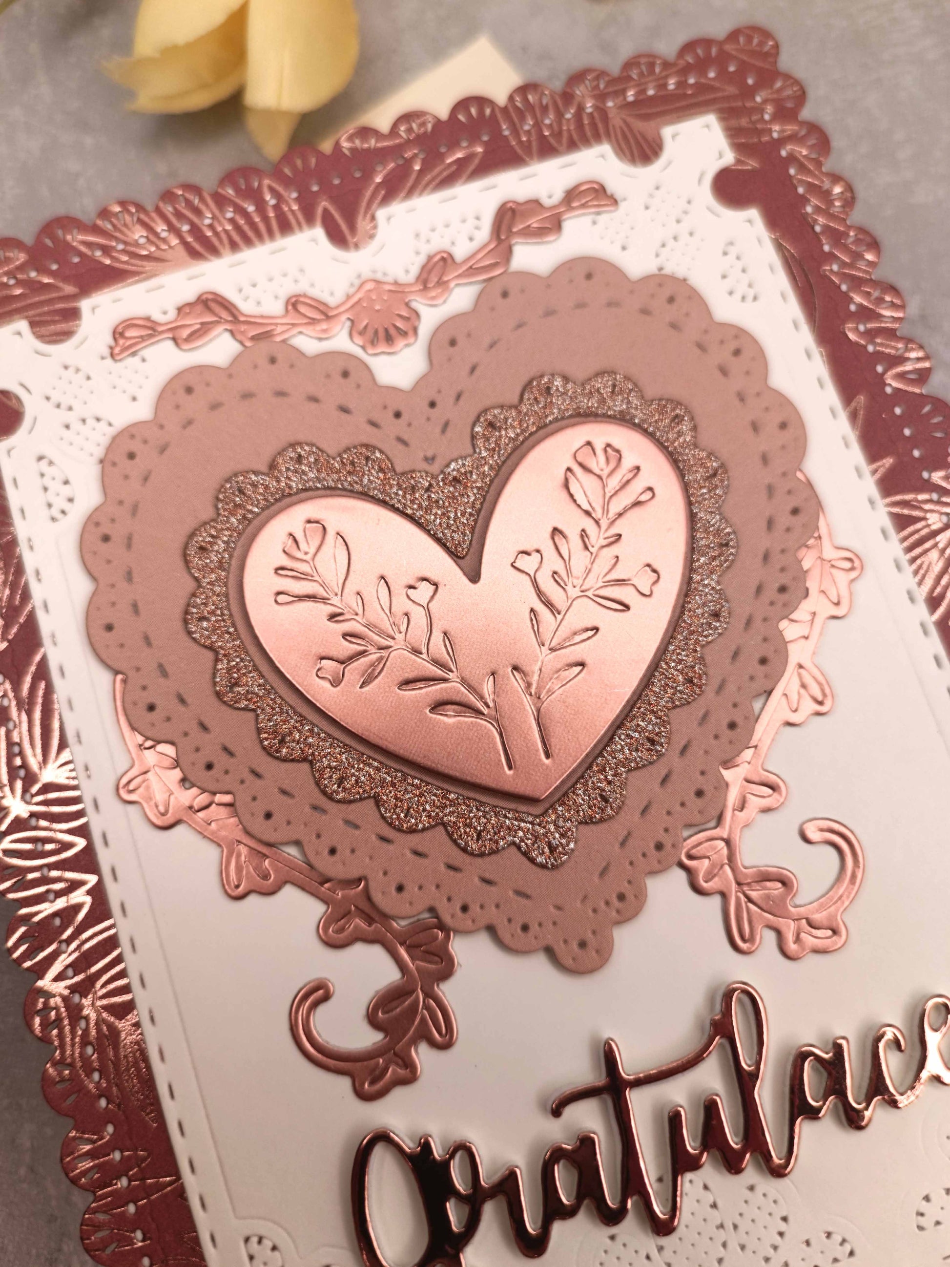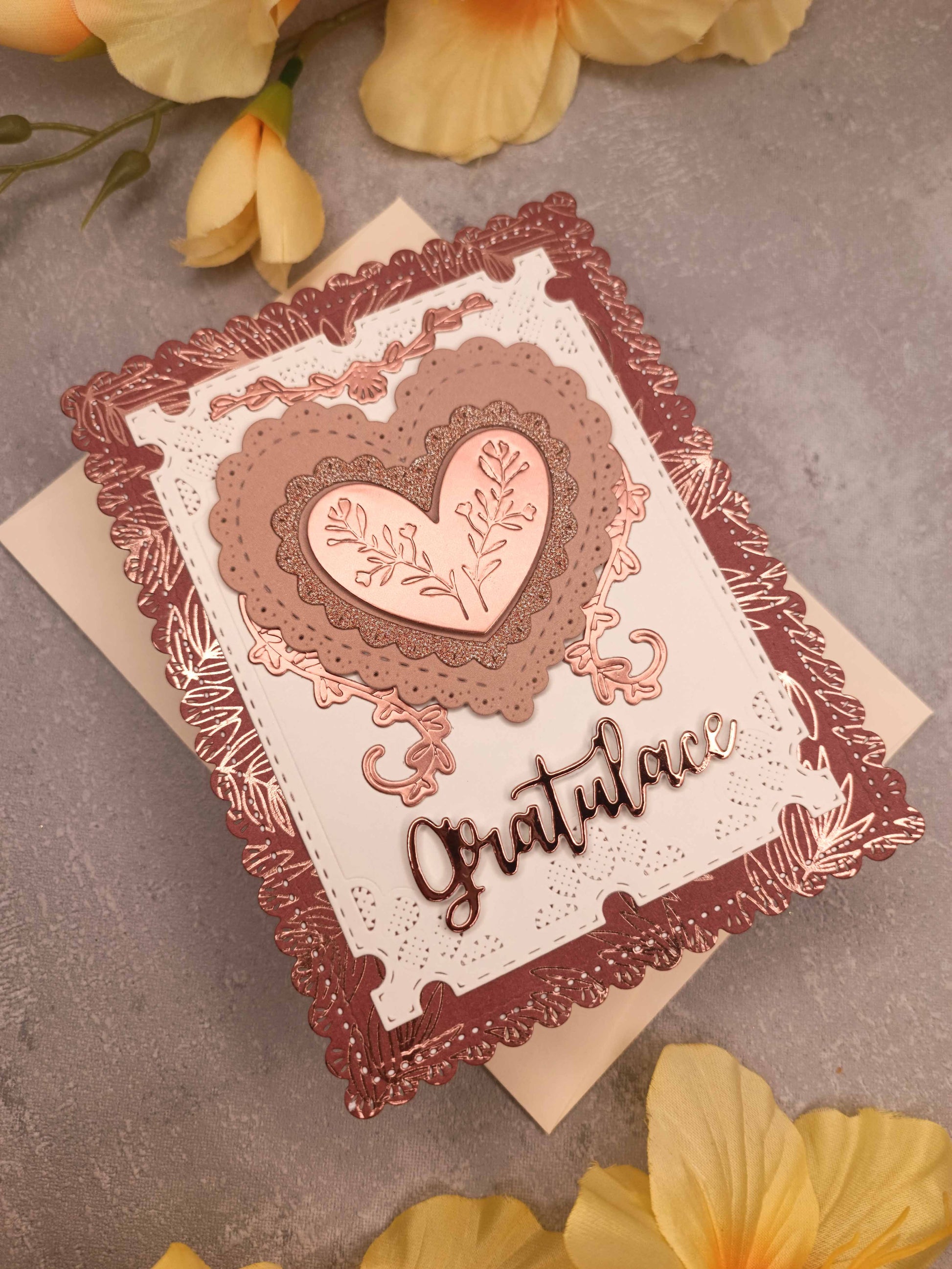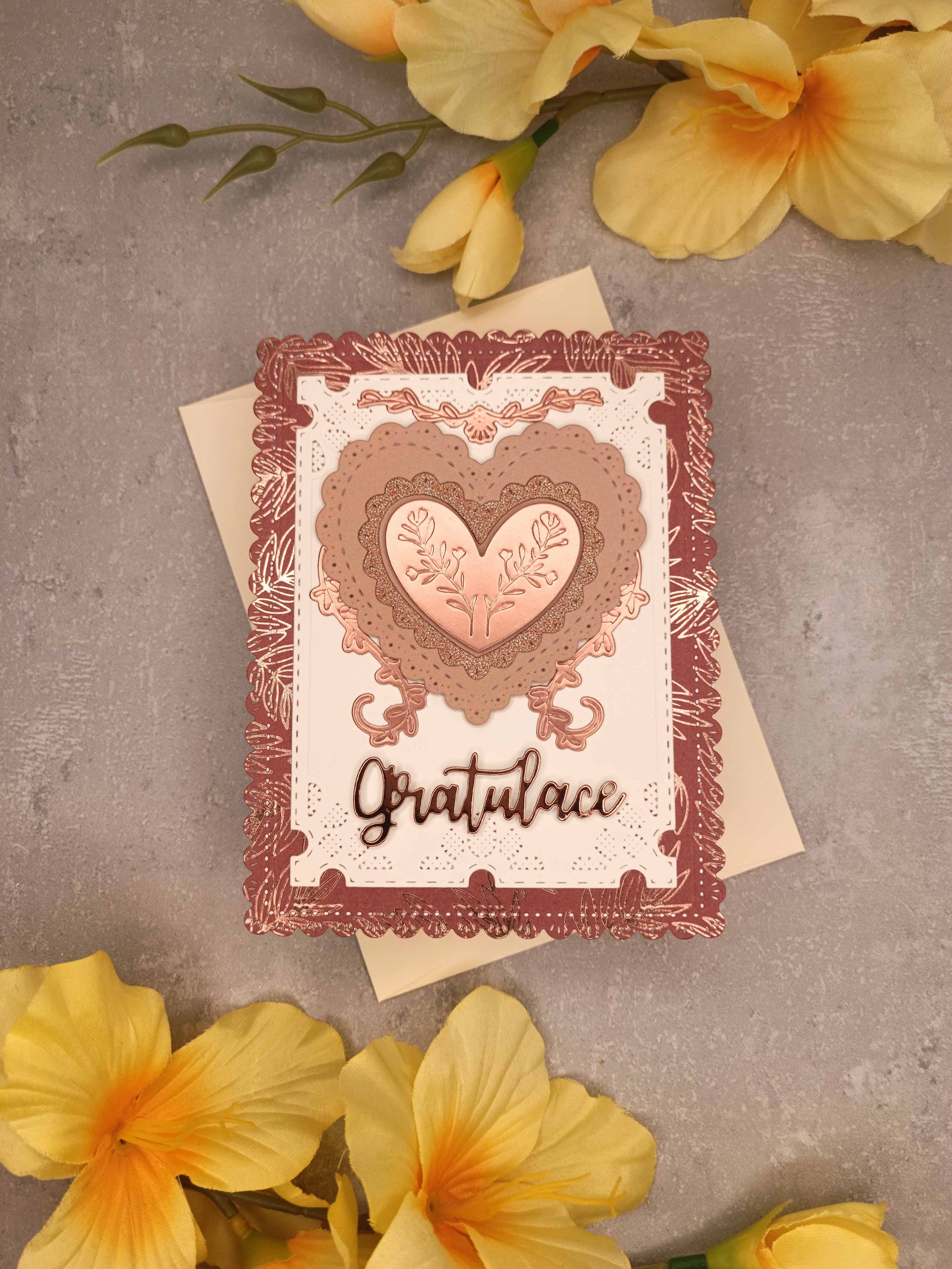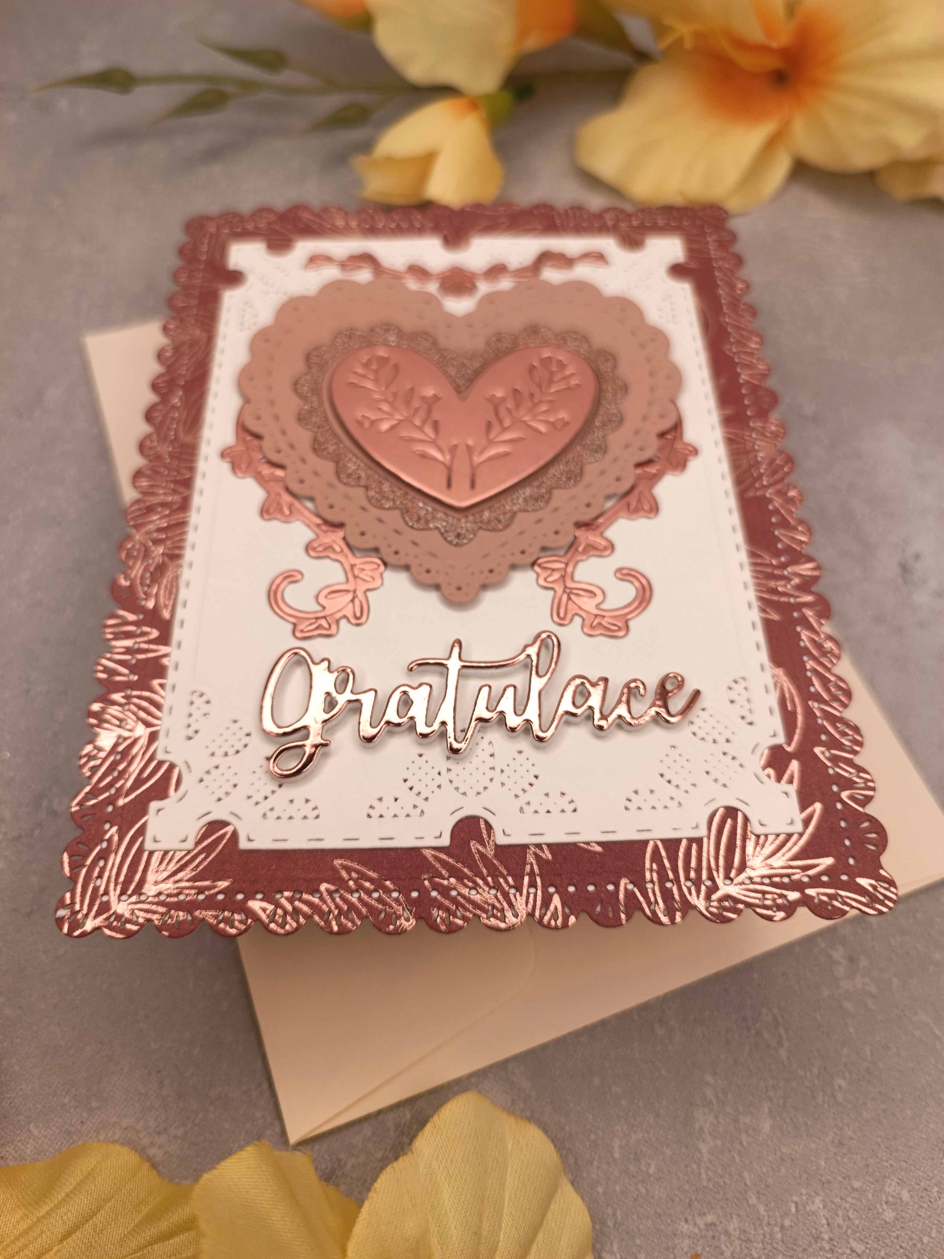 - Přáníčko je zdobeno zlato-růžovými elementy
