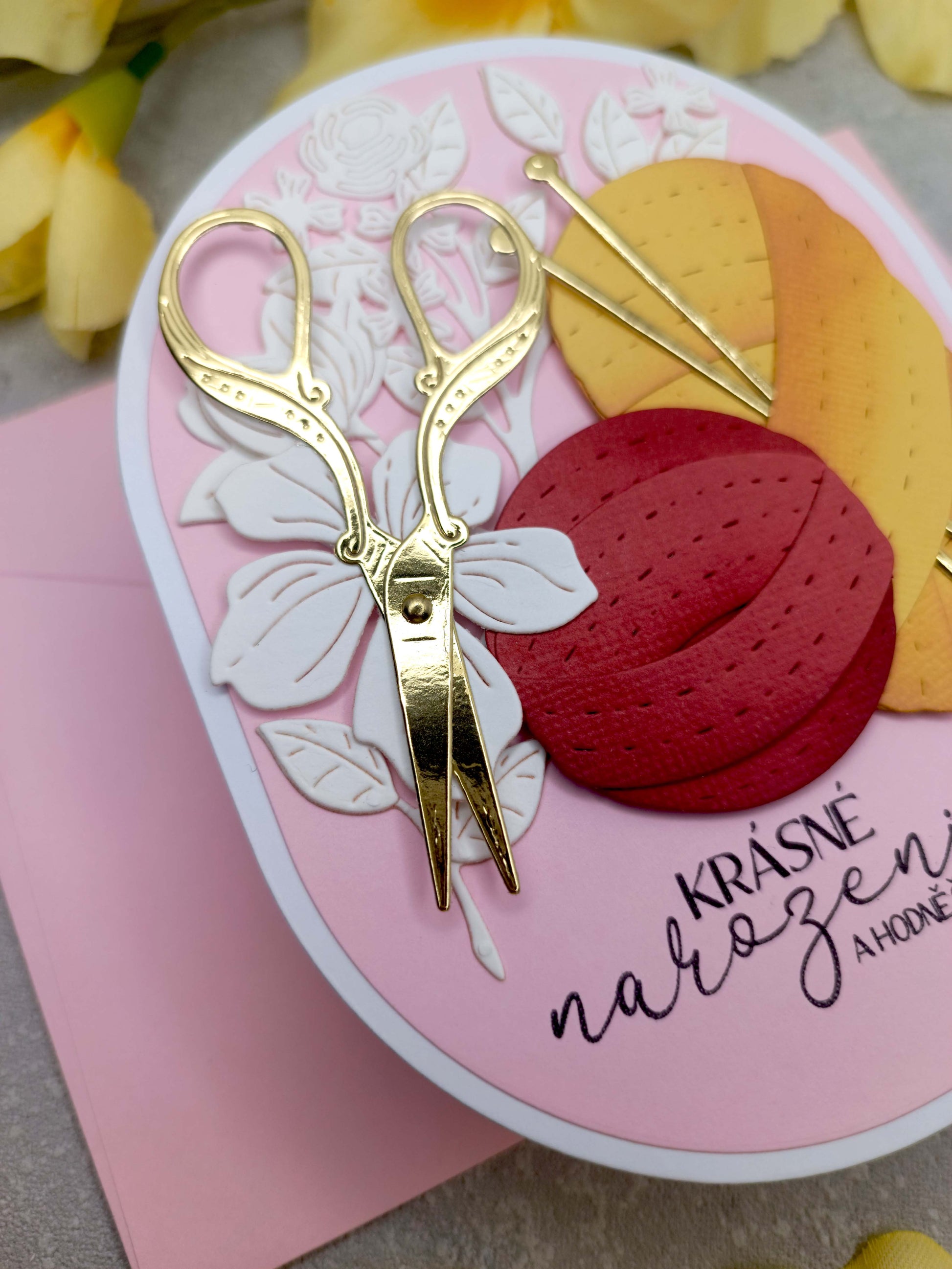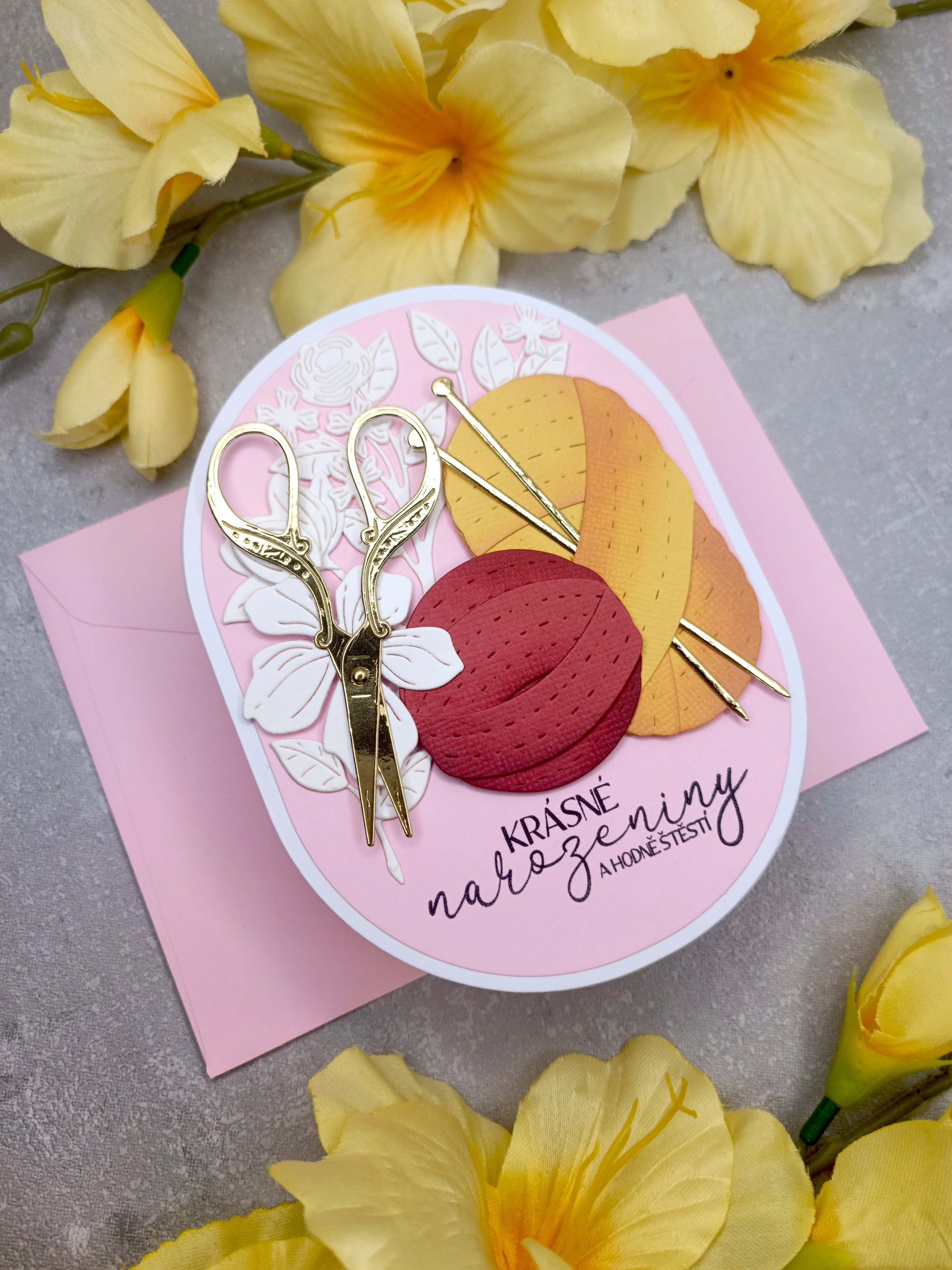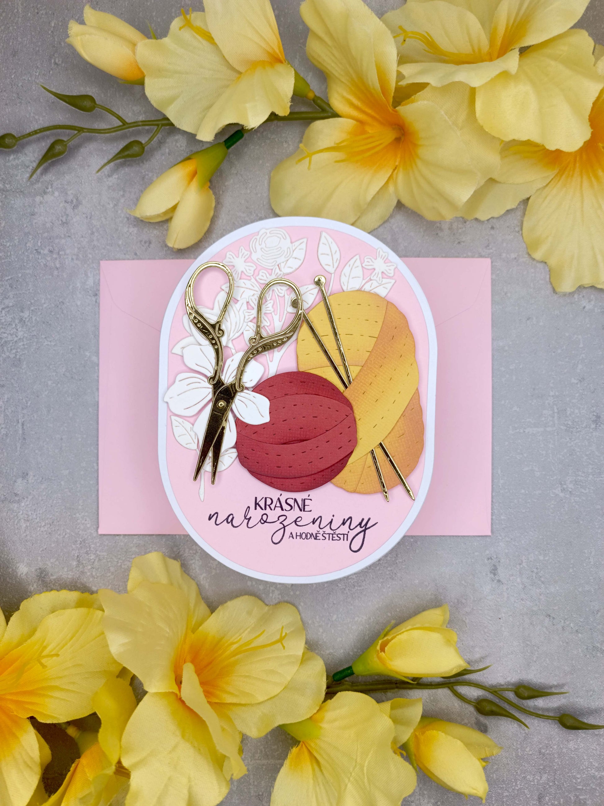 - Přání je v pastelově růžové barvě, zdobeno barevnými klubíčky, zlatými nůžkami, se kterými lze hýbat a jehlicemi