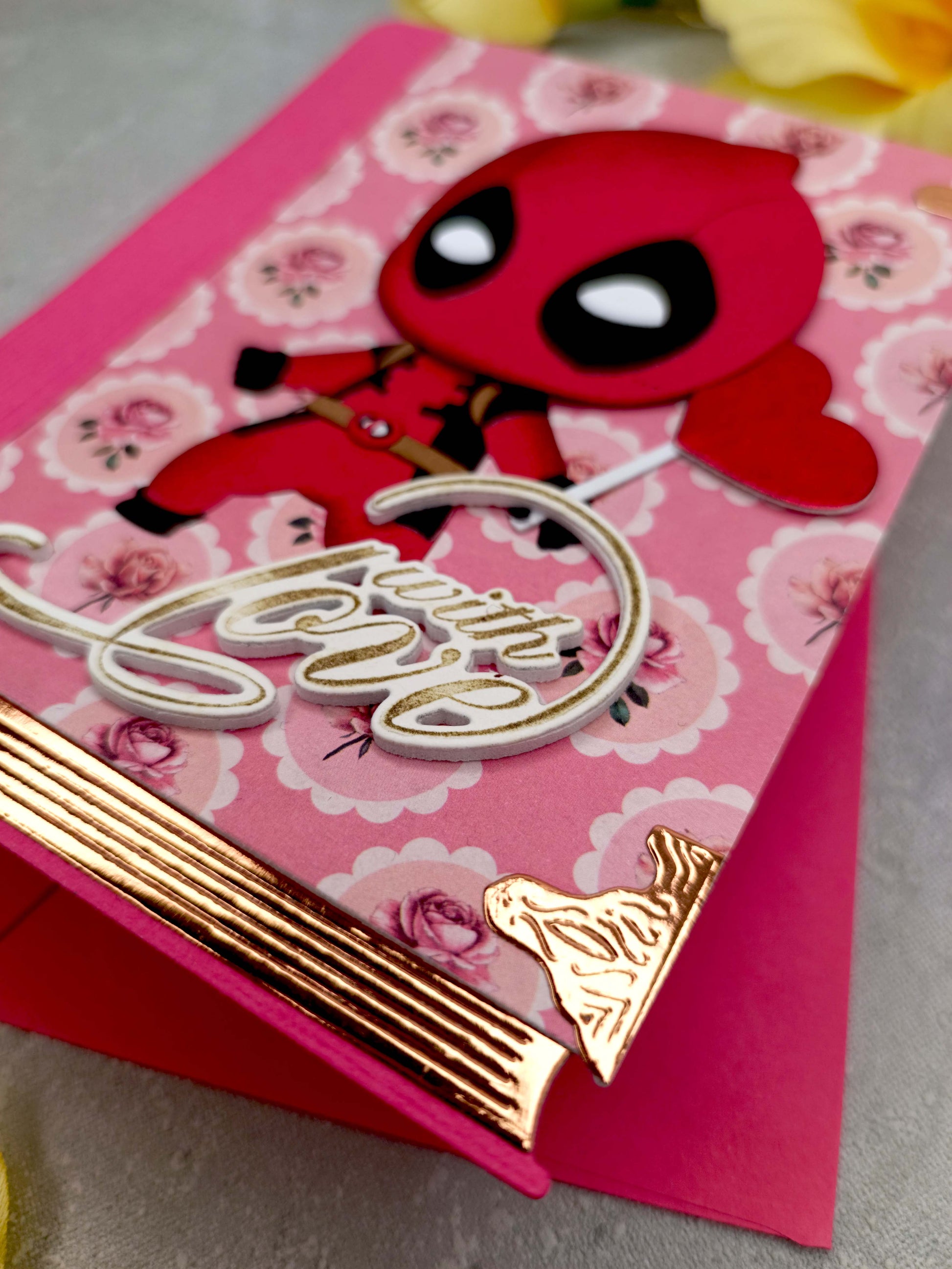 - Přání je ve tvaru knihy a je zdobeno růžovým květnovaným papírem a zlatou ořízkou