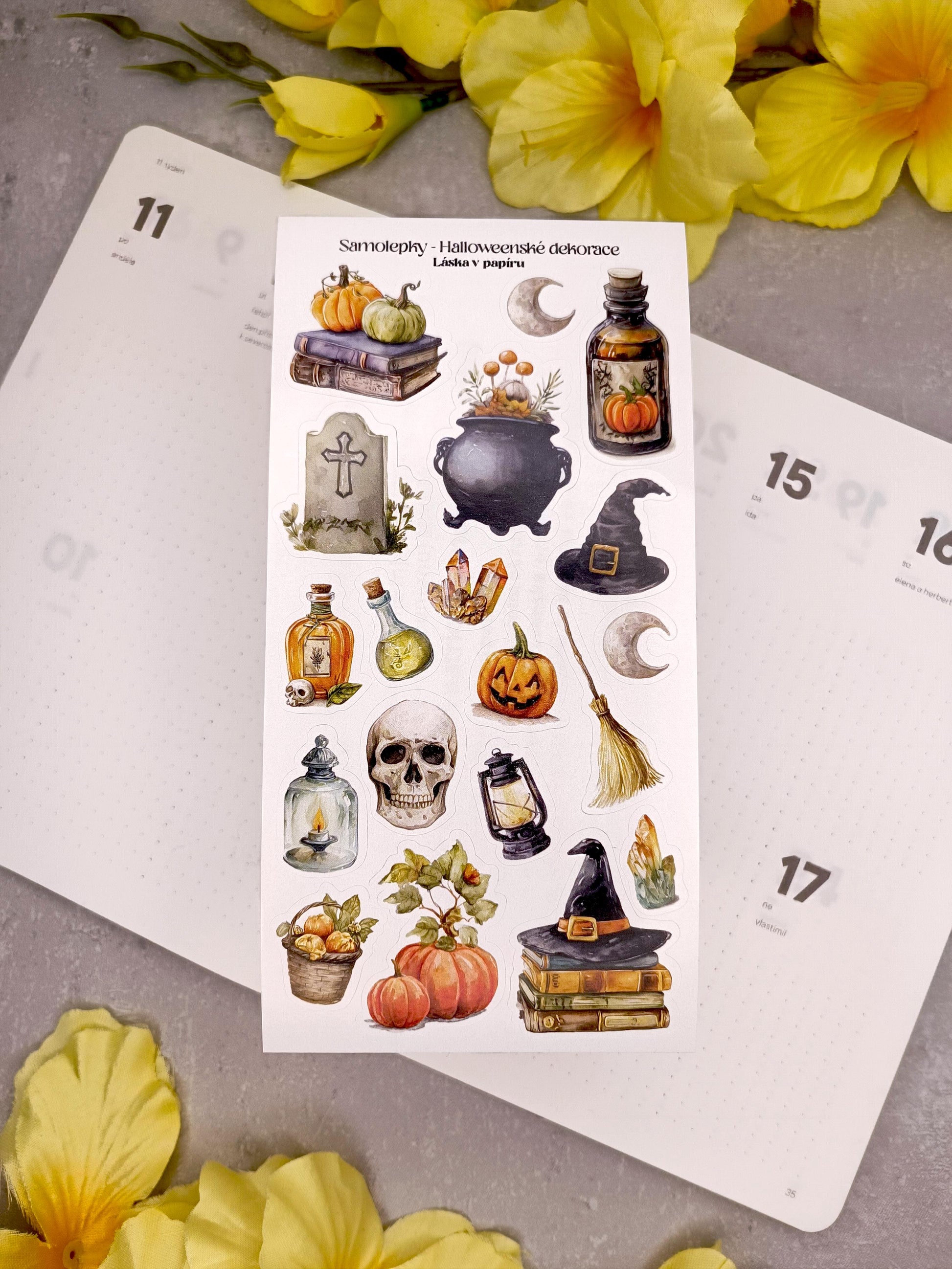 - motiv samolepek - halloween, dýně, lektvary, lebka, kotlík, hrob