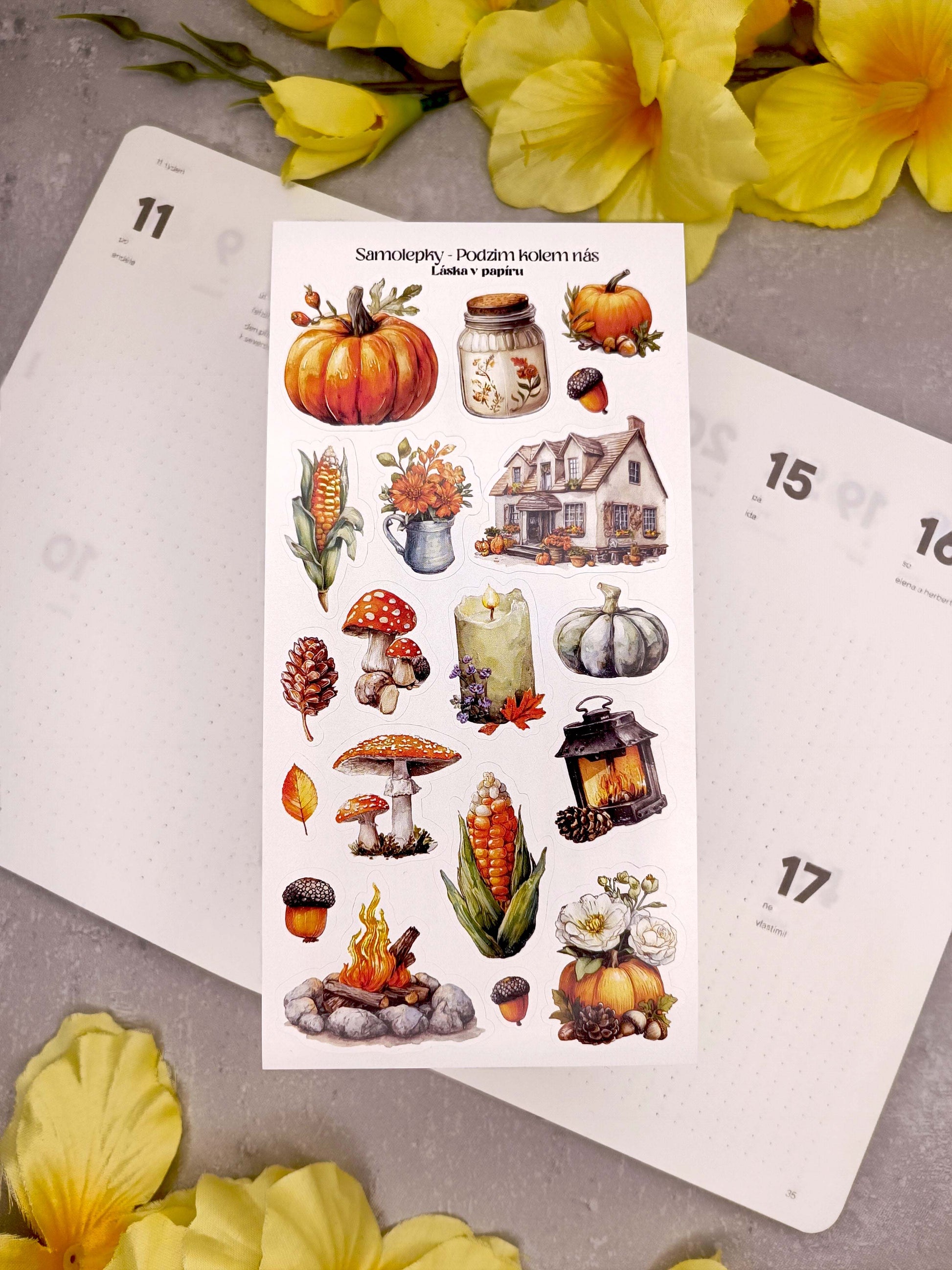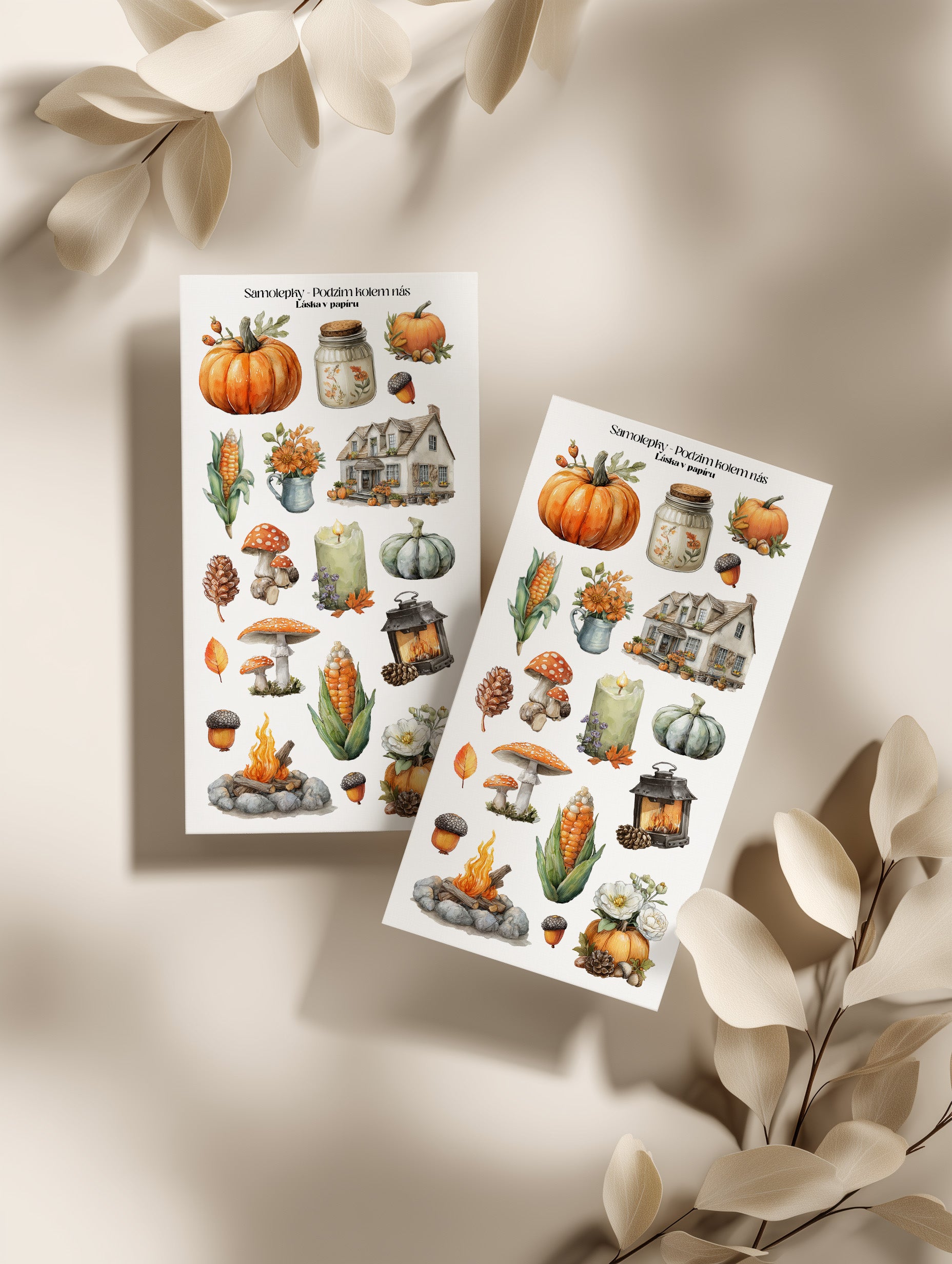 - motiv samolepek - podzimní dekorace, táborák, dýně, kukuřice, svíčka, žalud, chaloupka, houby
