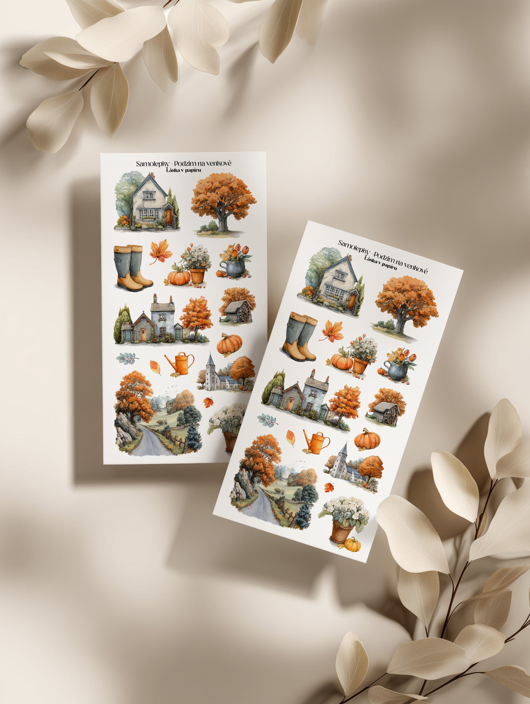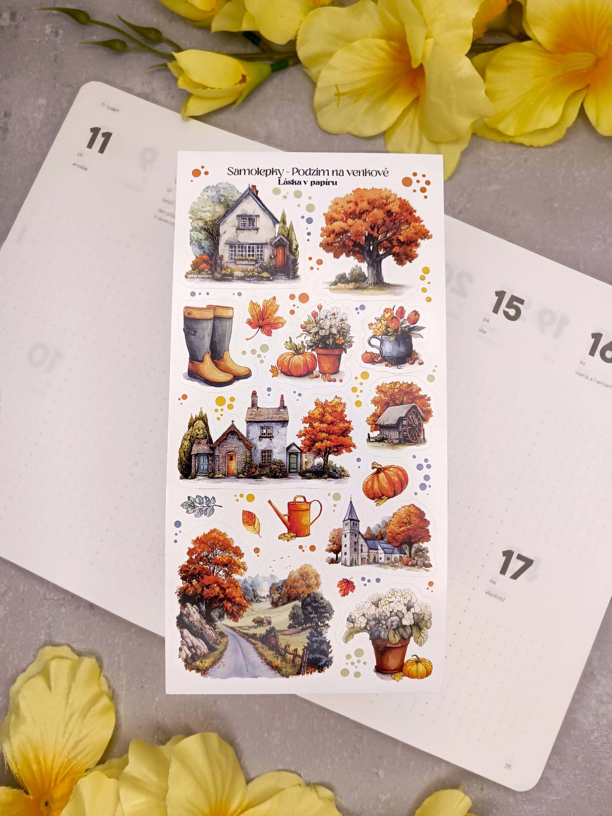 - motiv samolepek - podzim na venkově, podzimní stromy a listy, podzimní krajina, budovy
