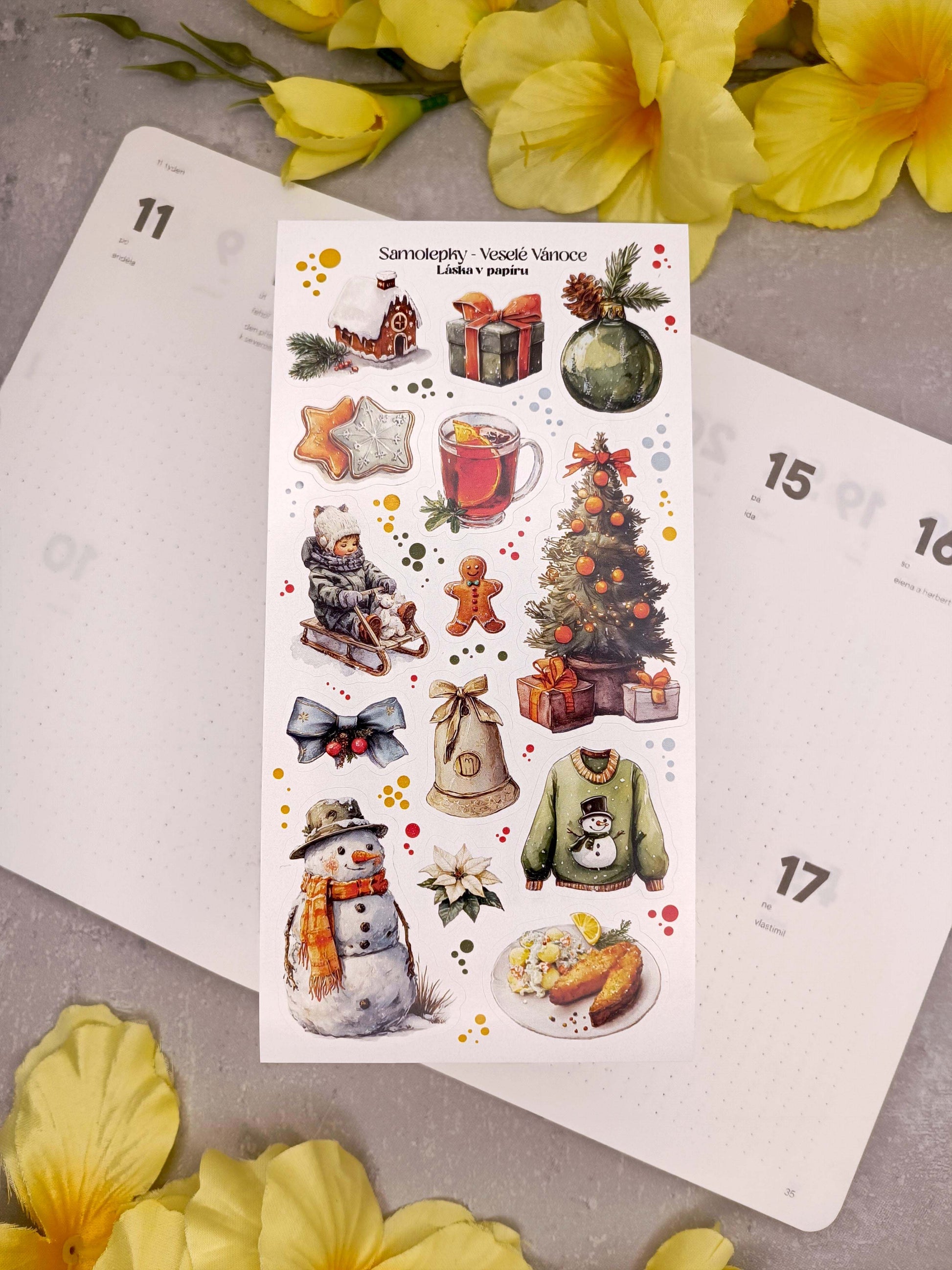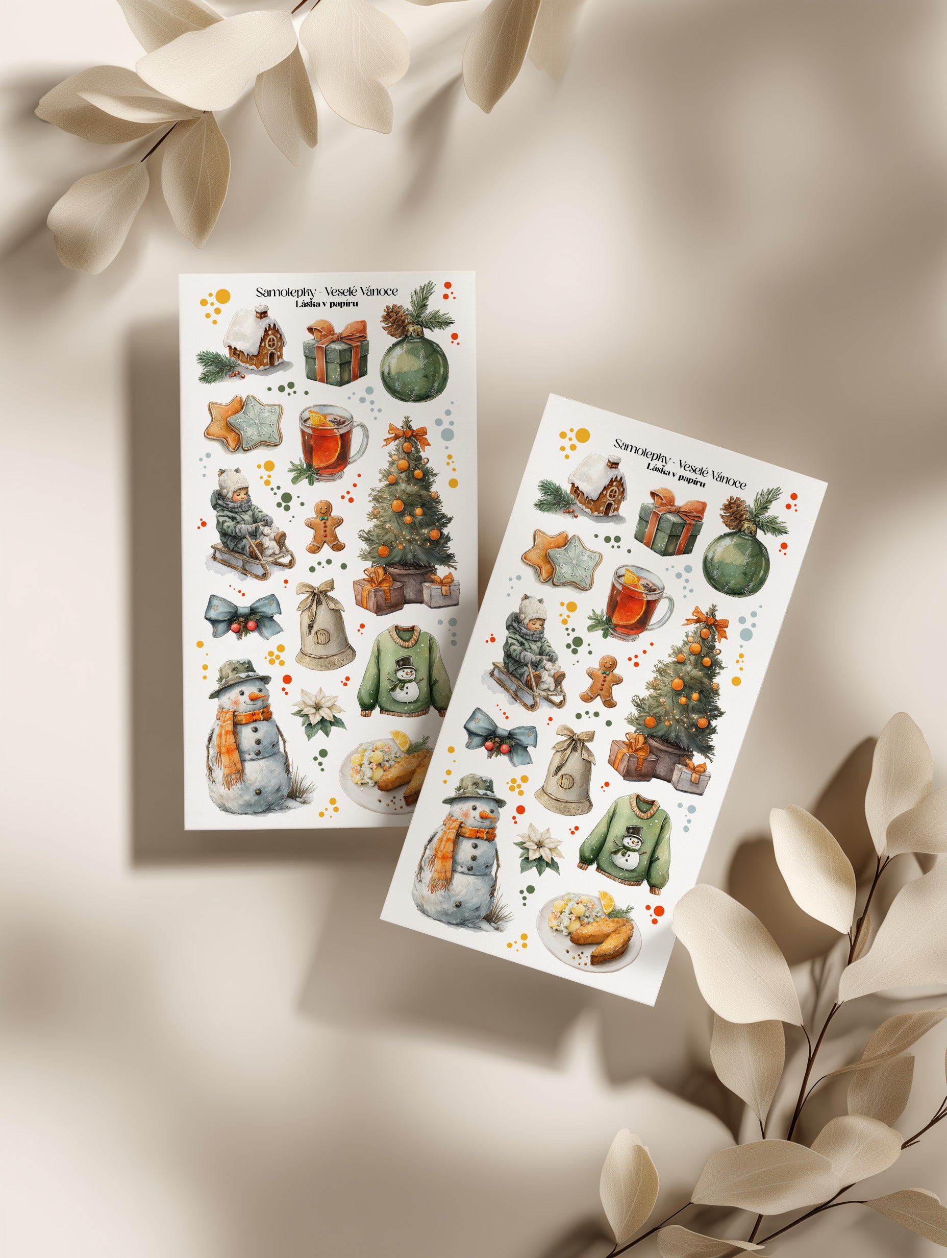 - motiv samolepek - vánoční ozdoby, baňka, cukroví, sněhulák, dárek, stromeček, kapr