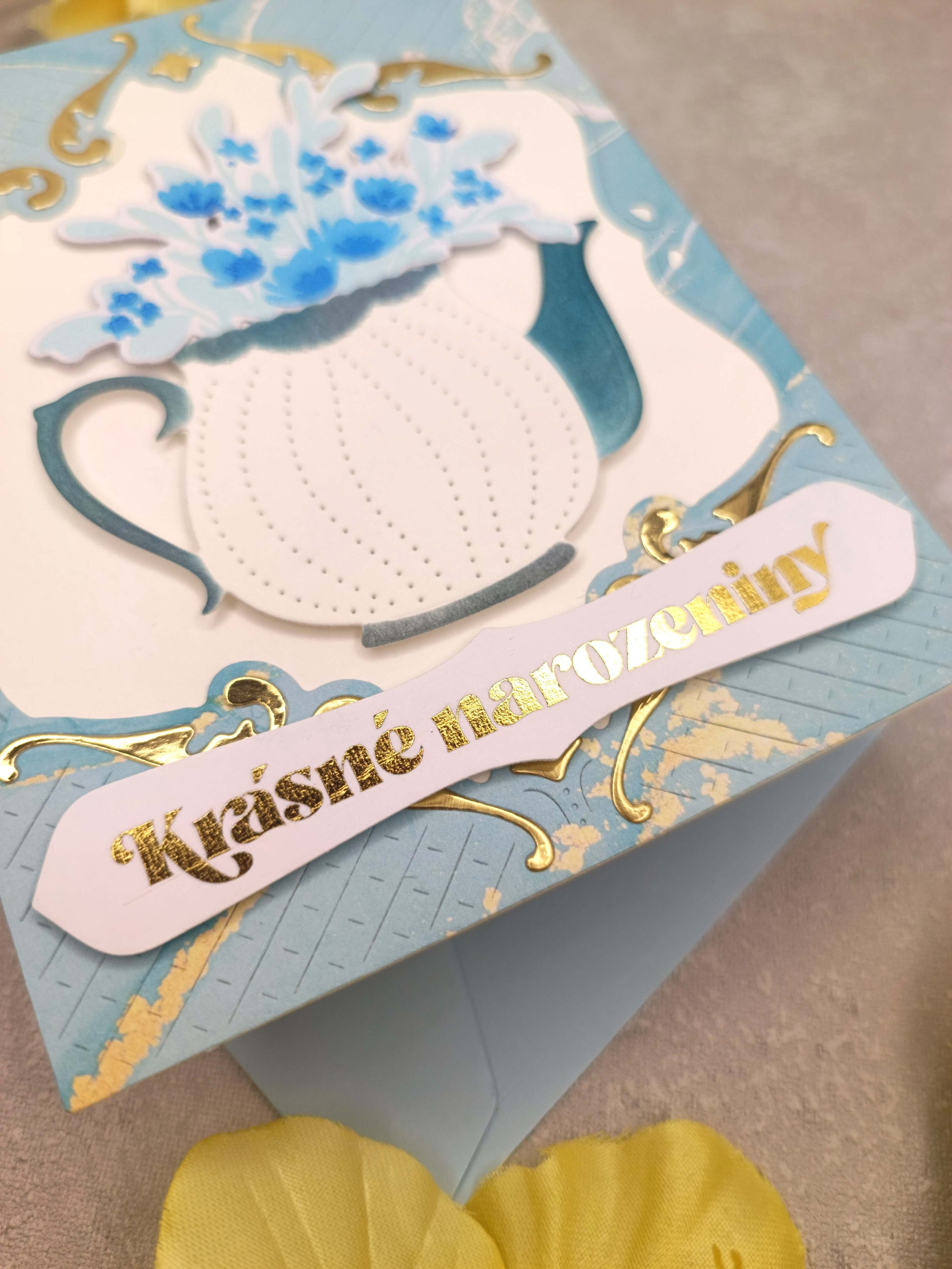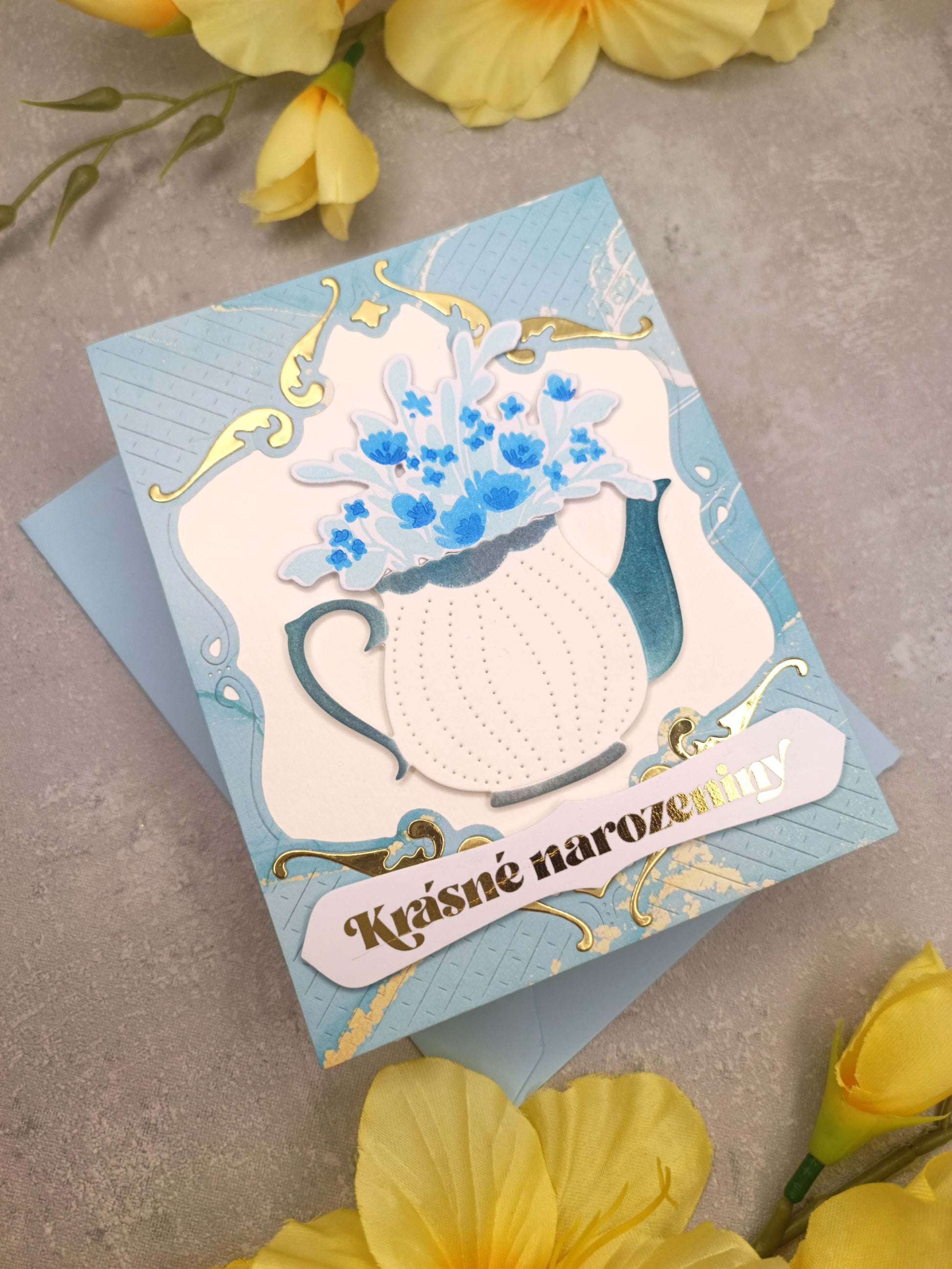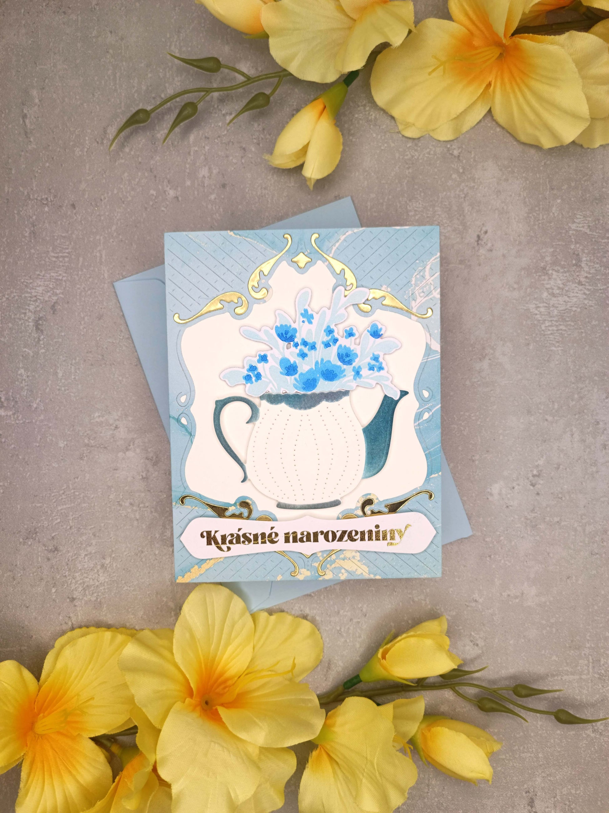 Světle modré narozeninové přání s konvičkou