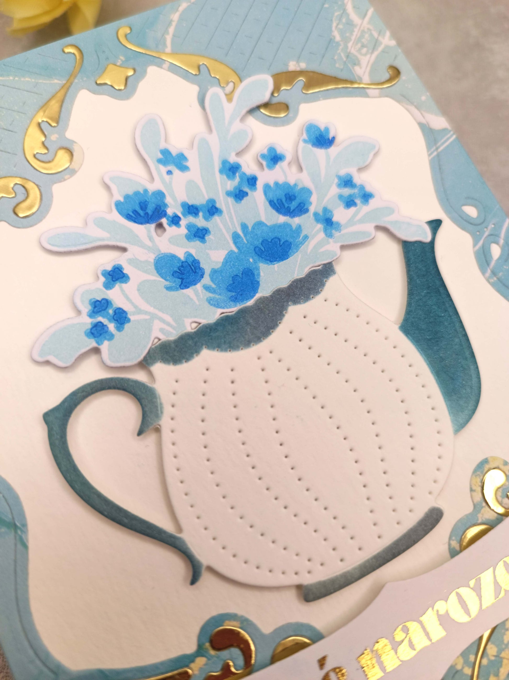 - Přáníčko je zdobeno zlatými elementy a zlatým nápisem