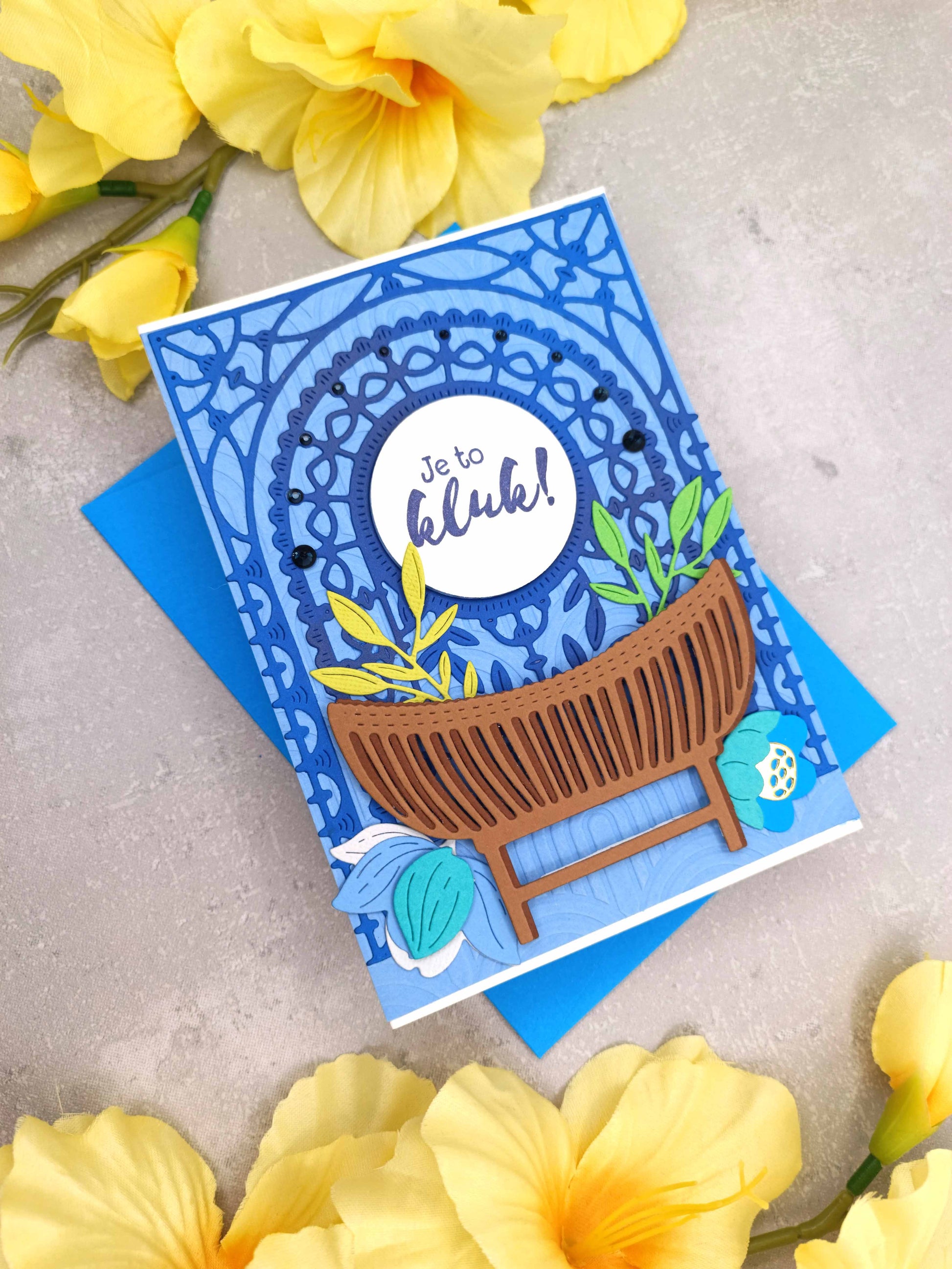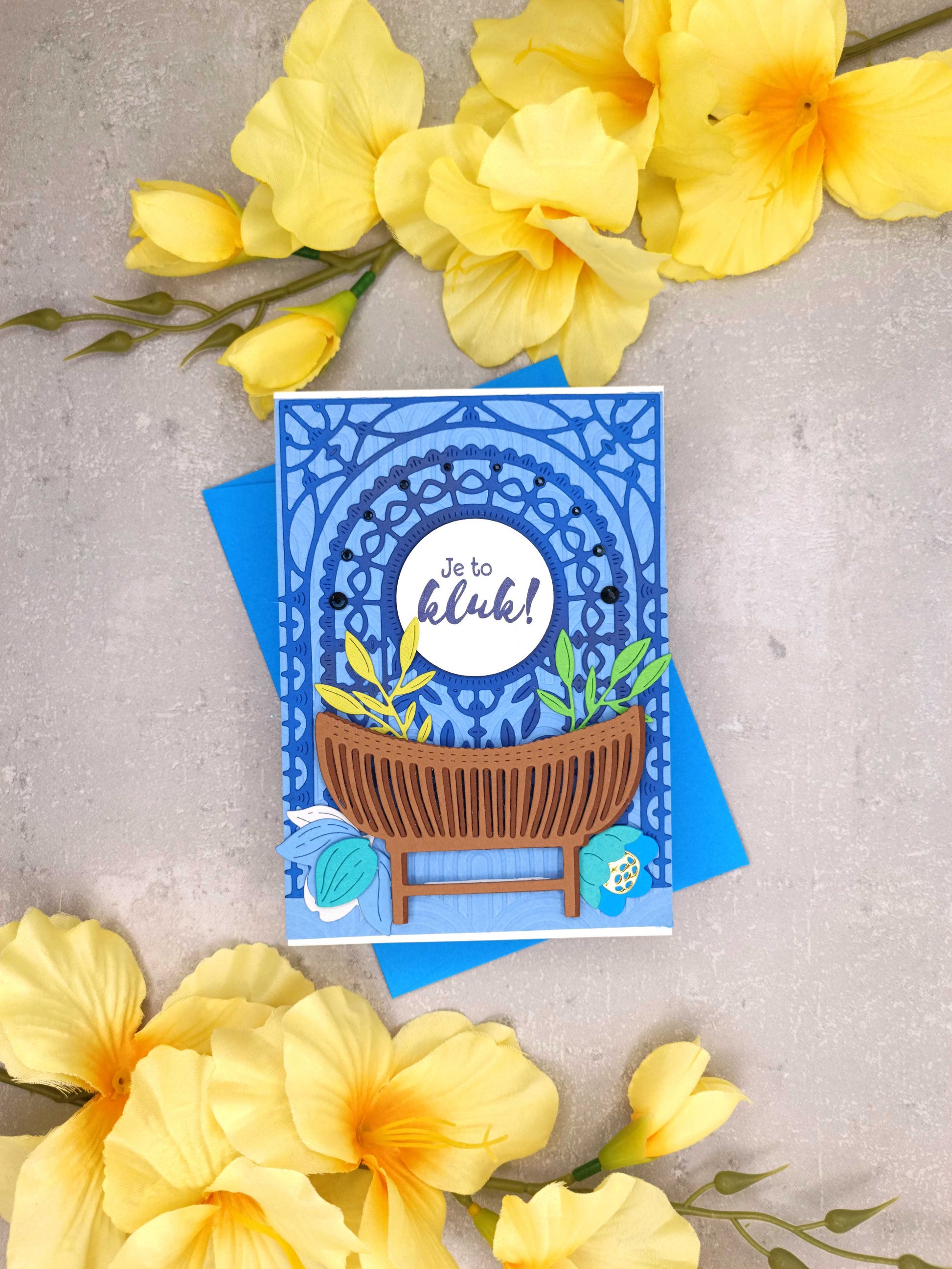 - Přání je laděno do tmavě modrých barev a zdobí ho postýlka a krásný modrý oblouk v pozadí. Nápis na přáníčku je tmavě modrý.