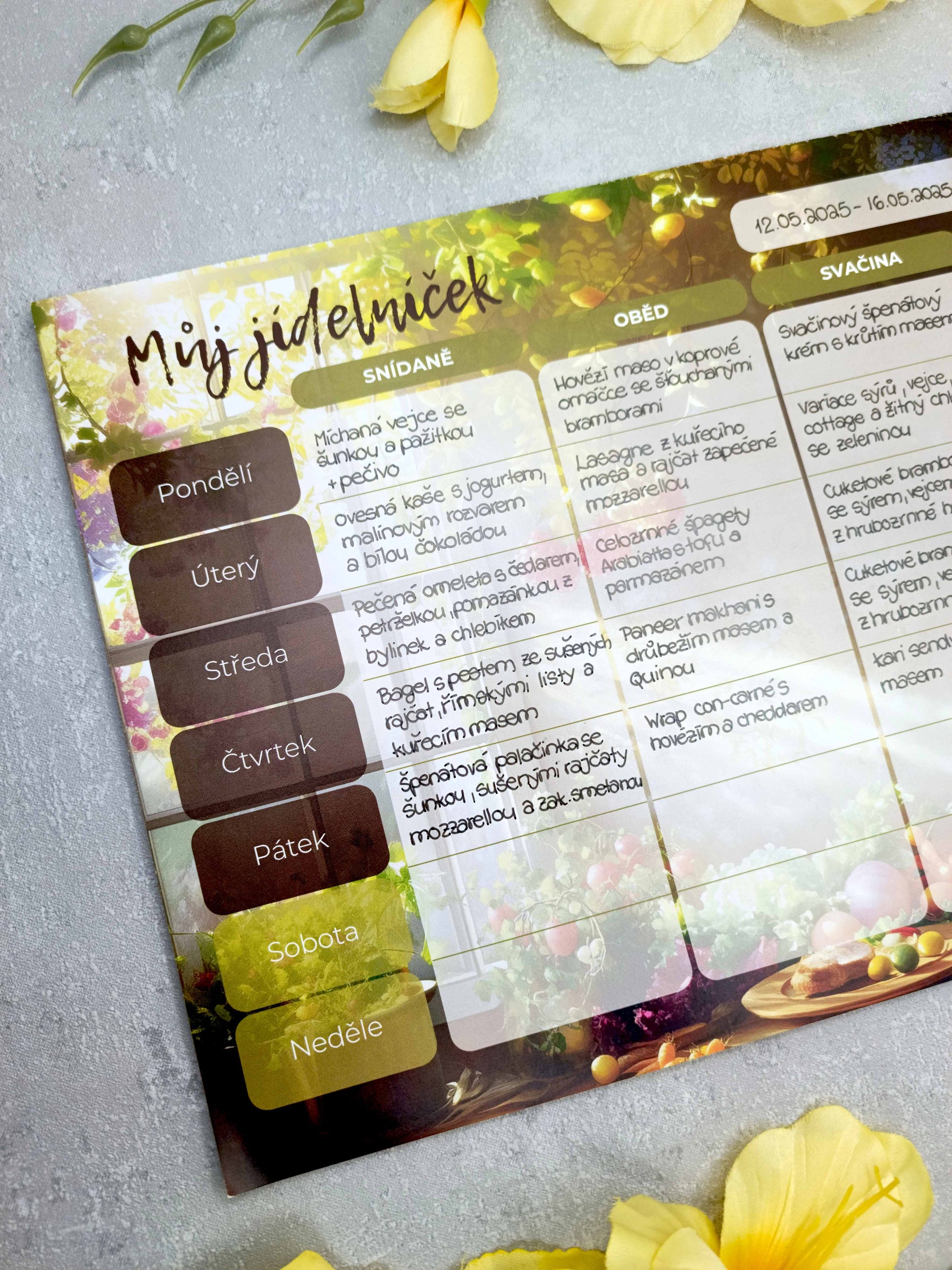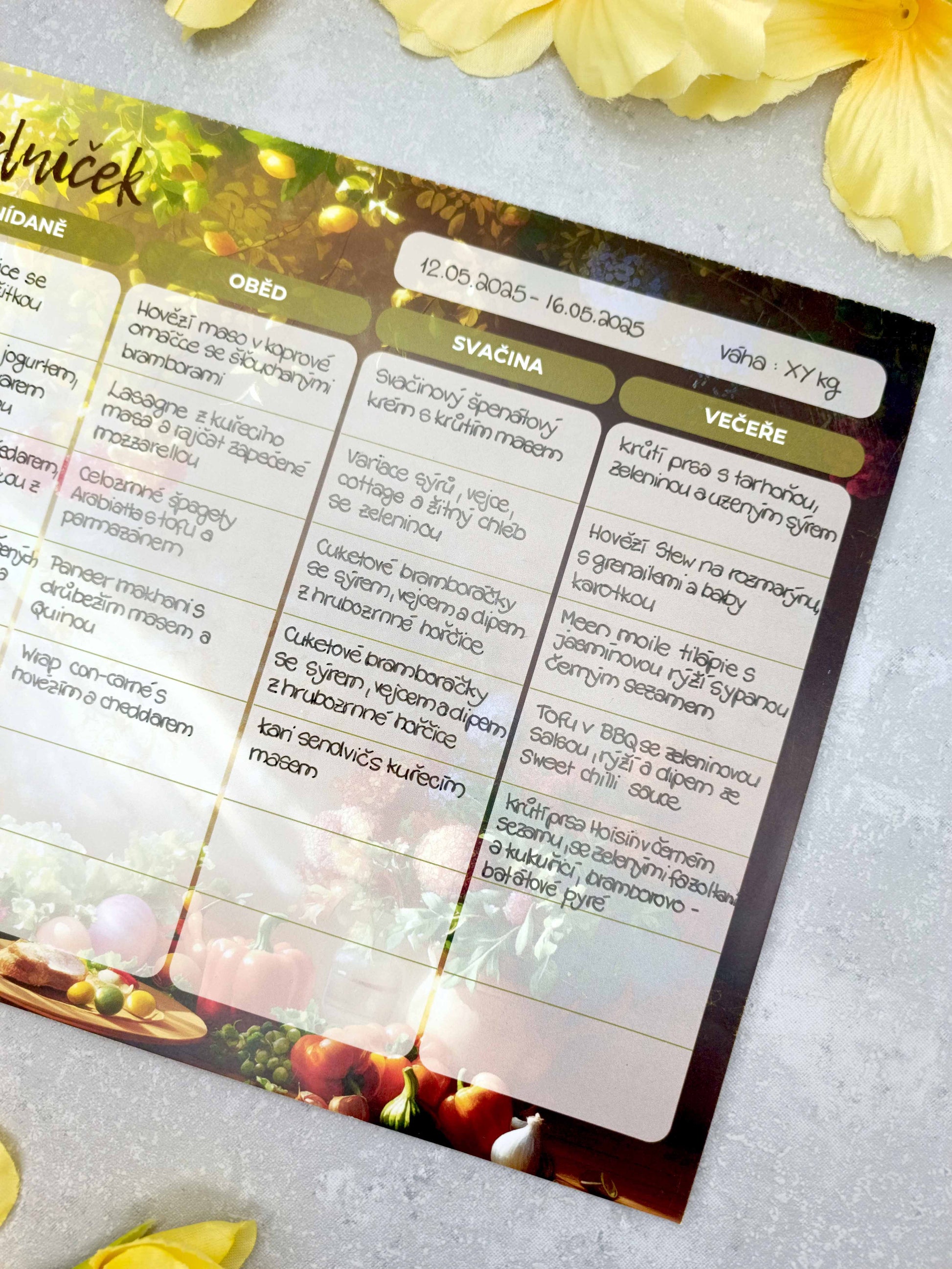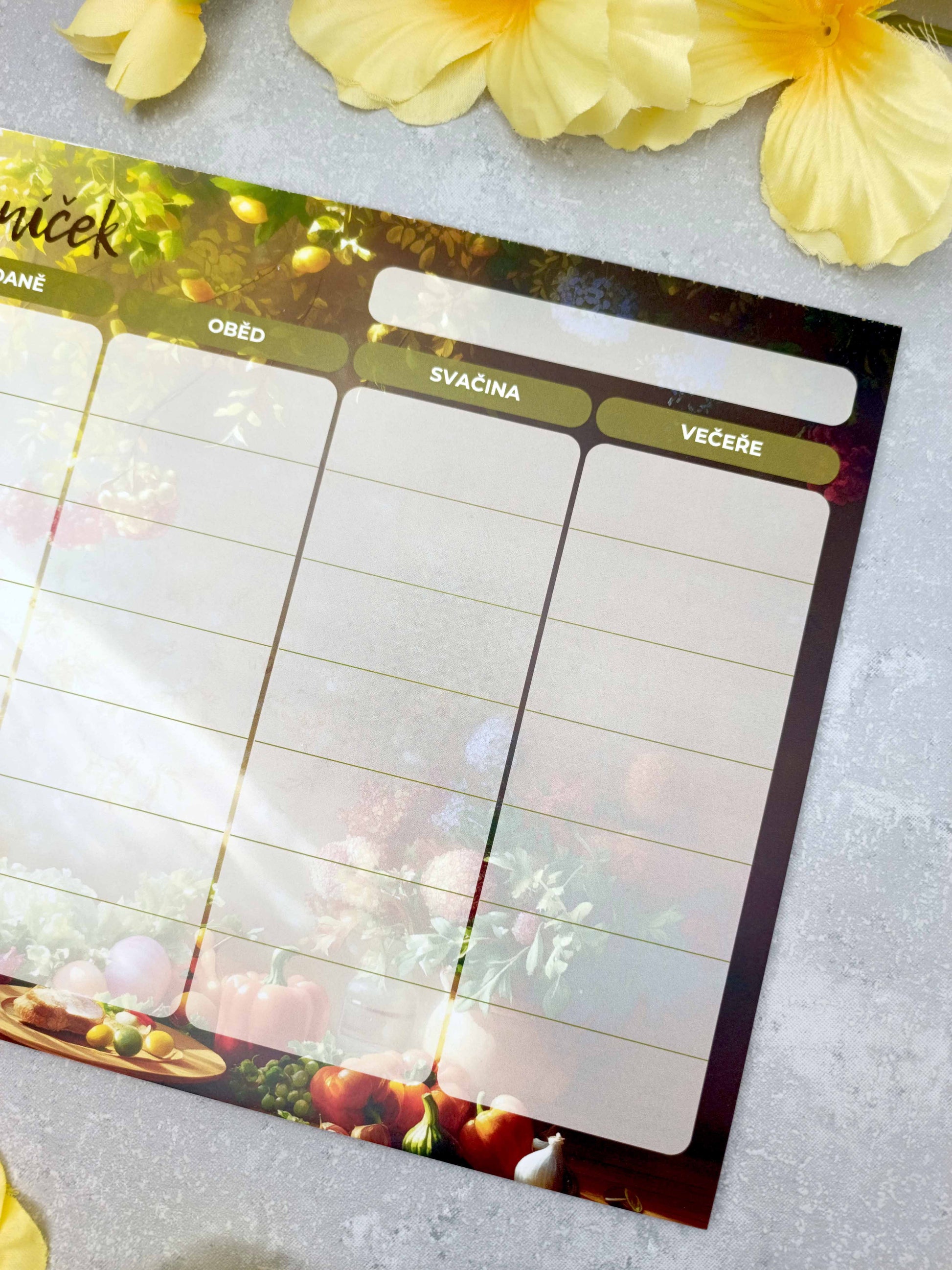 Už žádné přemýšlení „co dnes uvařit“. Tento týdenní plánovač jídel vám pomůže mít celý jídelníček přehledně na jednom místě – a s radostí plánovat zdravěji, pestřeji i klidněji.