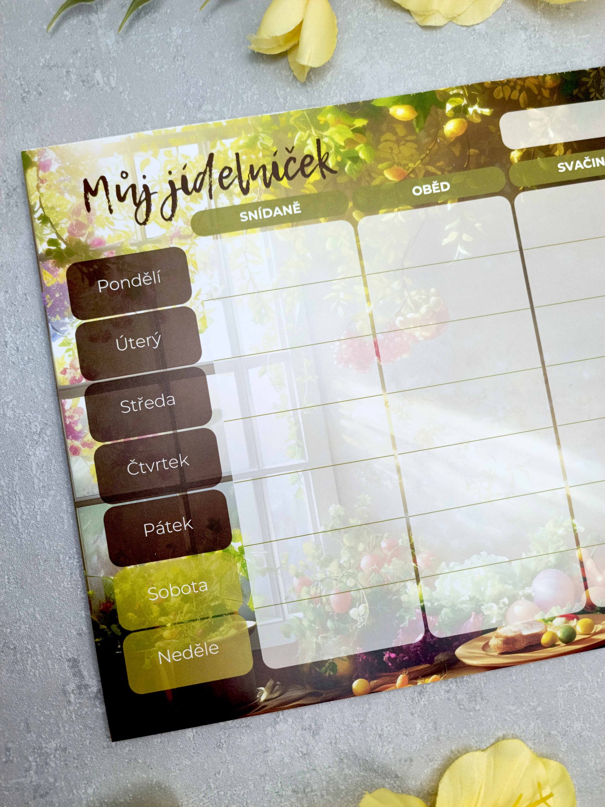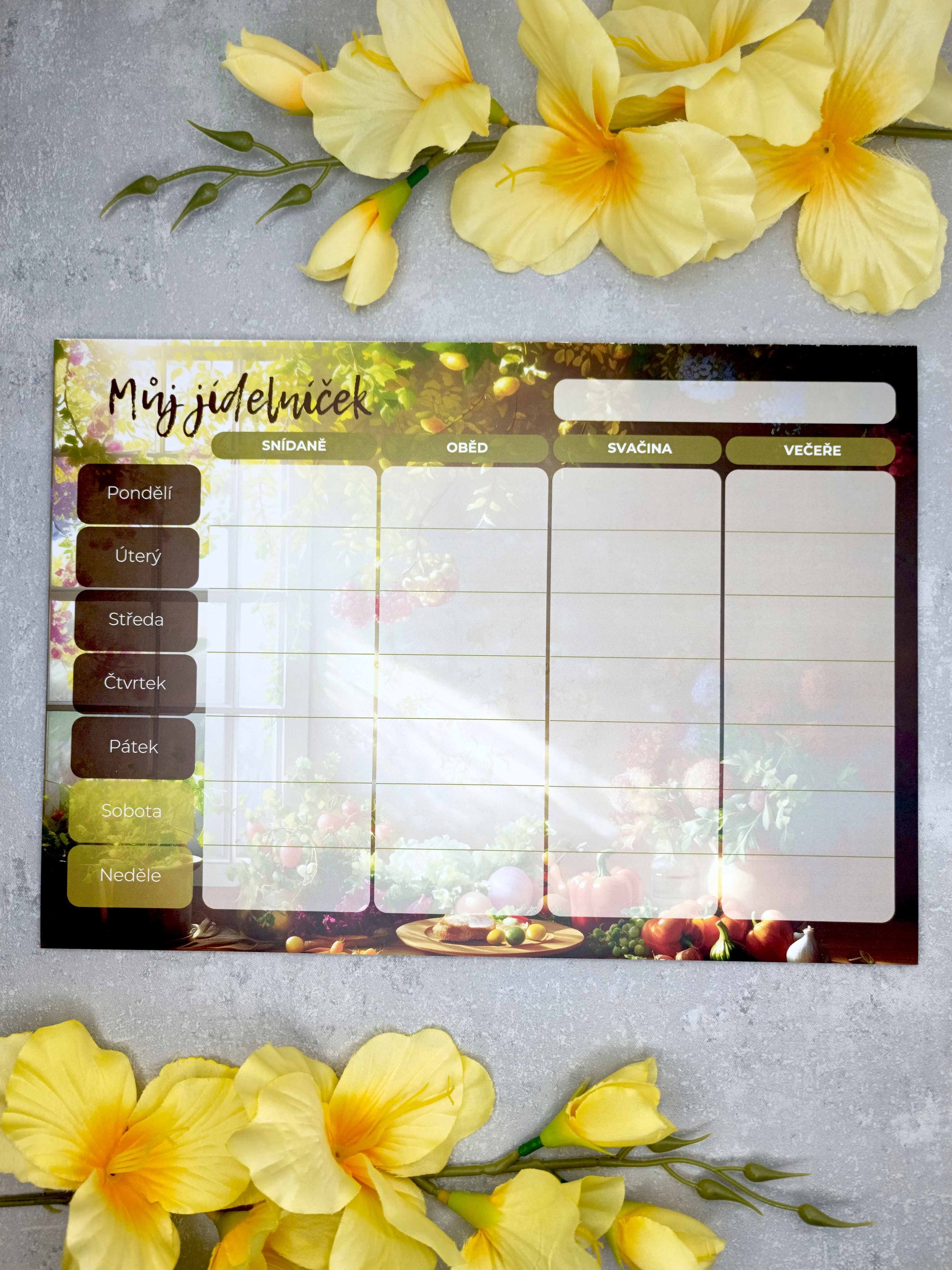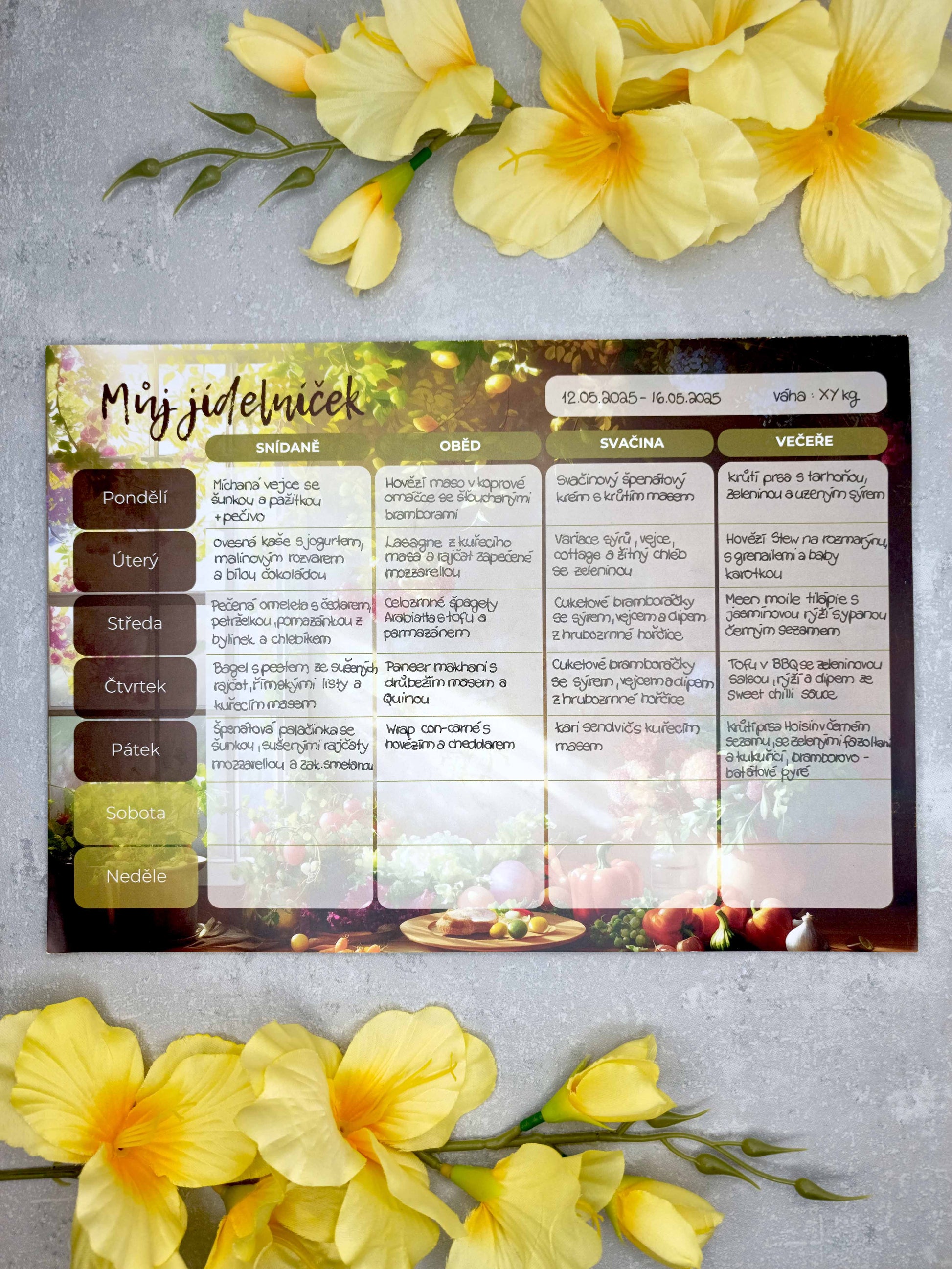 Už žádné přemýšlení „co dnes uvařit“. Tento týdenní plánovač jídel vám pomůže mít celý jídelníček přehledně na jednom místě – a s radostí plánovat zdravěji, pestřeji i klidněji.