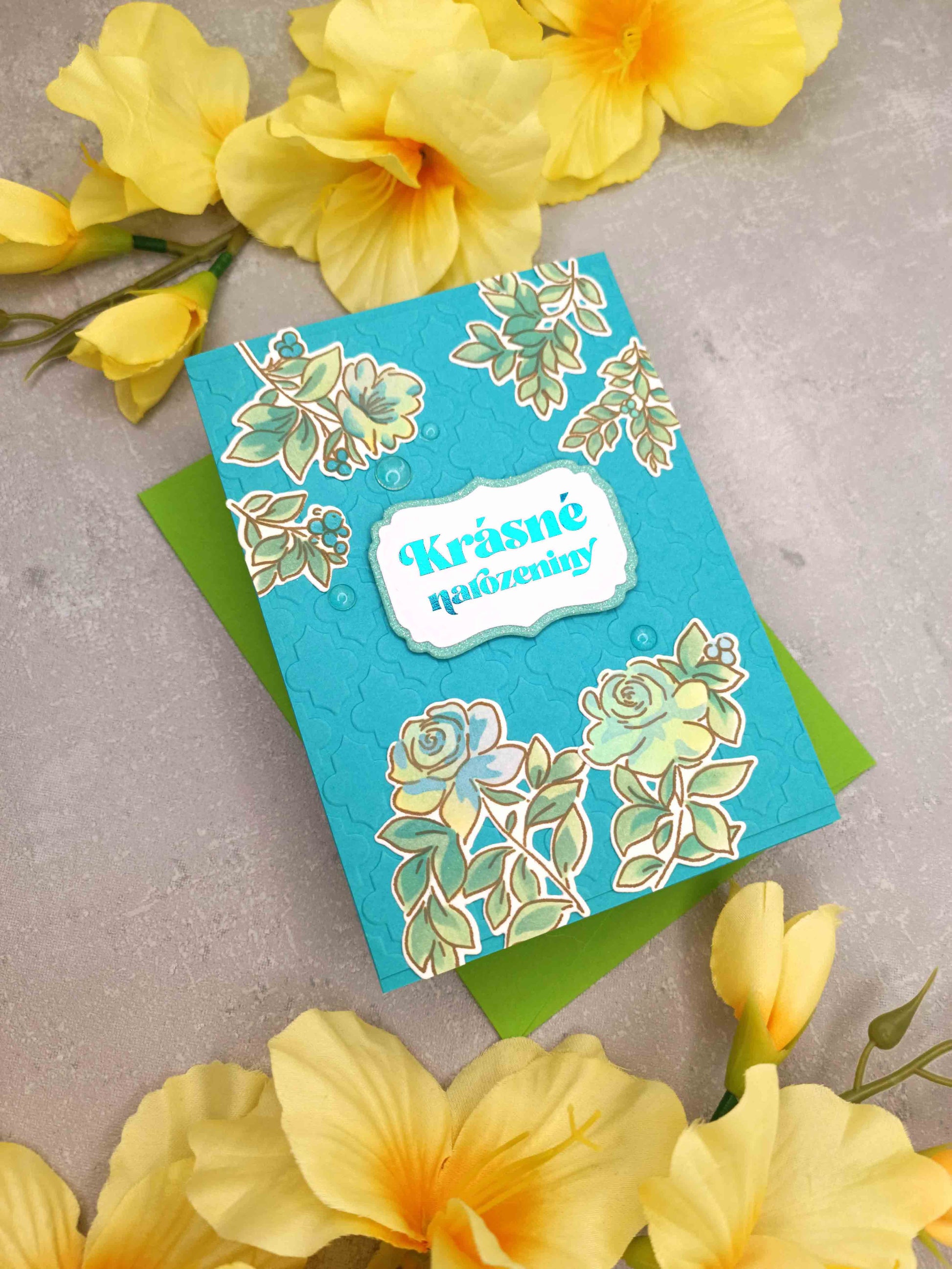 Tyrkysové narozeninové přání s květinami a metalickým nápisem