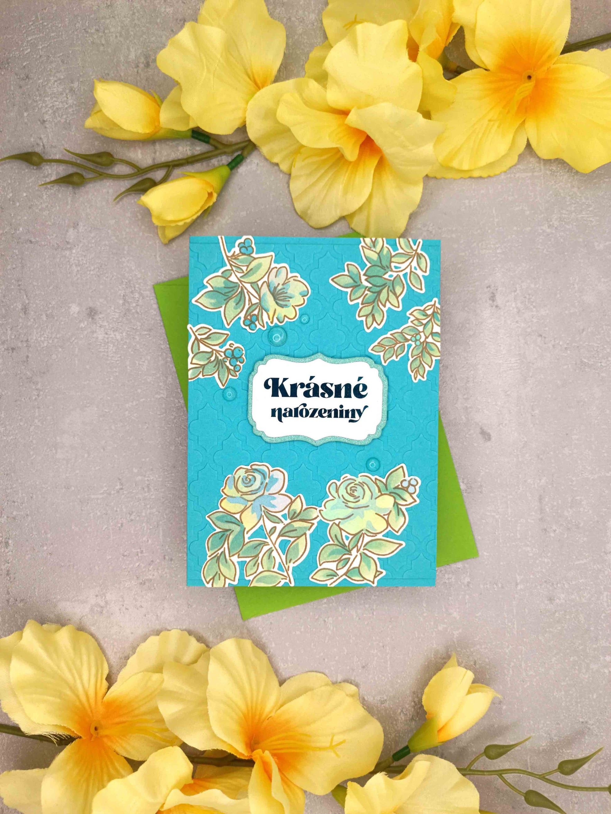 - Přání je tyrkysové a zdobeno růžemi a větvičkami v tyrkysovo-zelených barvách. Text na přední straně je tyrkysový metalický