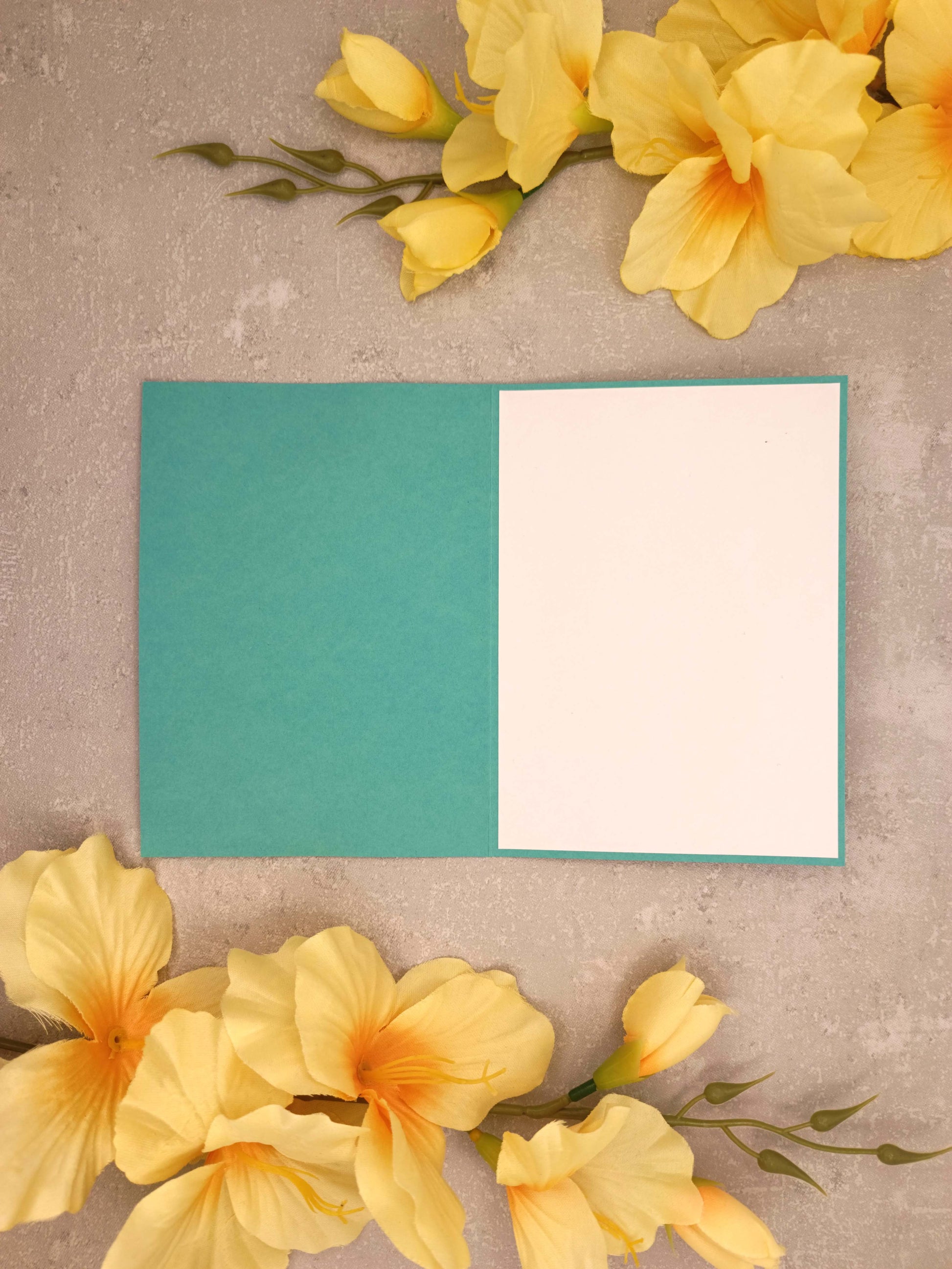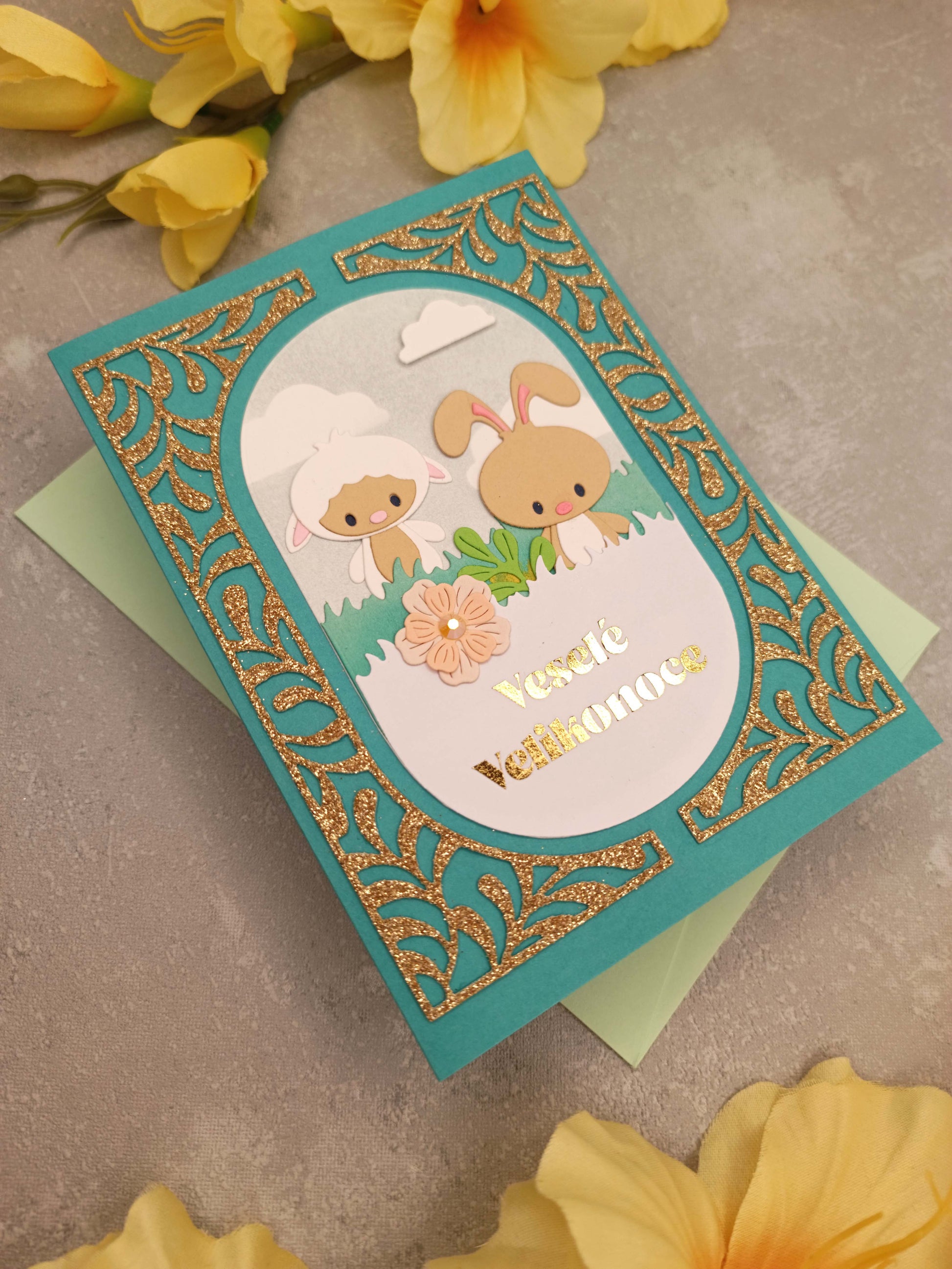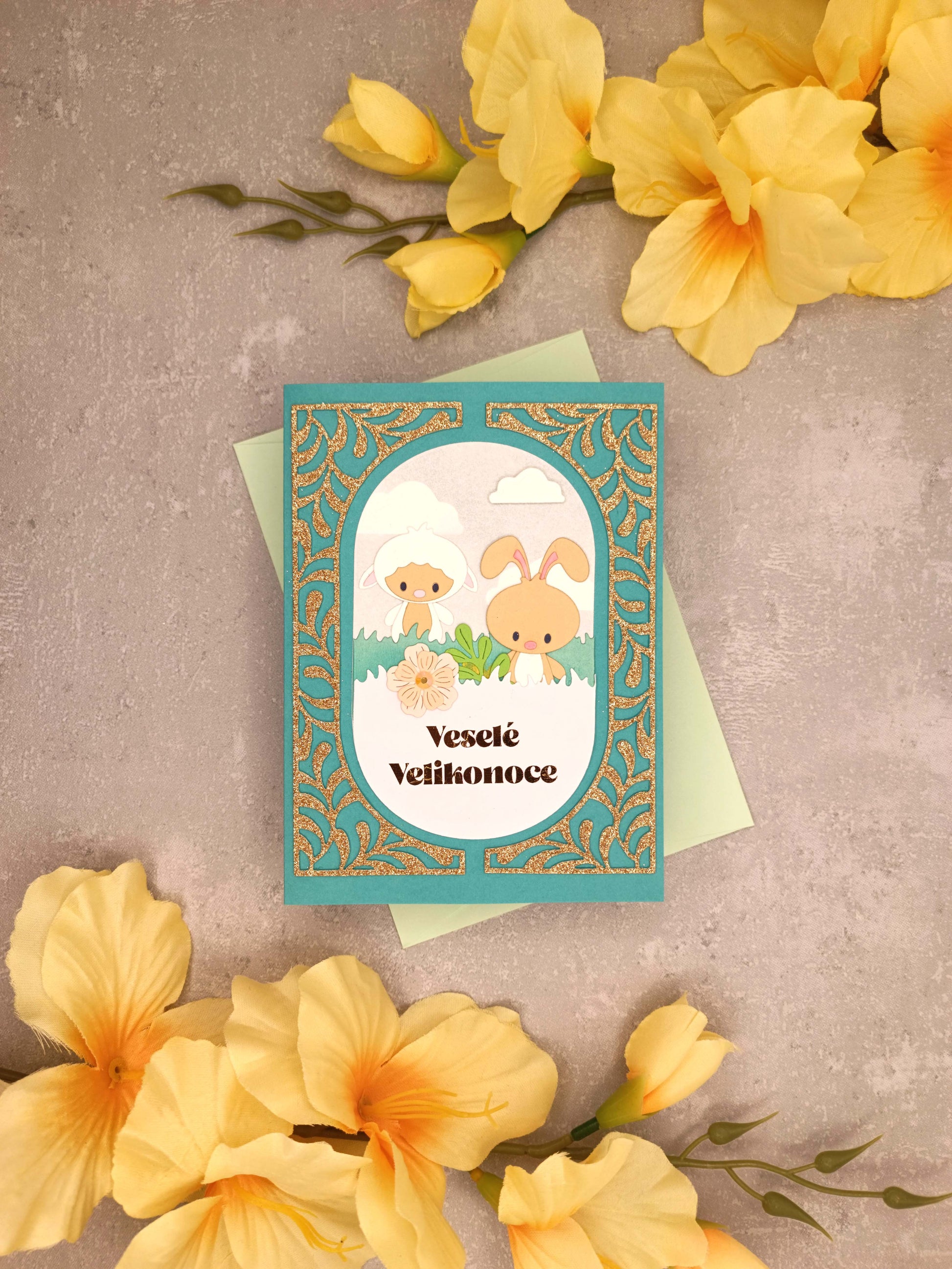 Tyrkysové velikonoční přání se zajíčkem a beránkem