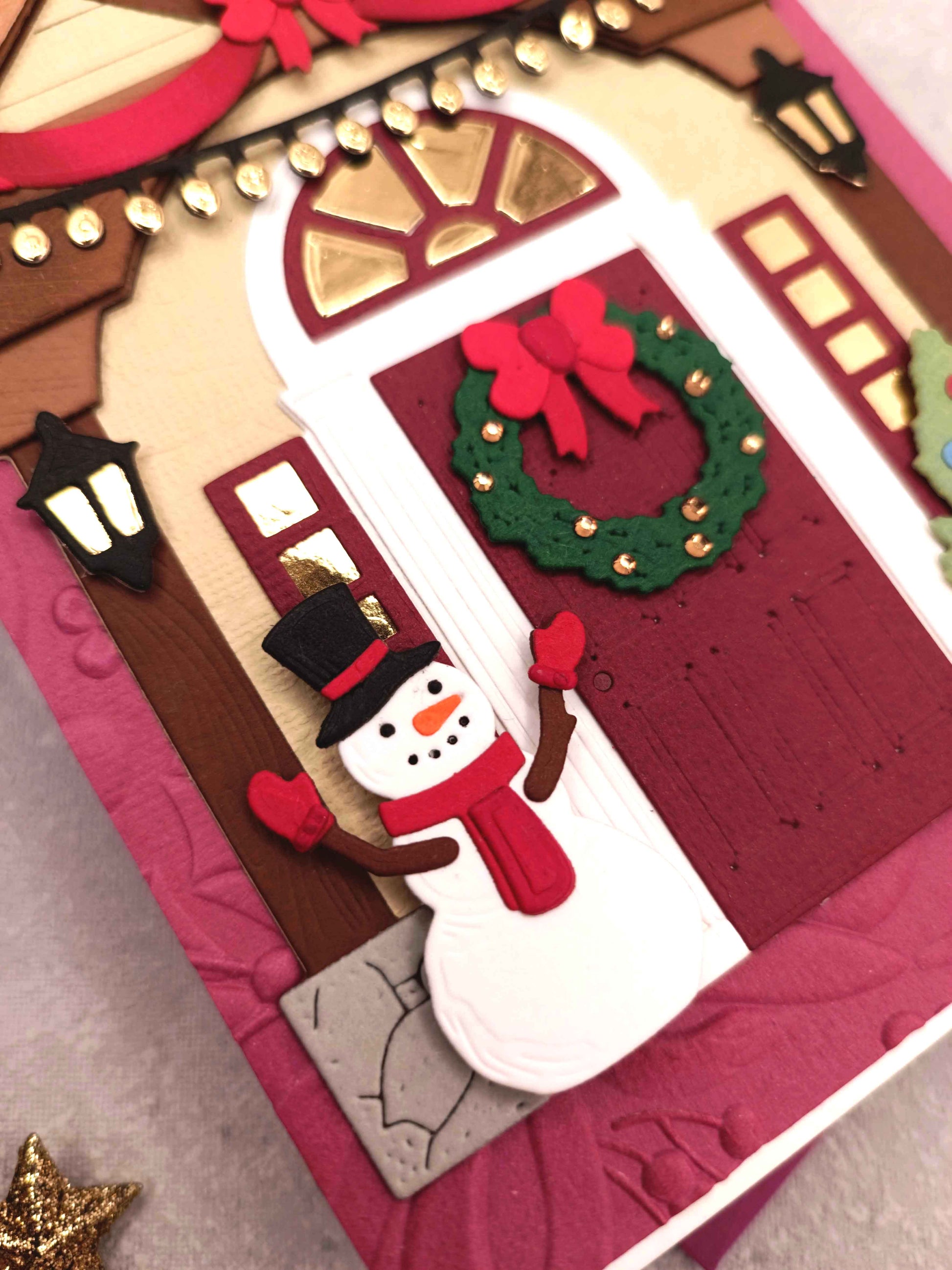 - Ručně vyrobené vánoční přání s chaloupkou a sněhulákem