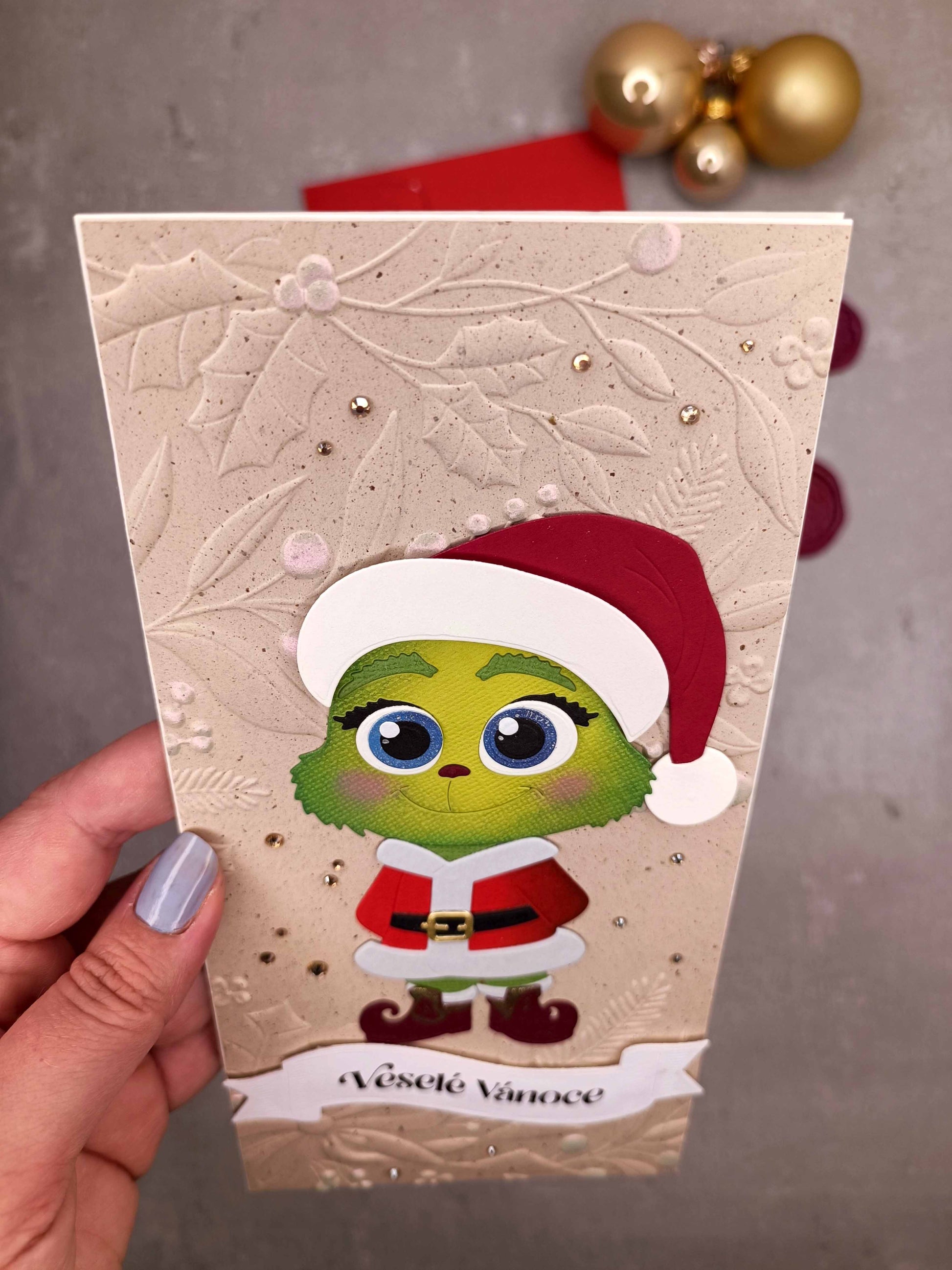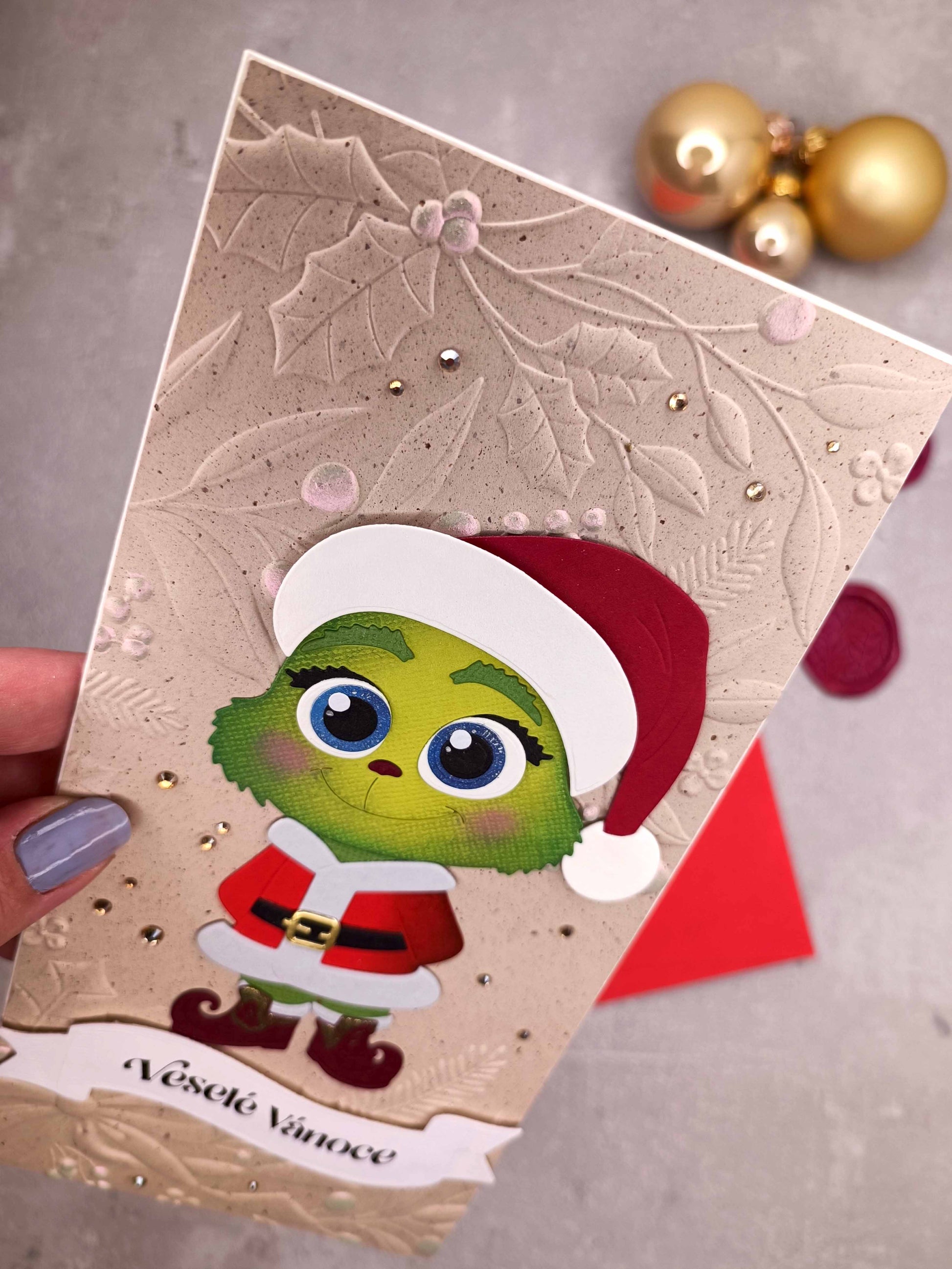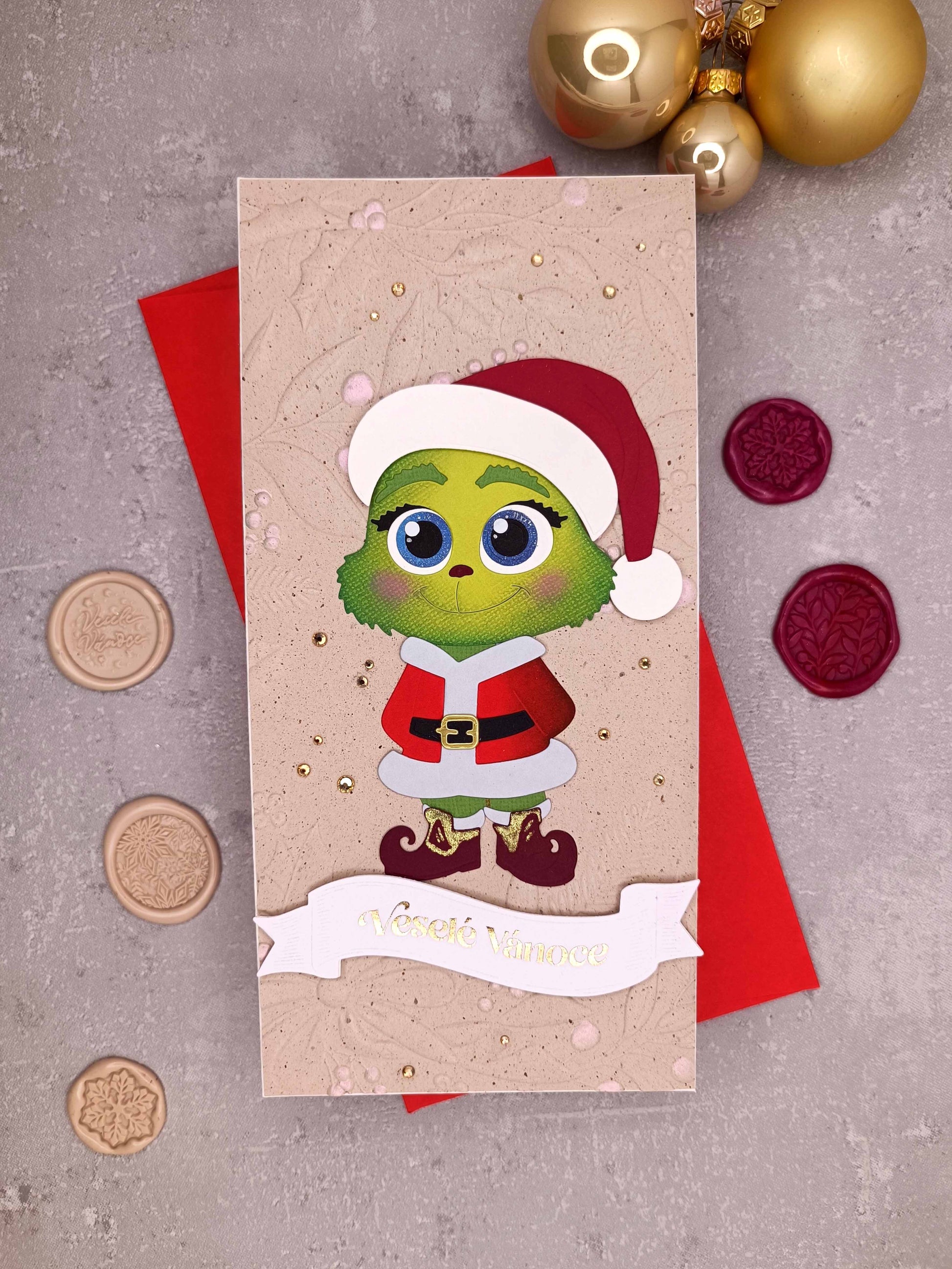 - Ručně vyrobené vánoční přání s Grinchem