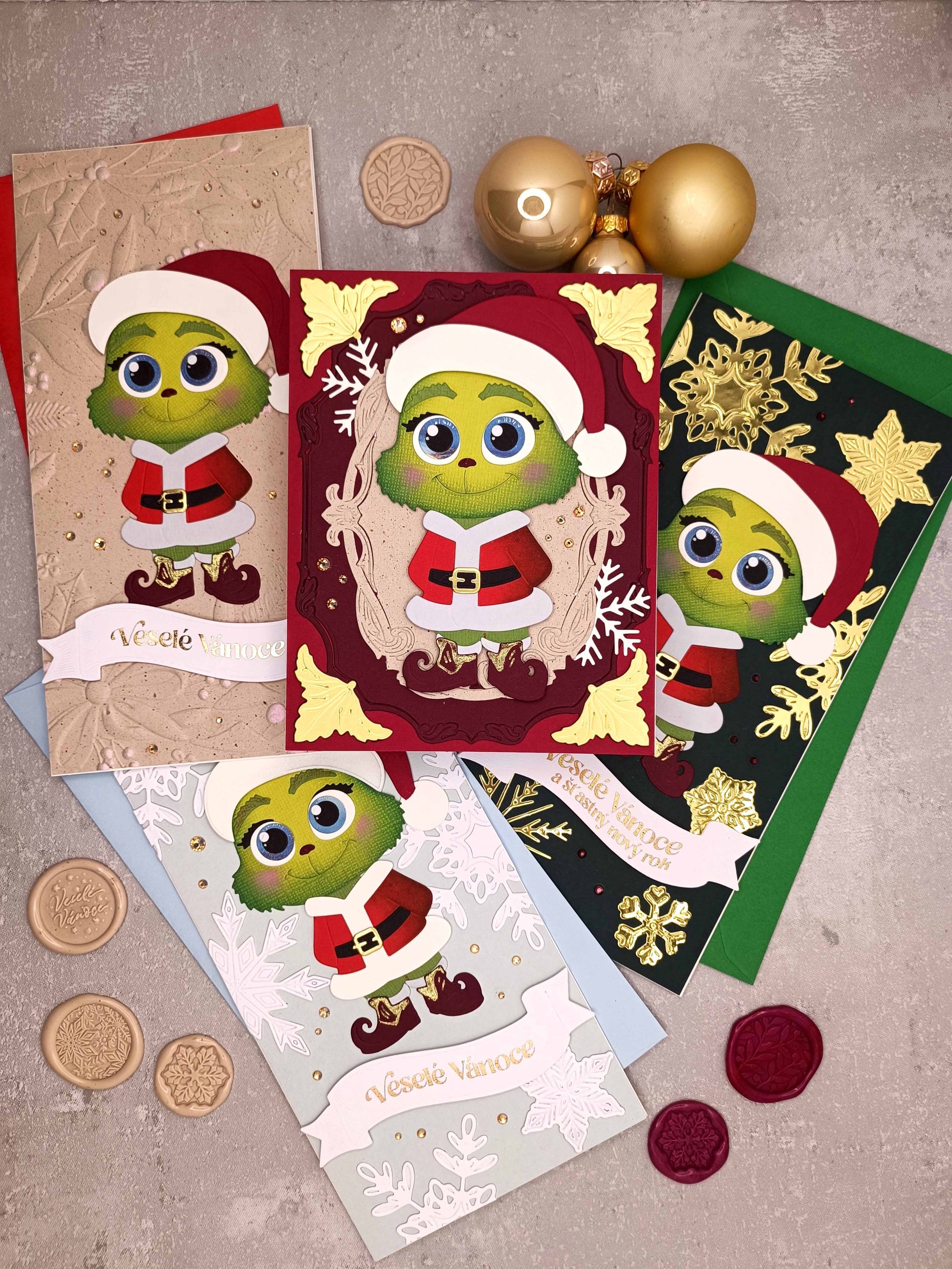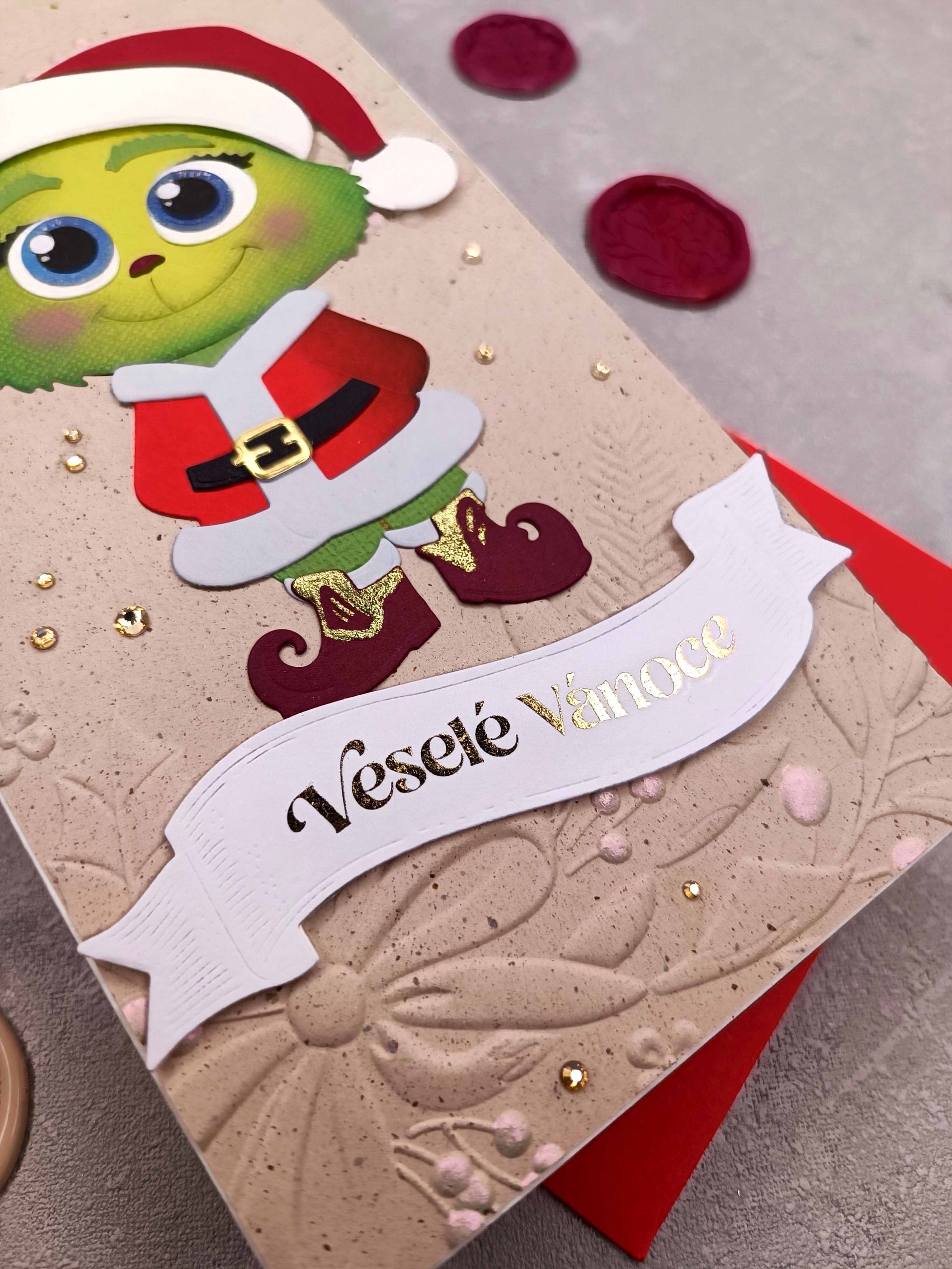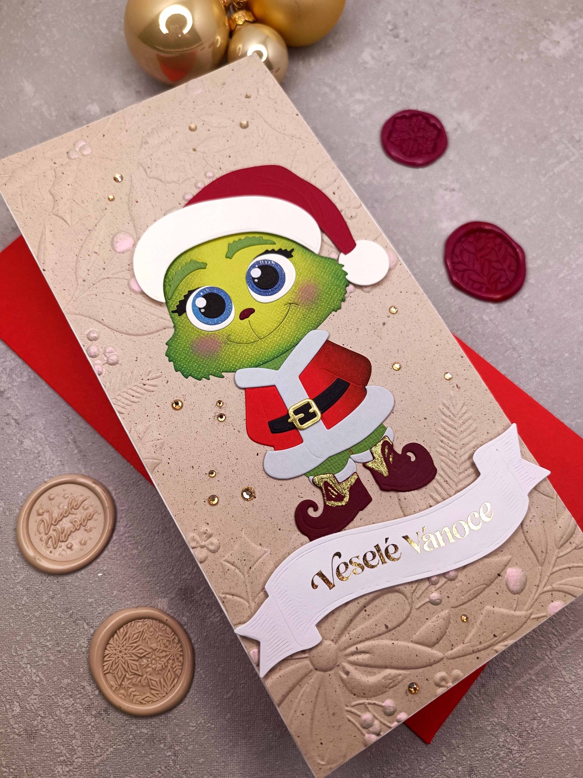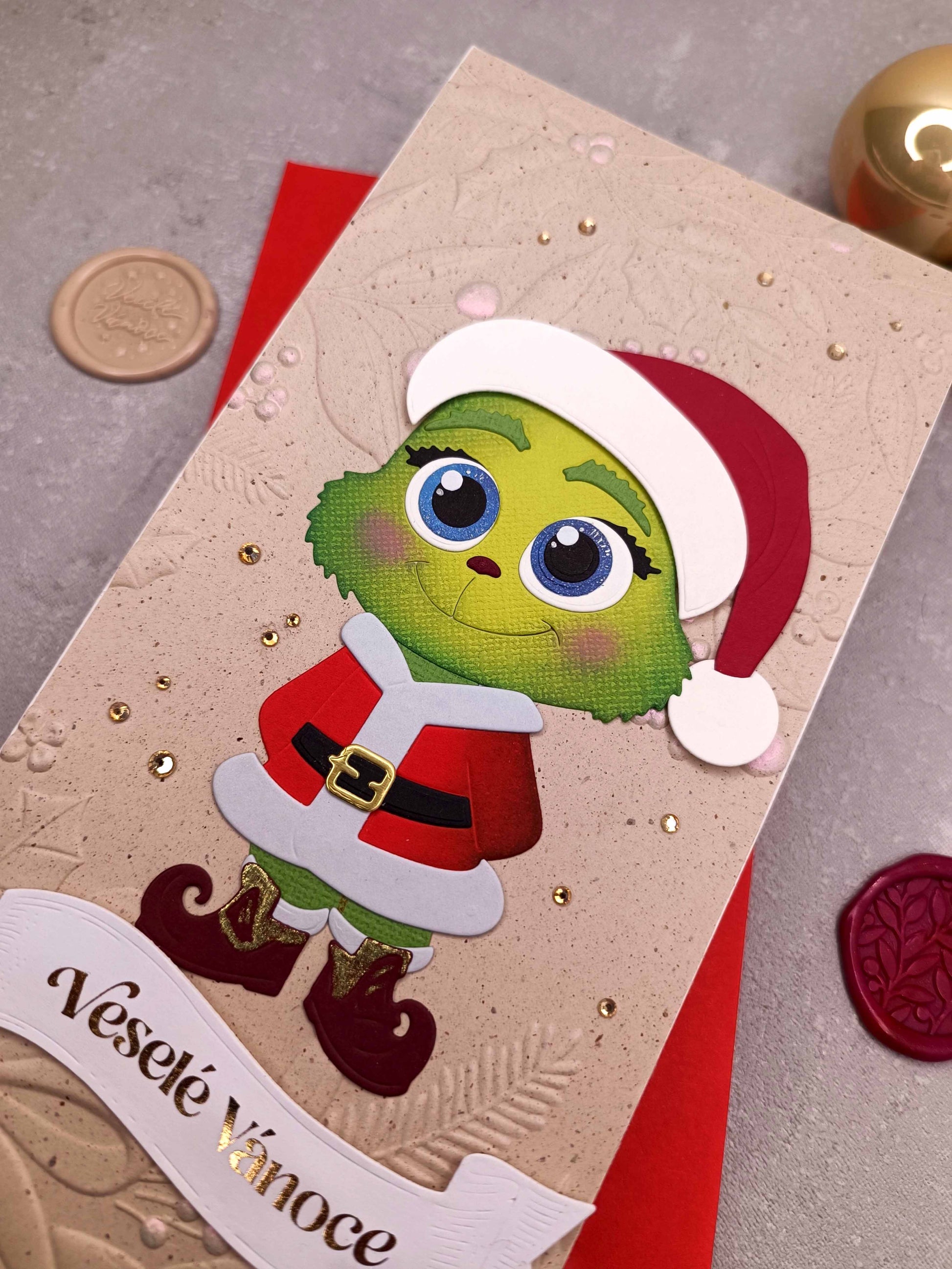 - Ručně vyrobené vánoční přání s Grinchem