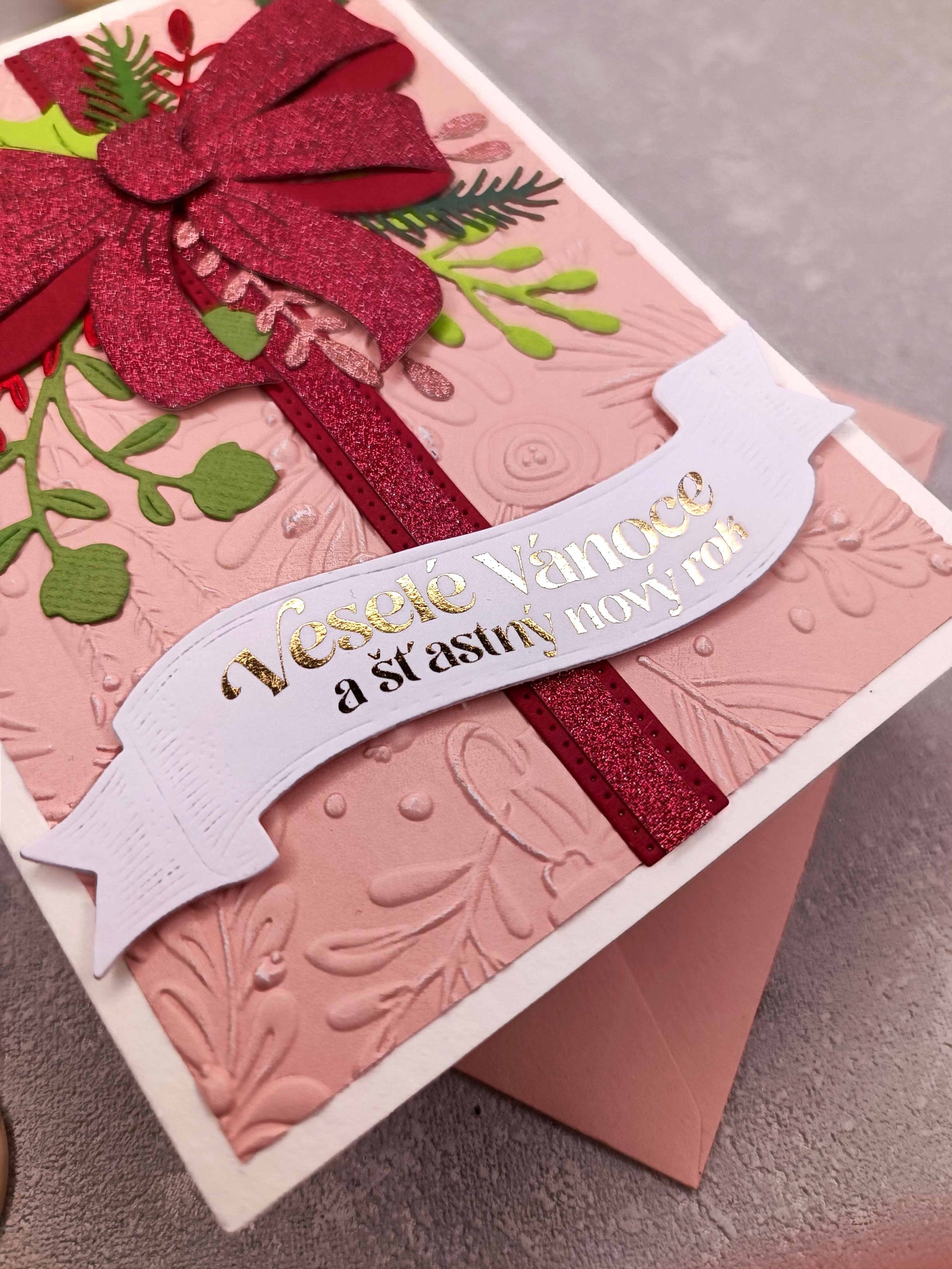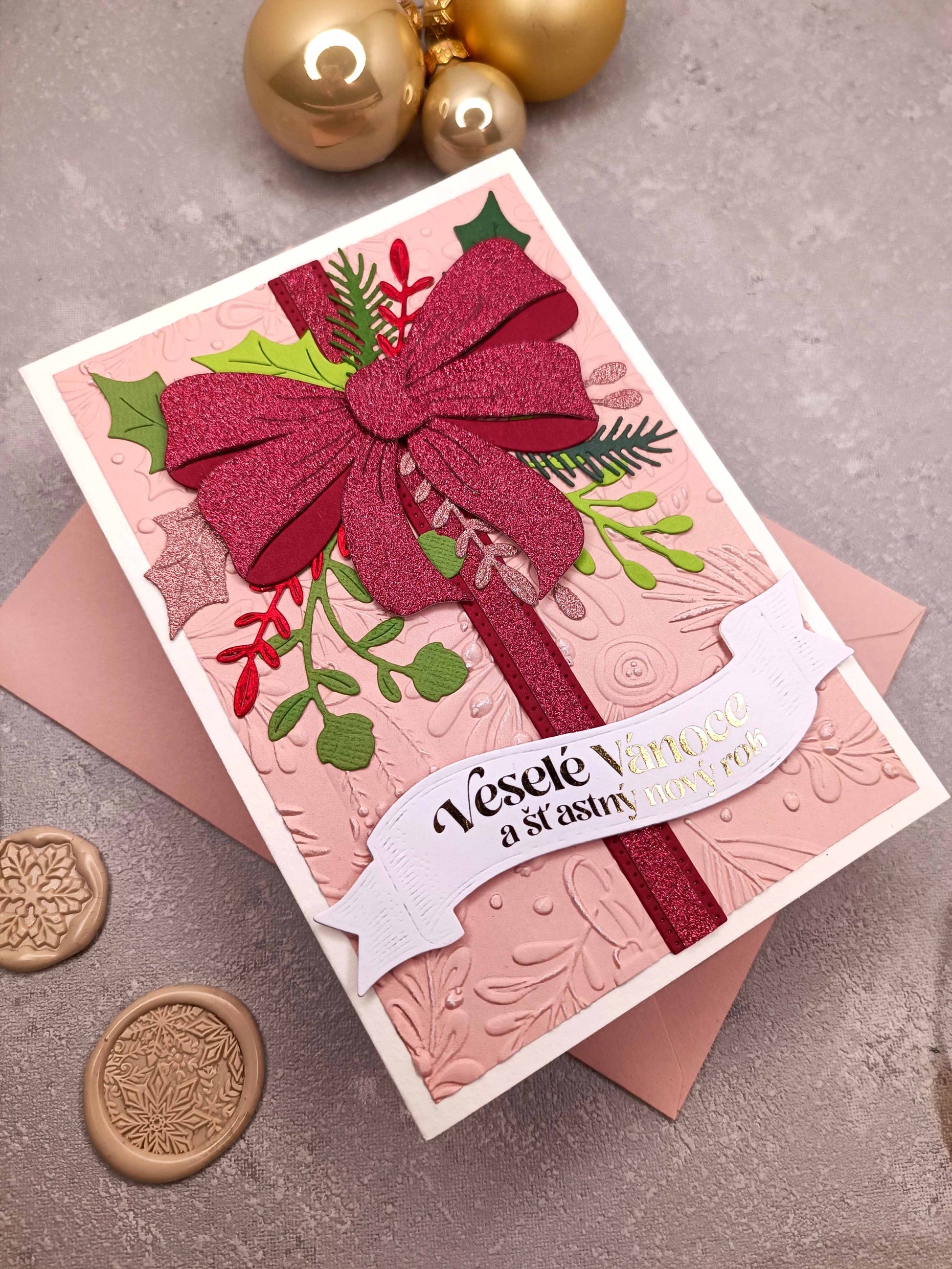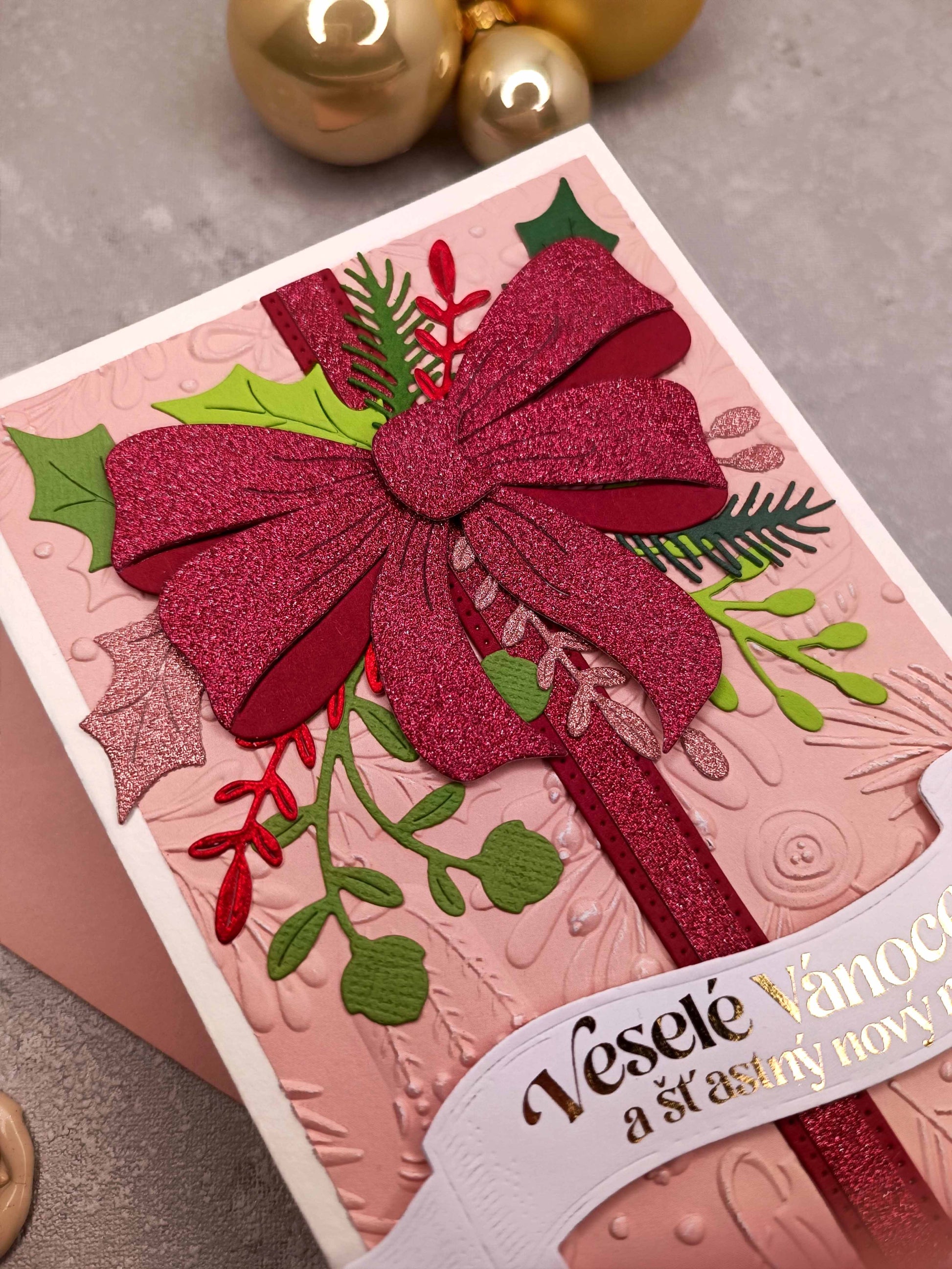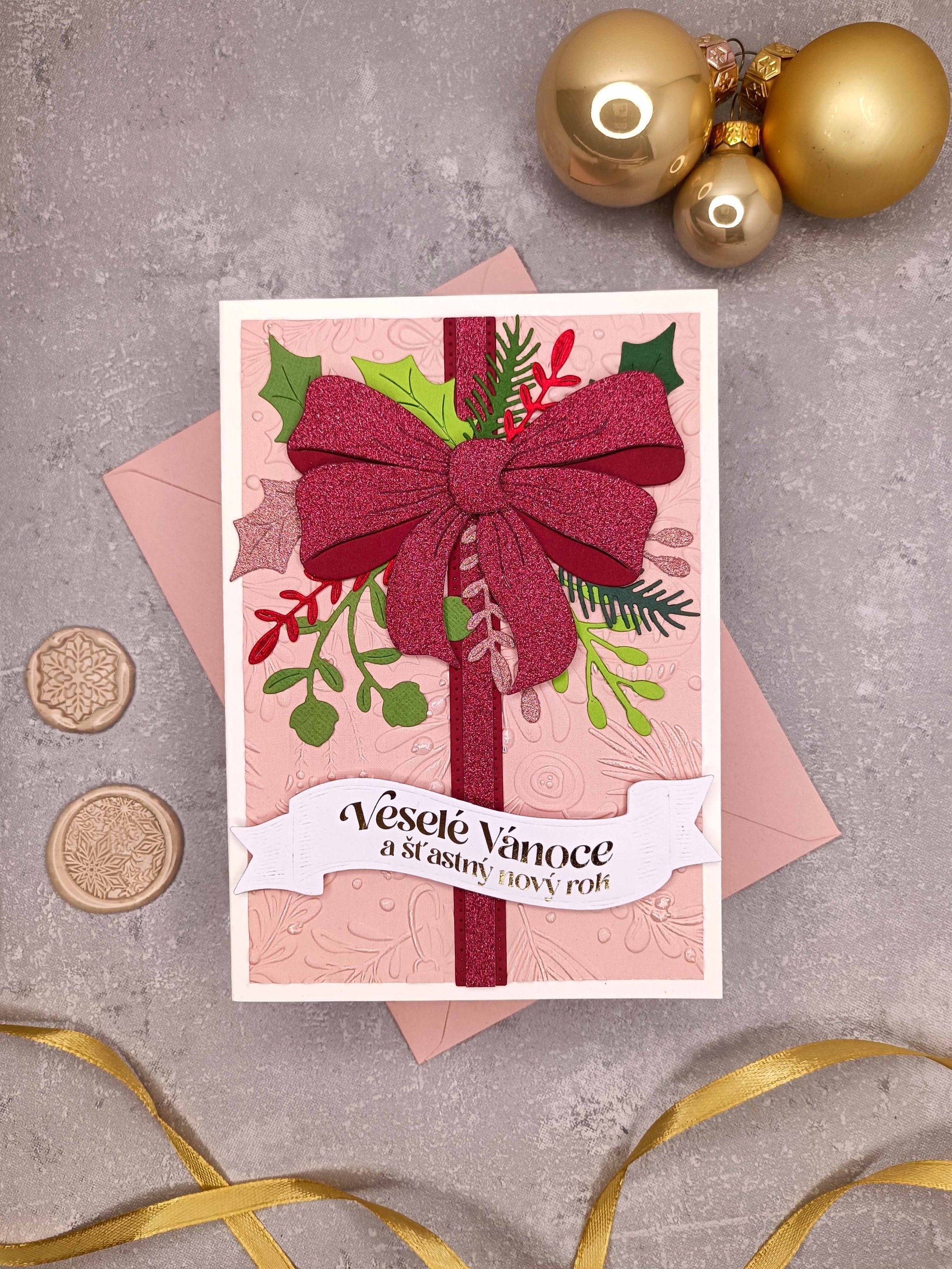 • Ručně vyrobené vánoční přání s mašlí a vánočními větvičkami