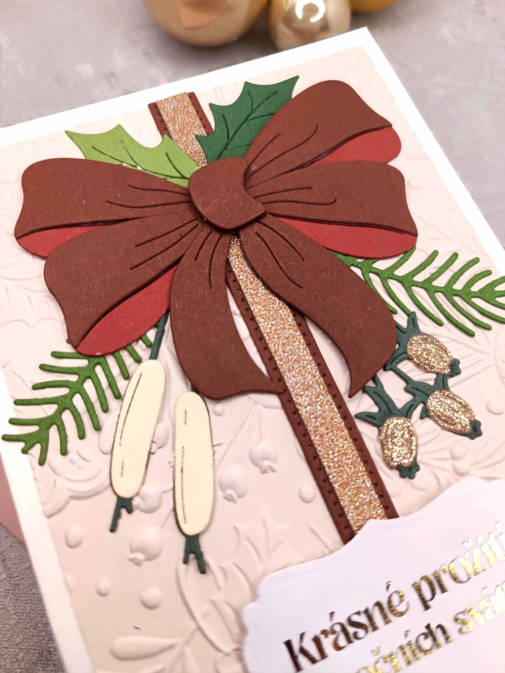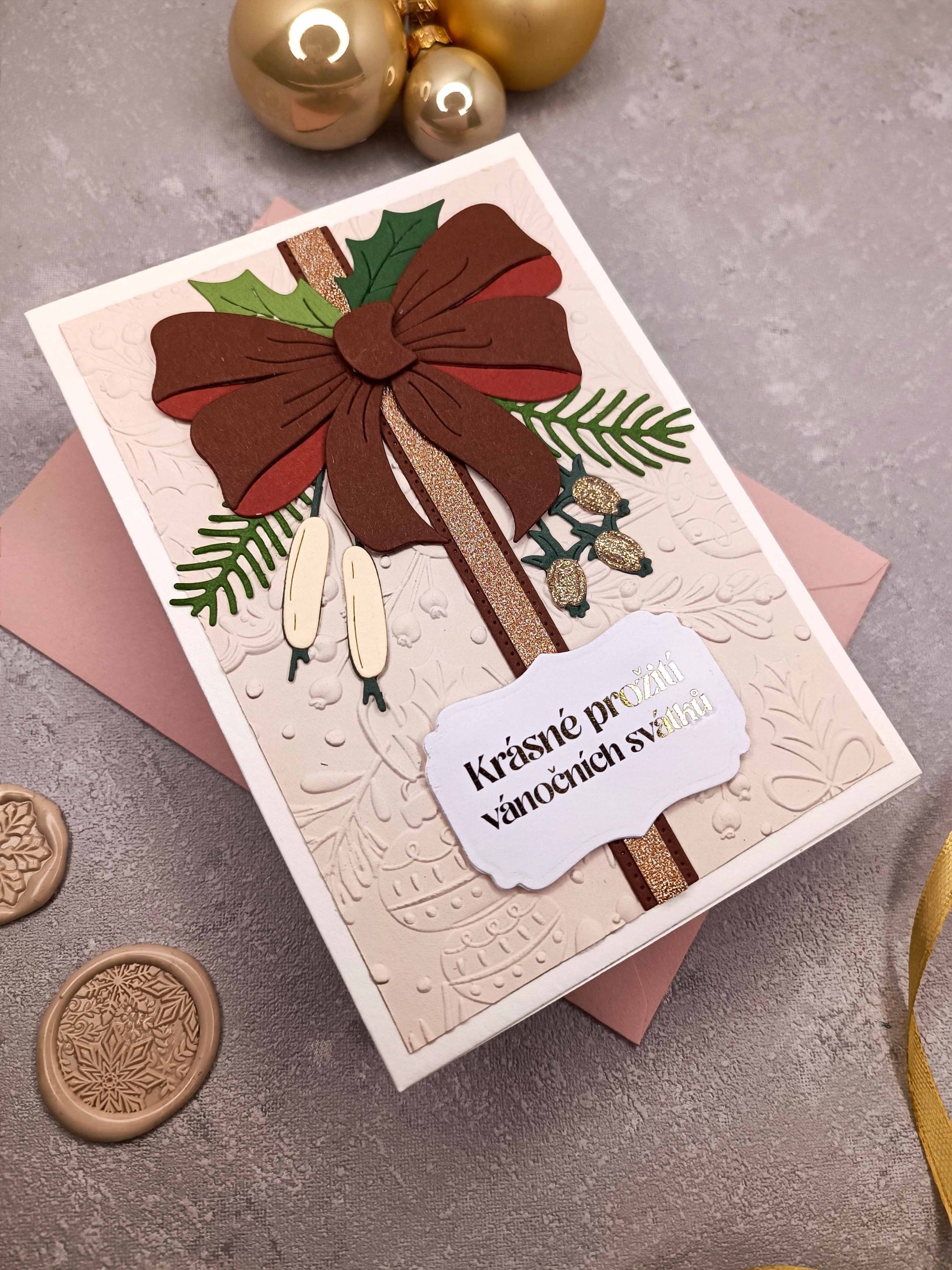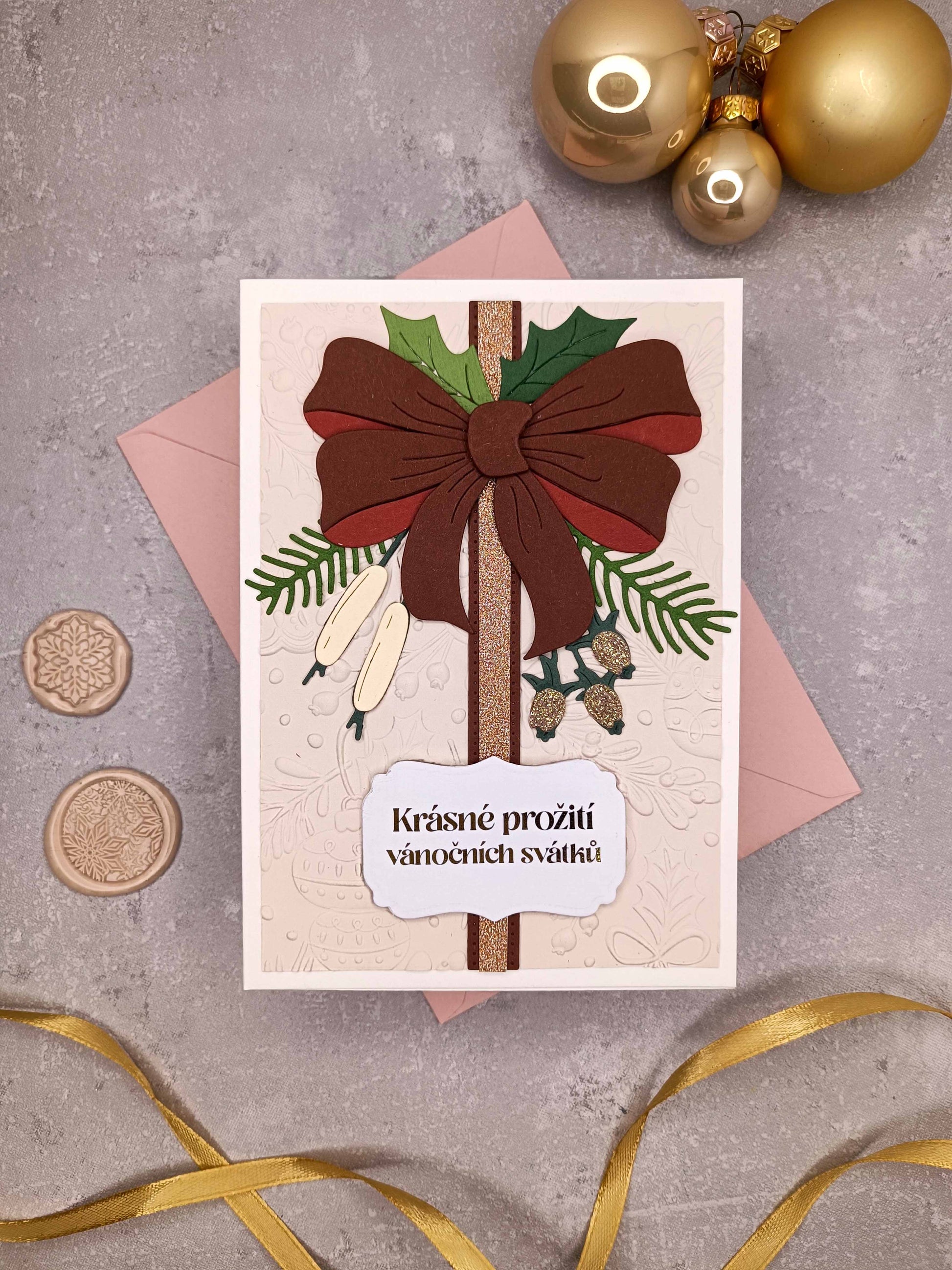 - Ručně vyrobené vánoční přání s mašlí a vánočními větvičkami