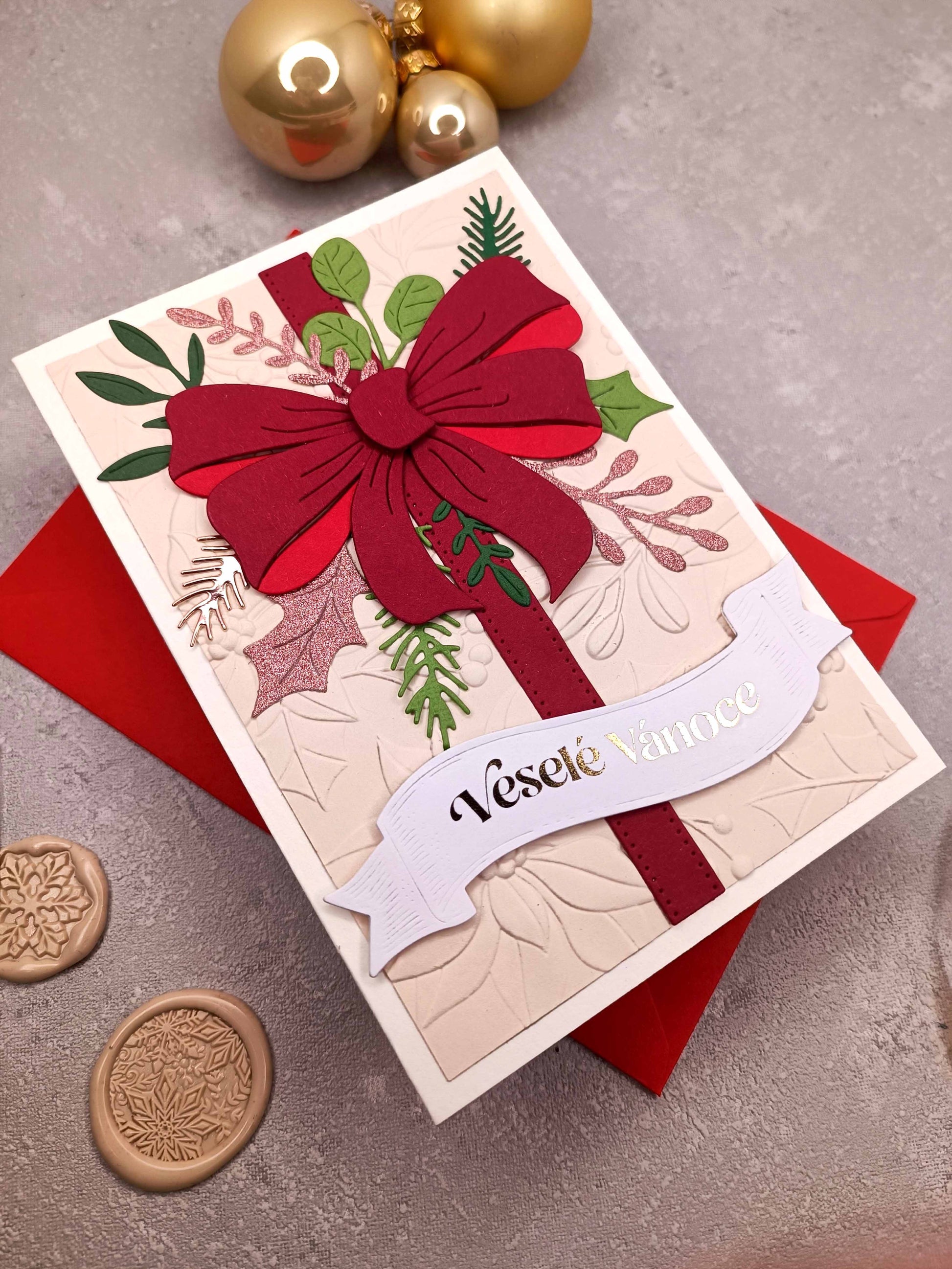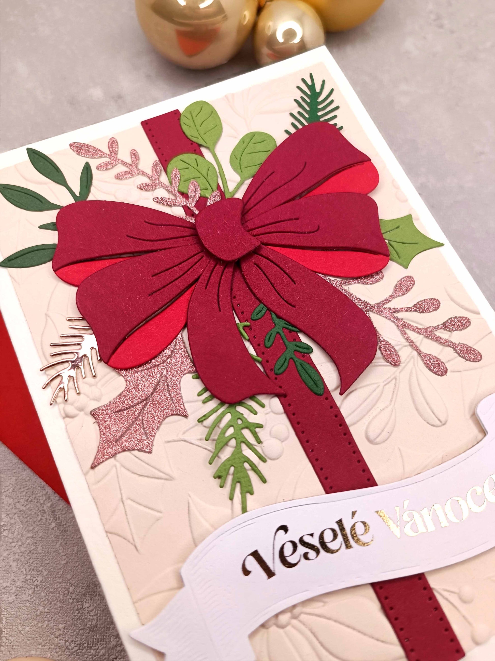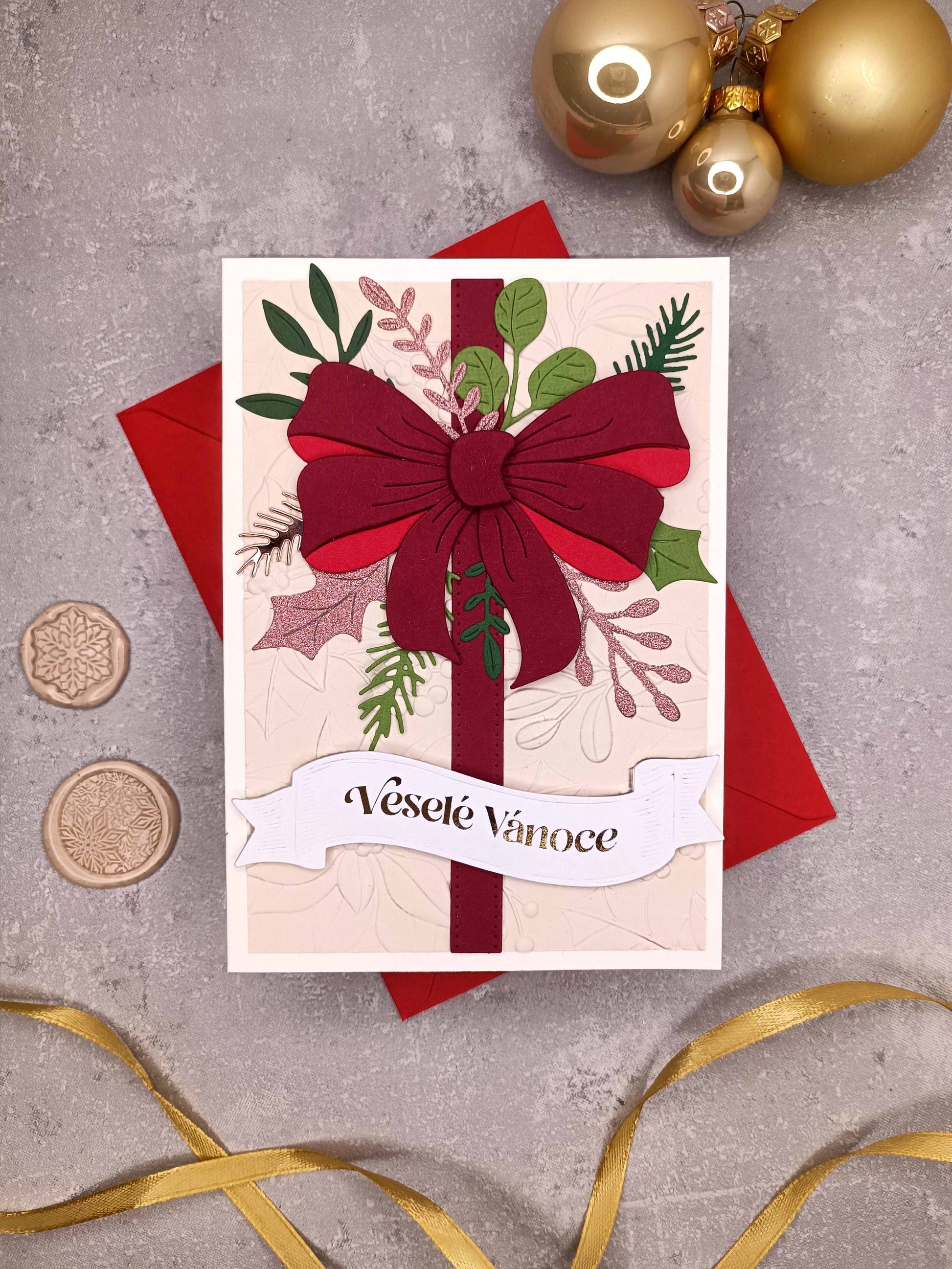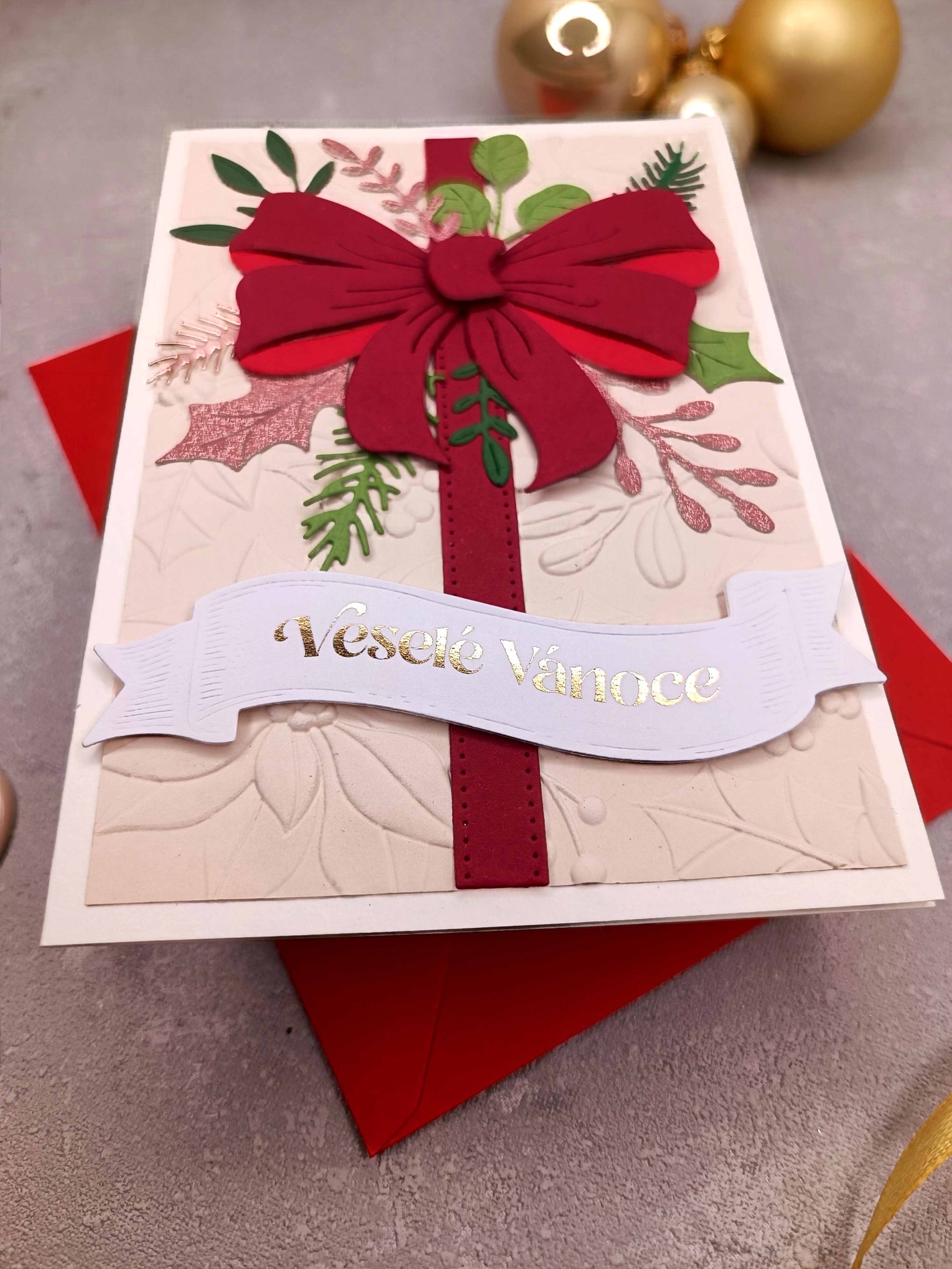 - Ručně vyrobené vánoční přání s mašlí a vánočními větvičkami