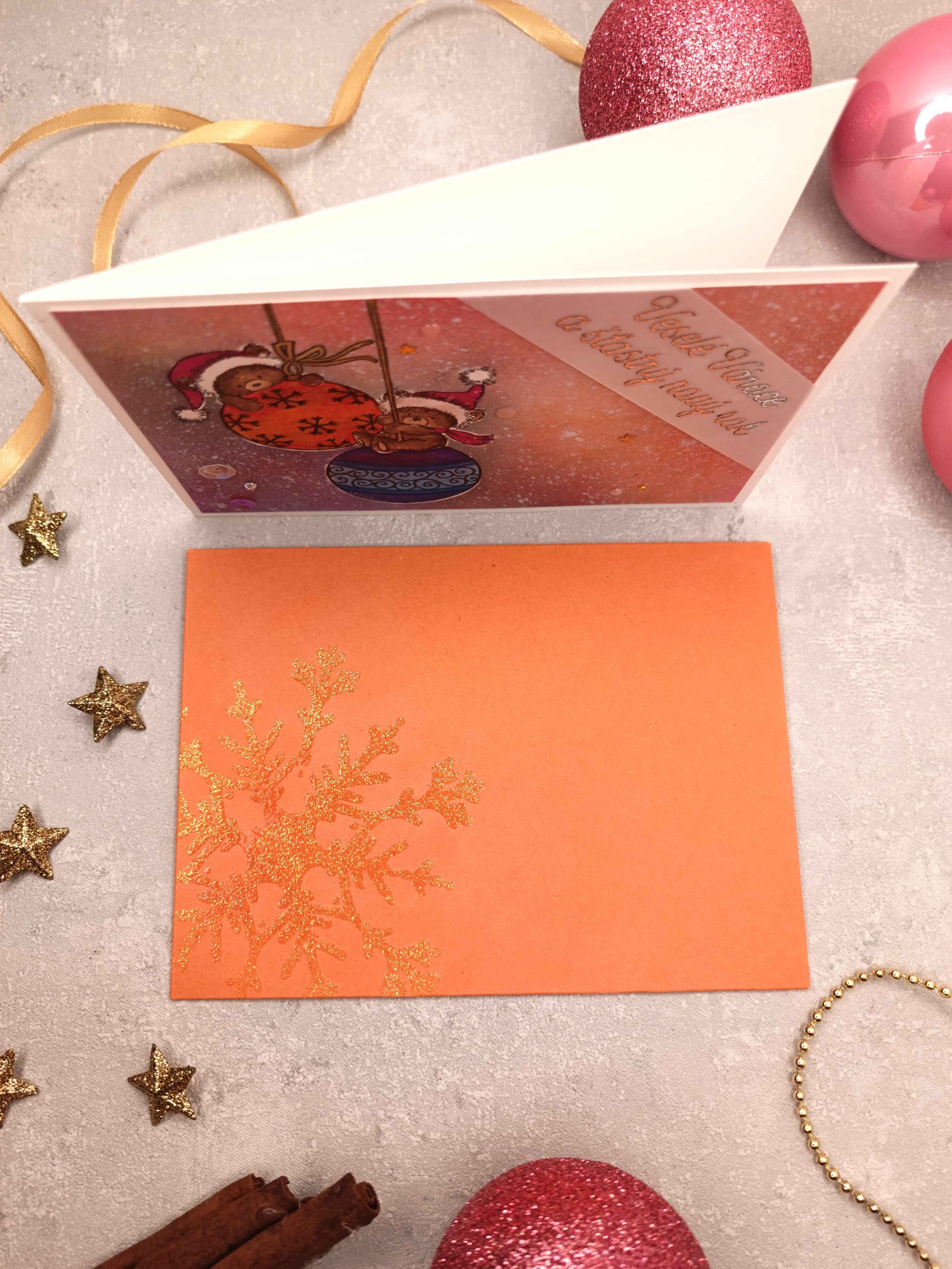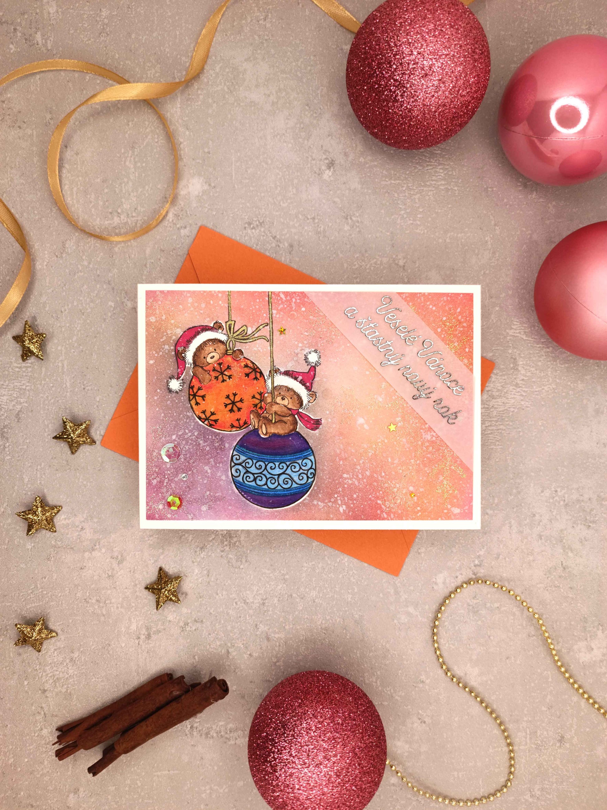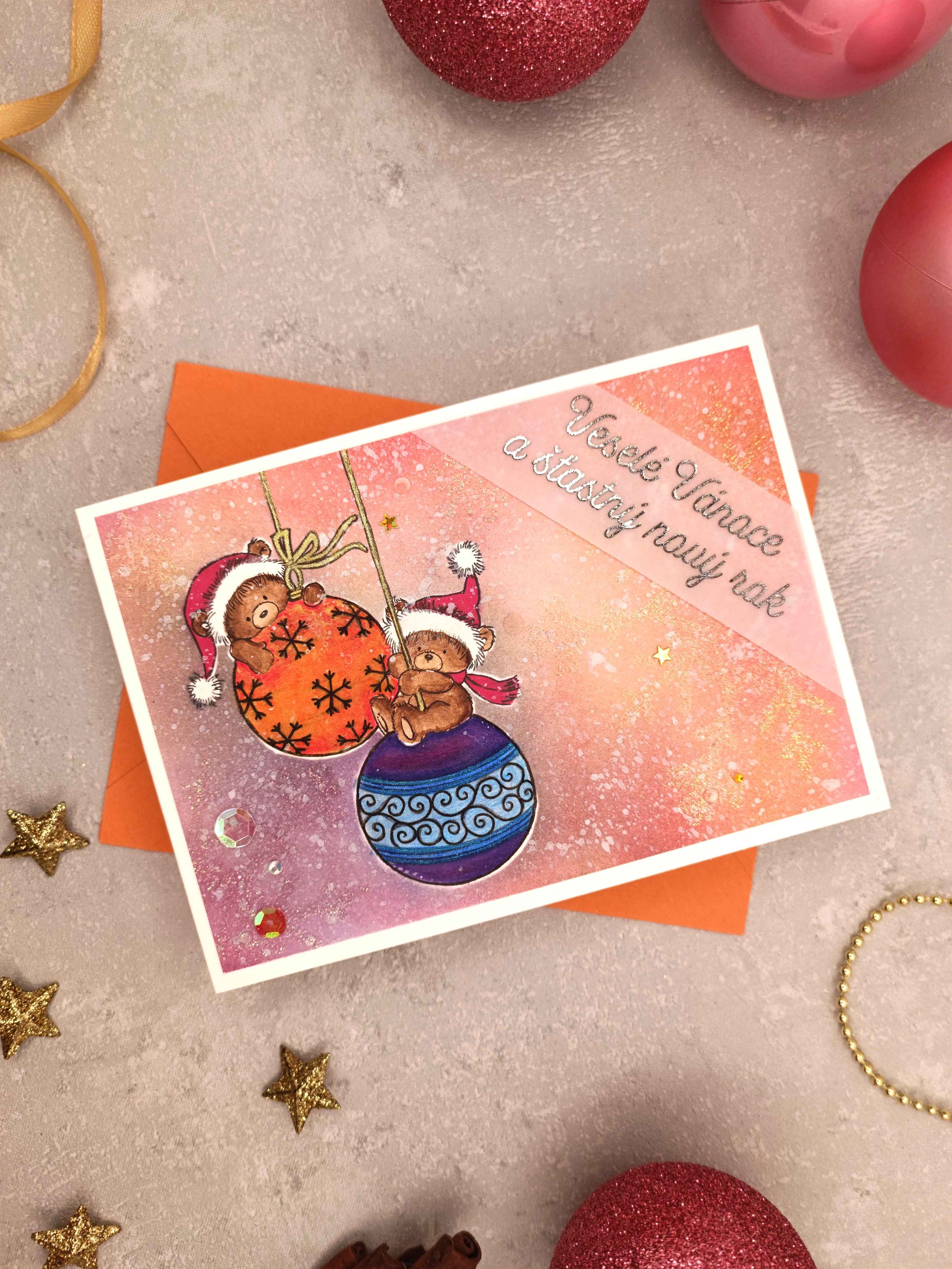 - Ručně vyrobené vánoční přání s motivem medvídků na baňce