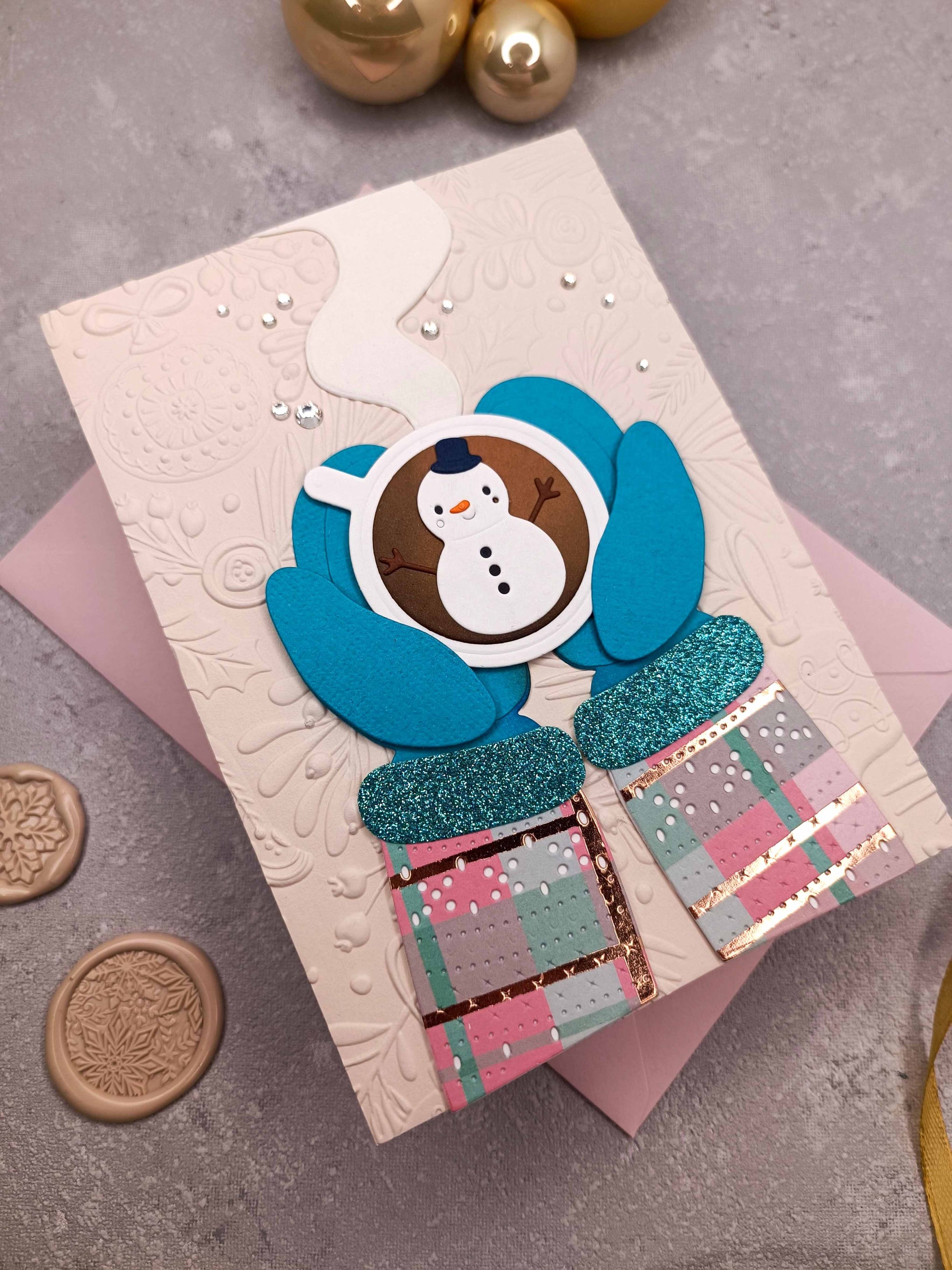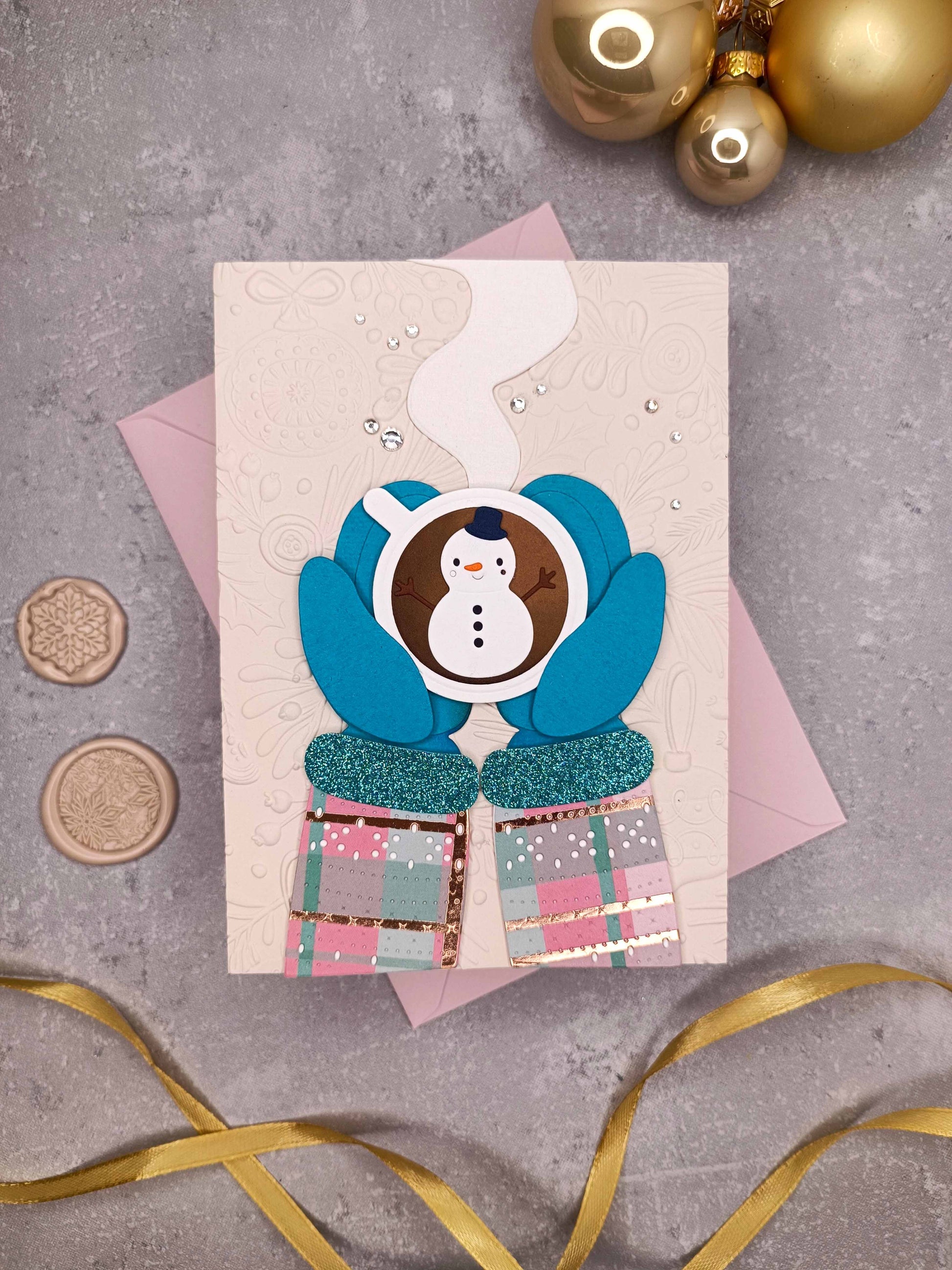 - Ručně vyrobené vánoční přání s palčáky a horkým nápojem
