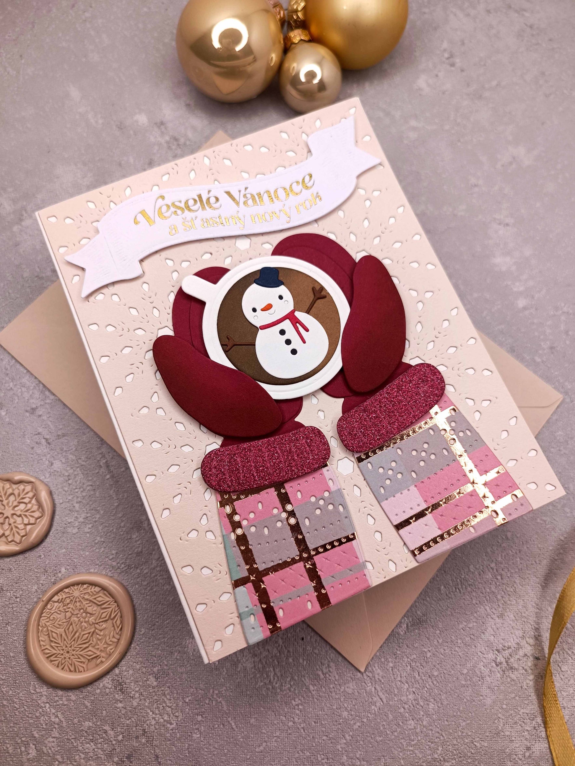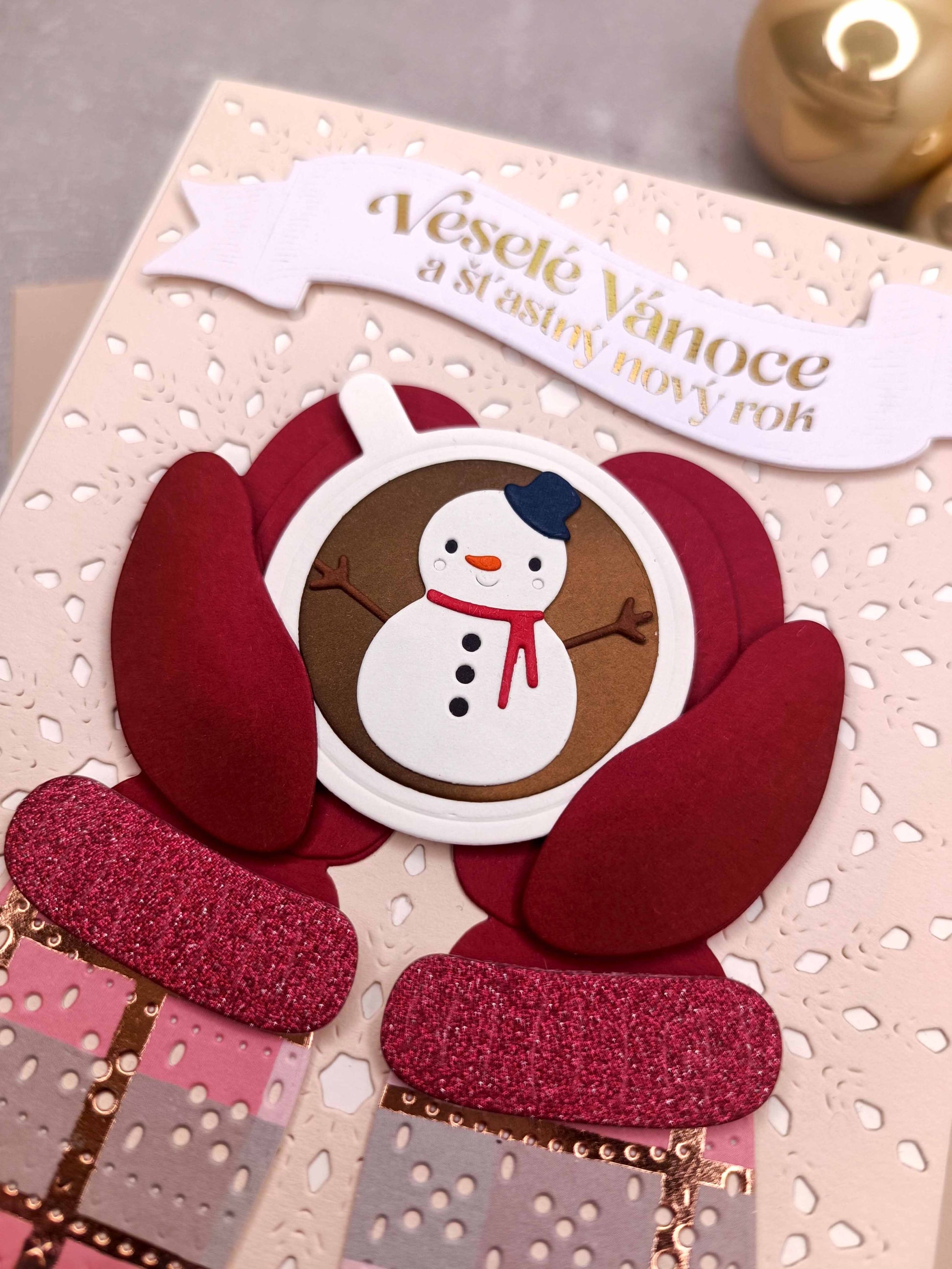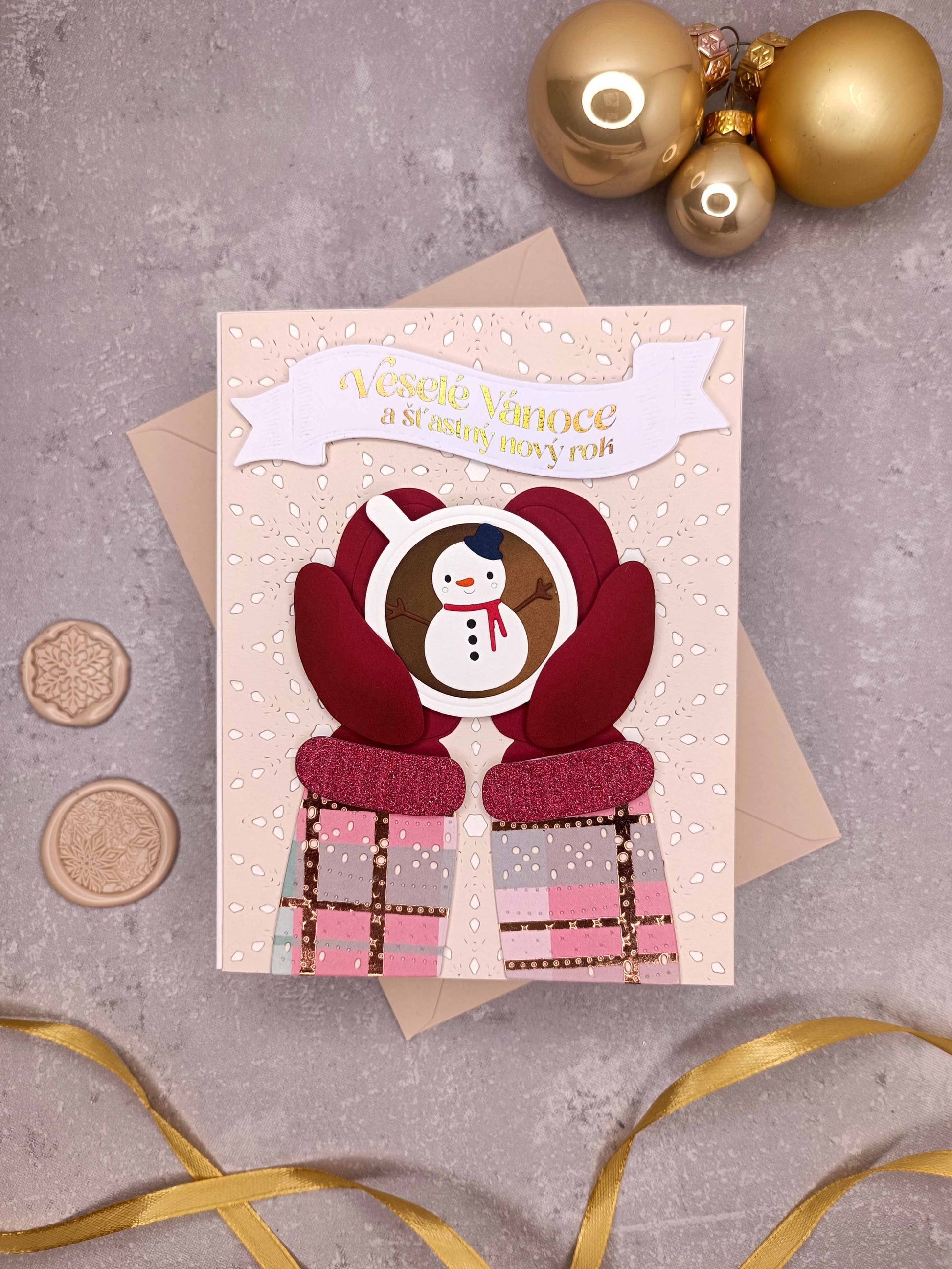 - Ručně vyrobené vánoční přání s palčáky a horkým nápojem