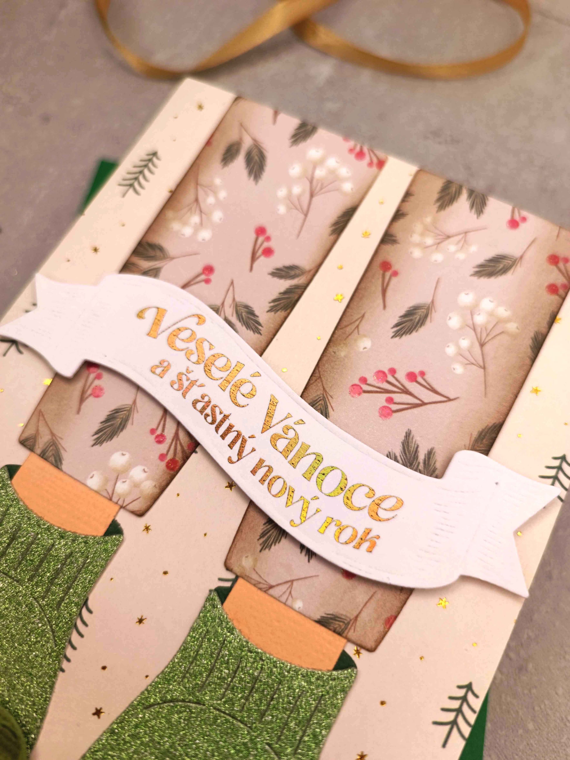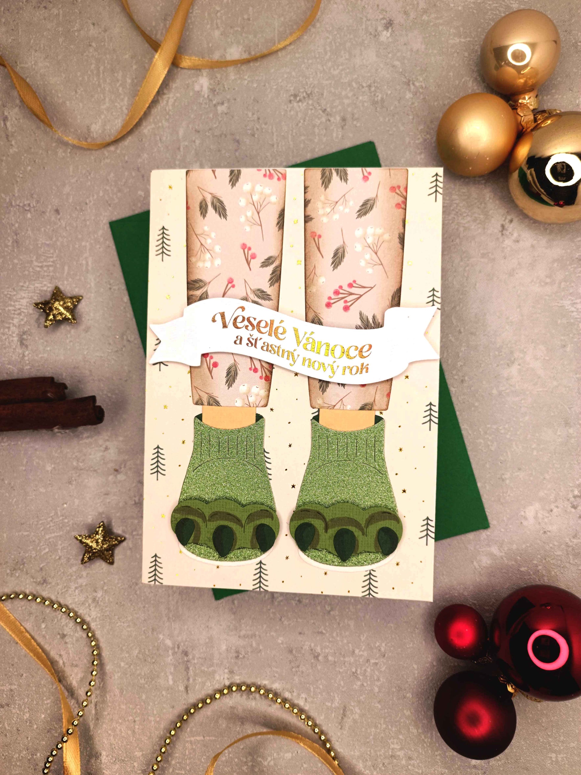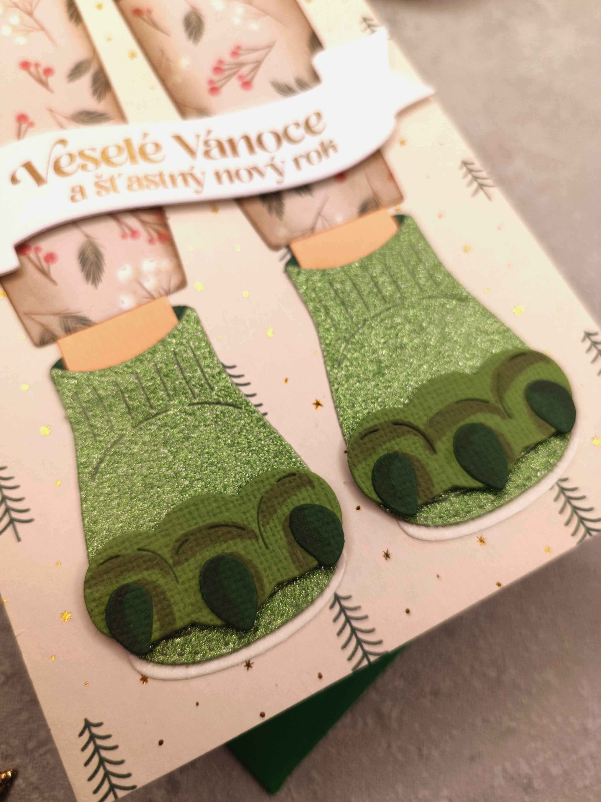 - Ručně vyrobené vánoční přání s motivem vánočních zelených papuček s drápy