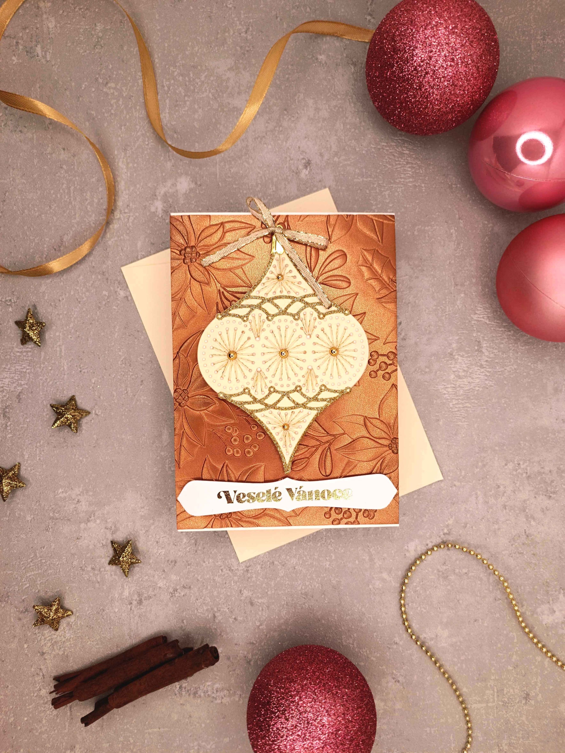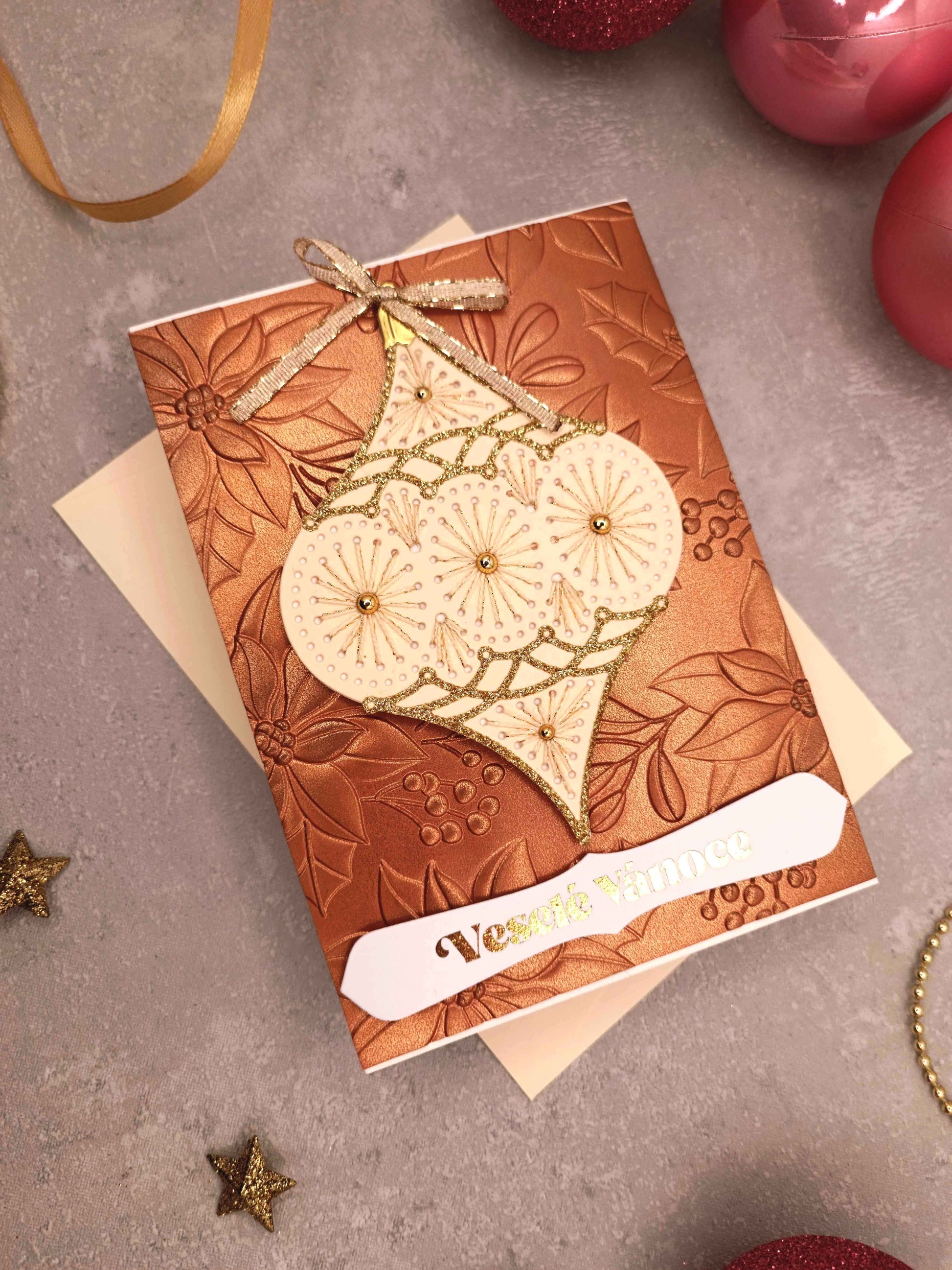- Ručně vyrobené vánoční přání s motivem ručně vyšité vánoční baňky