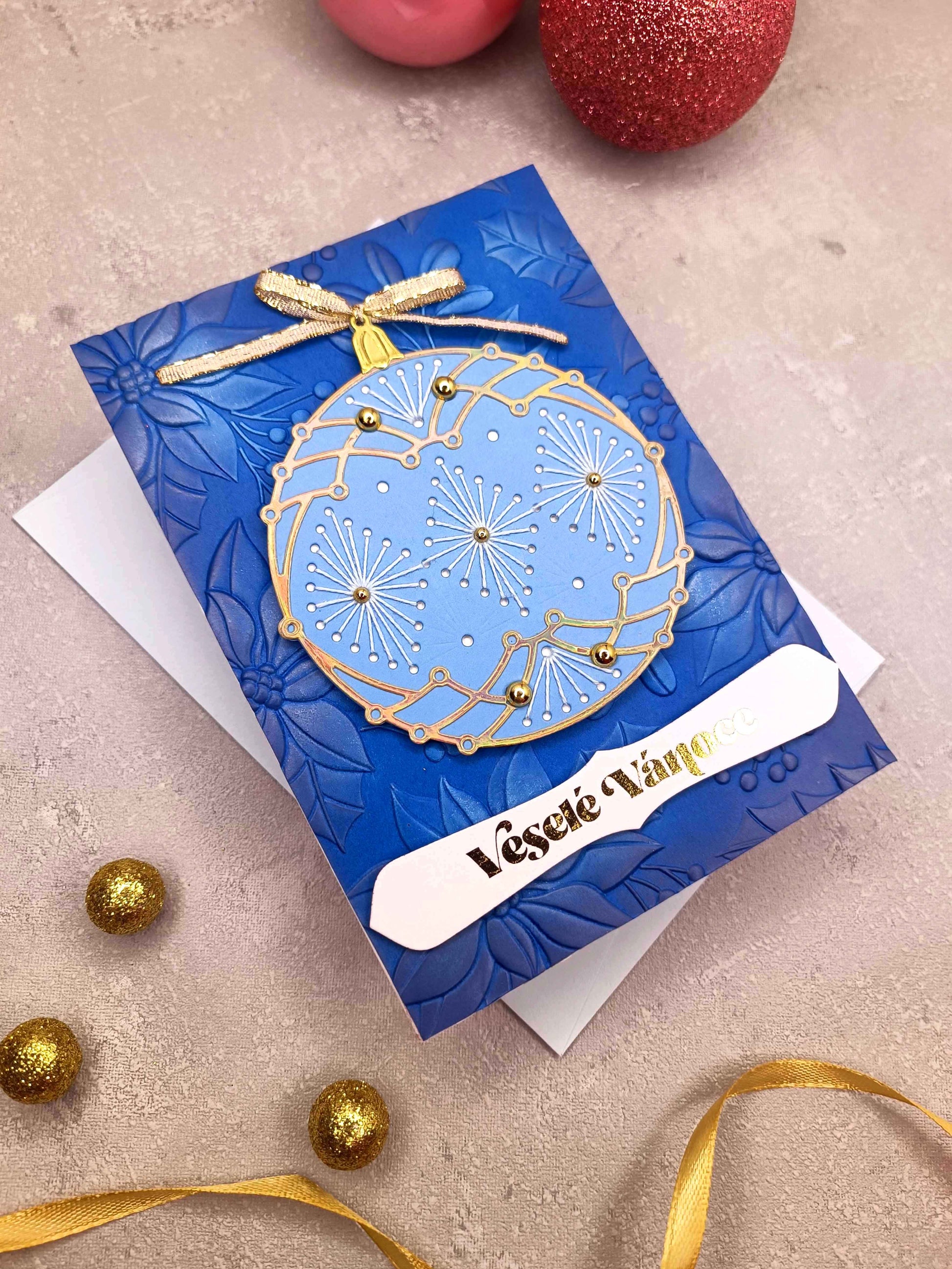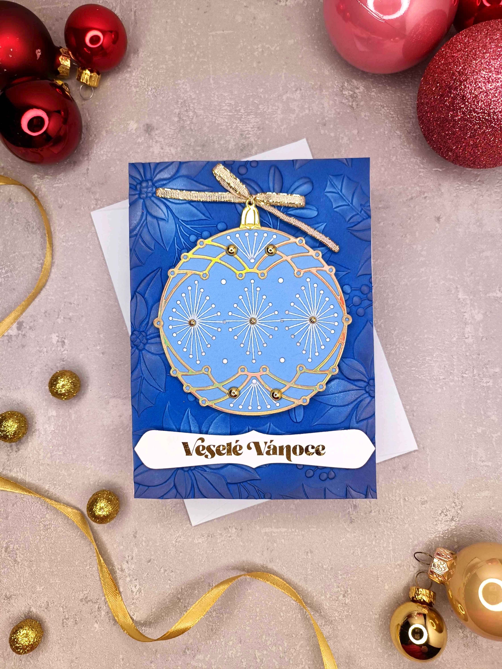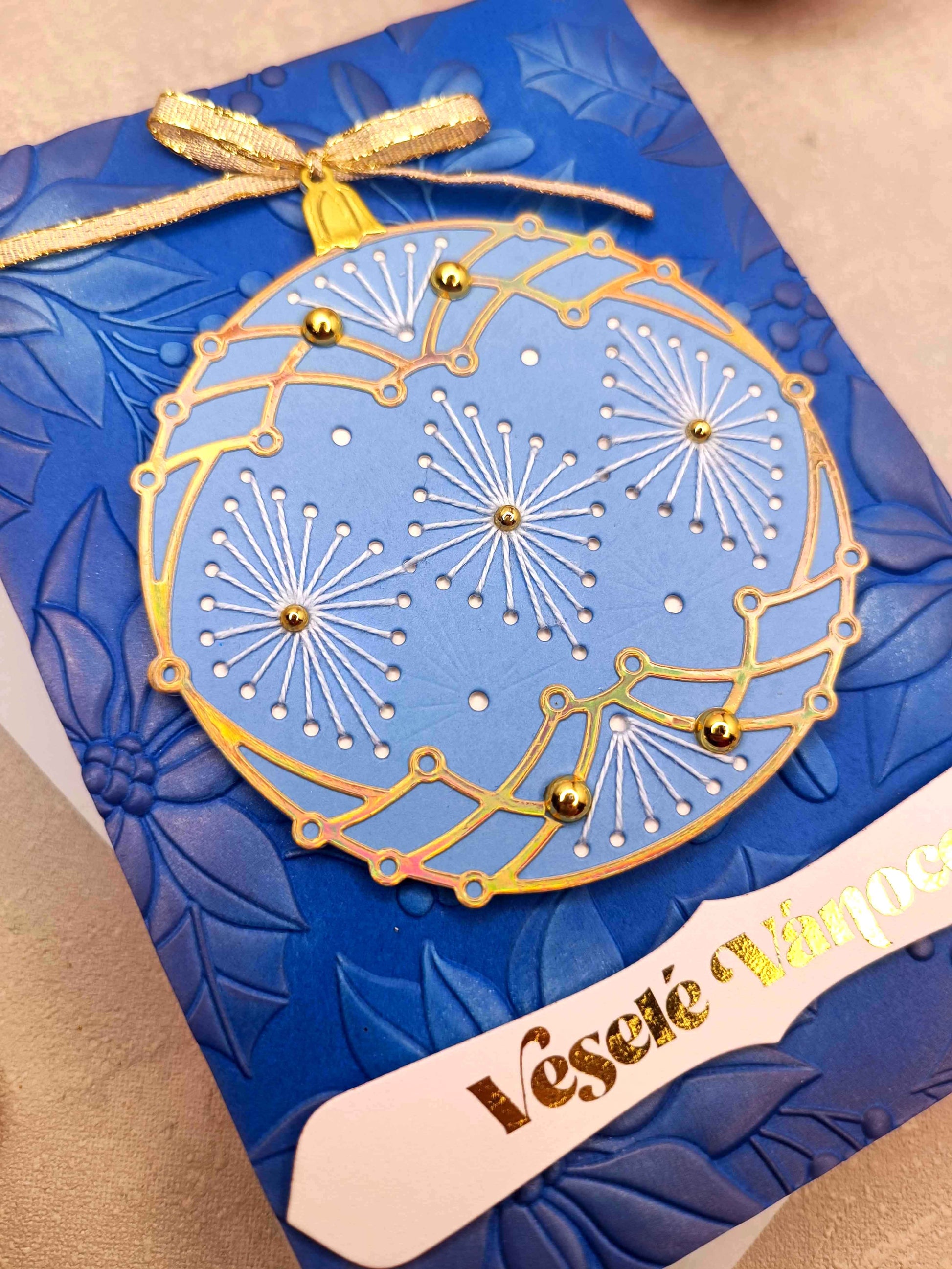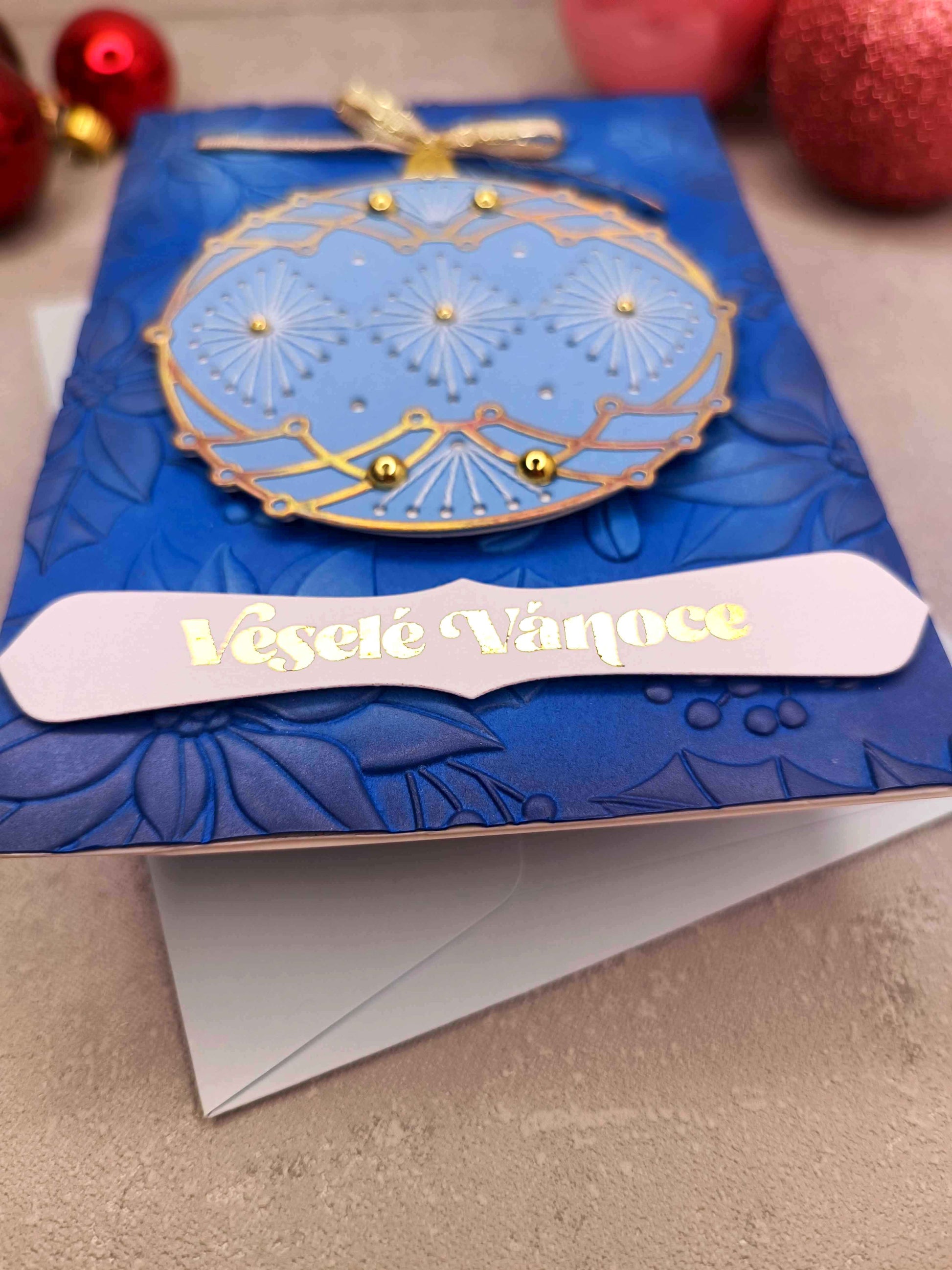 - Ručně vyrobené vánoční přání s motivem ručně vyšité vánoční baňky