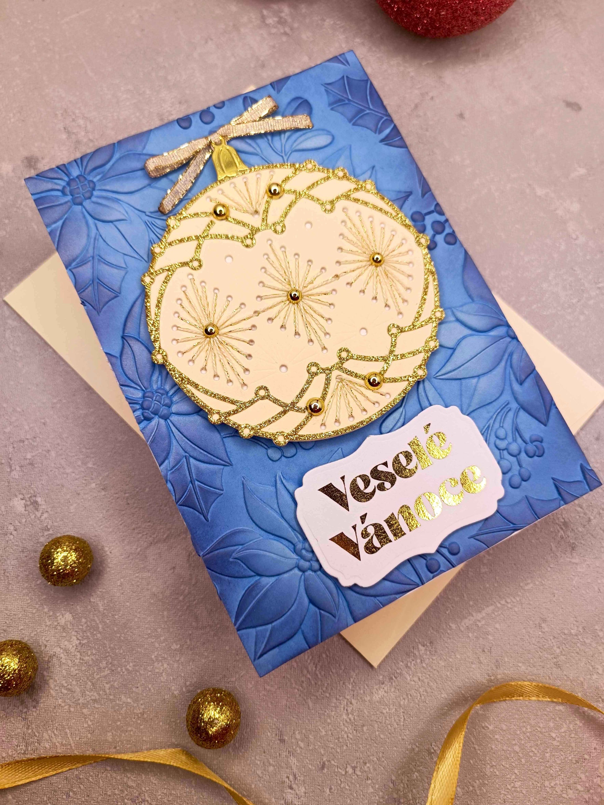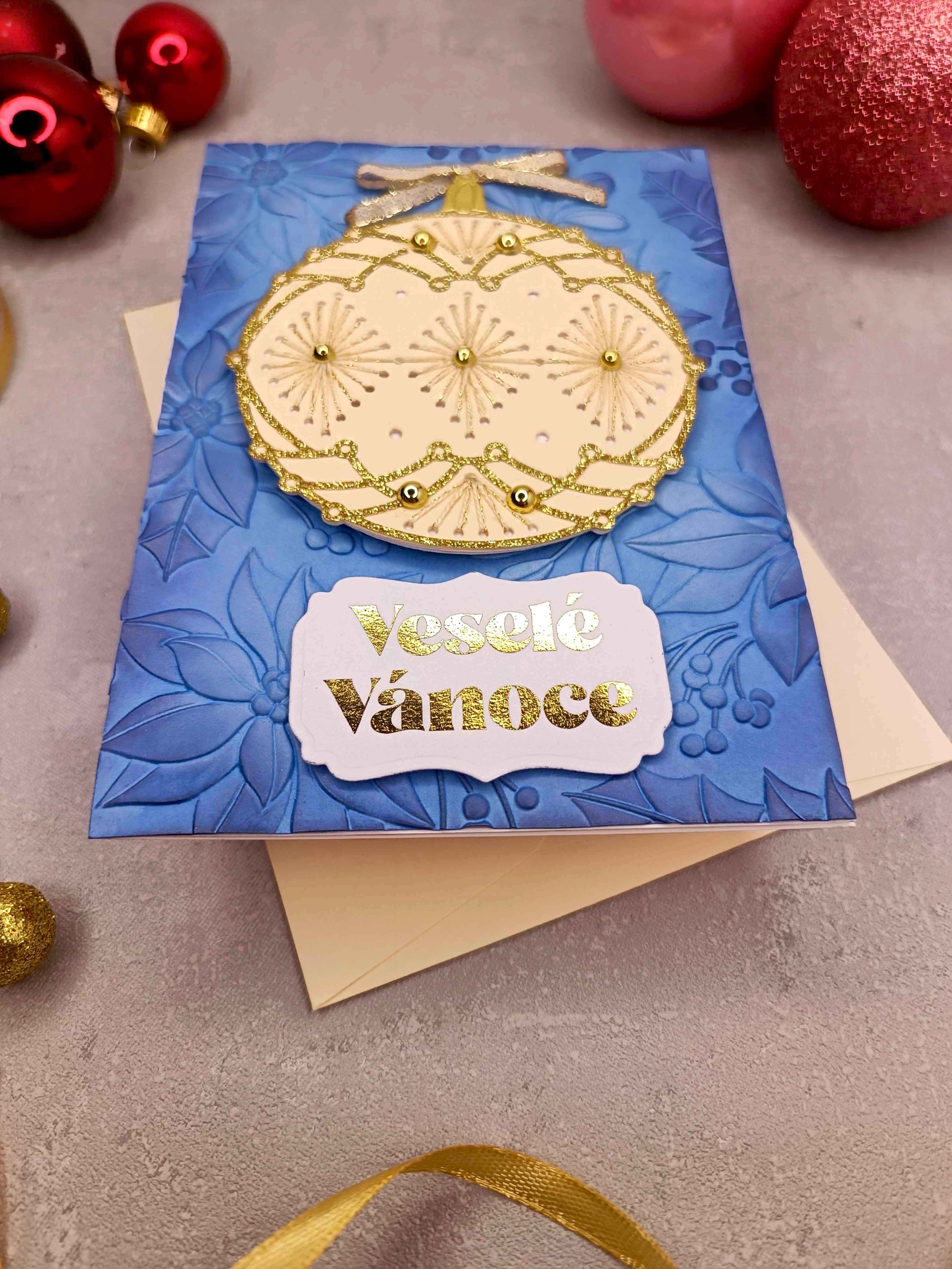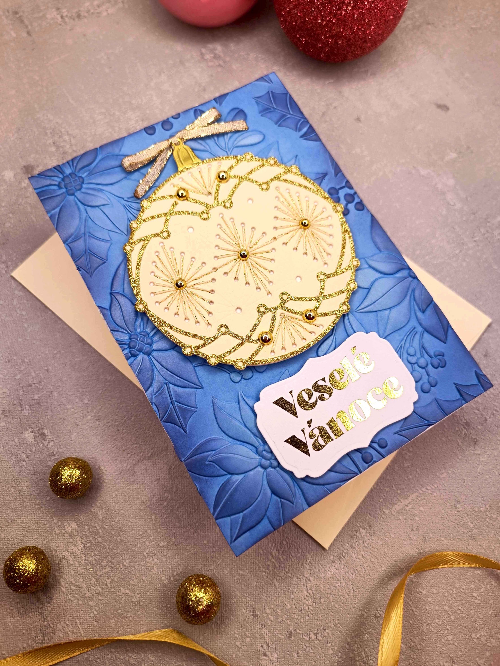 - Ručně vyrobené vánoční přání s motivem ručně vyšité vánoční baňky