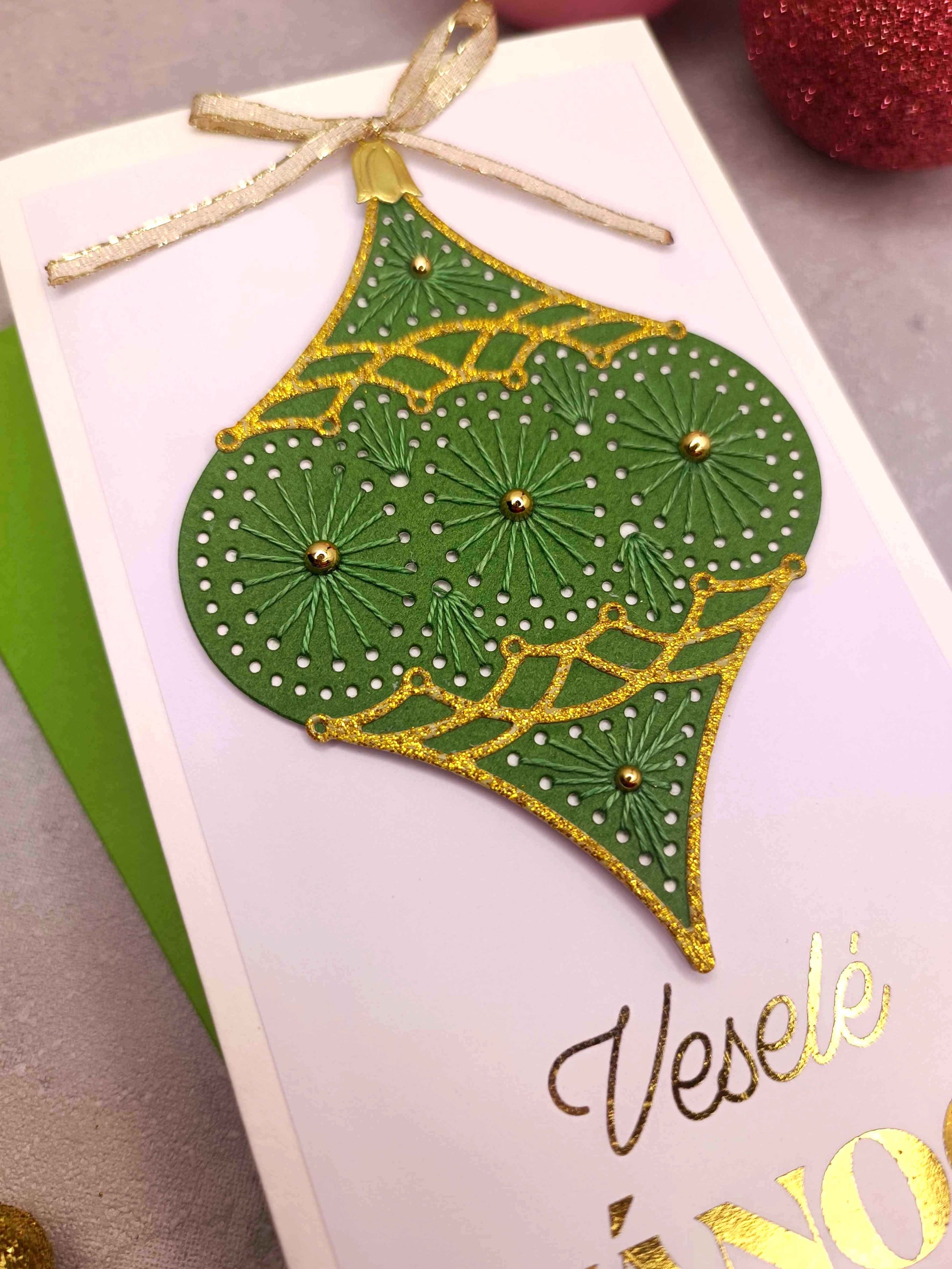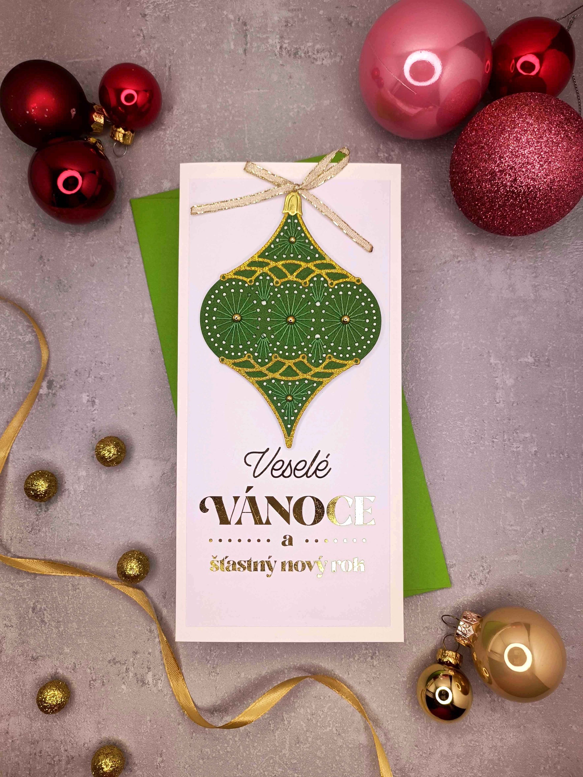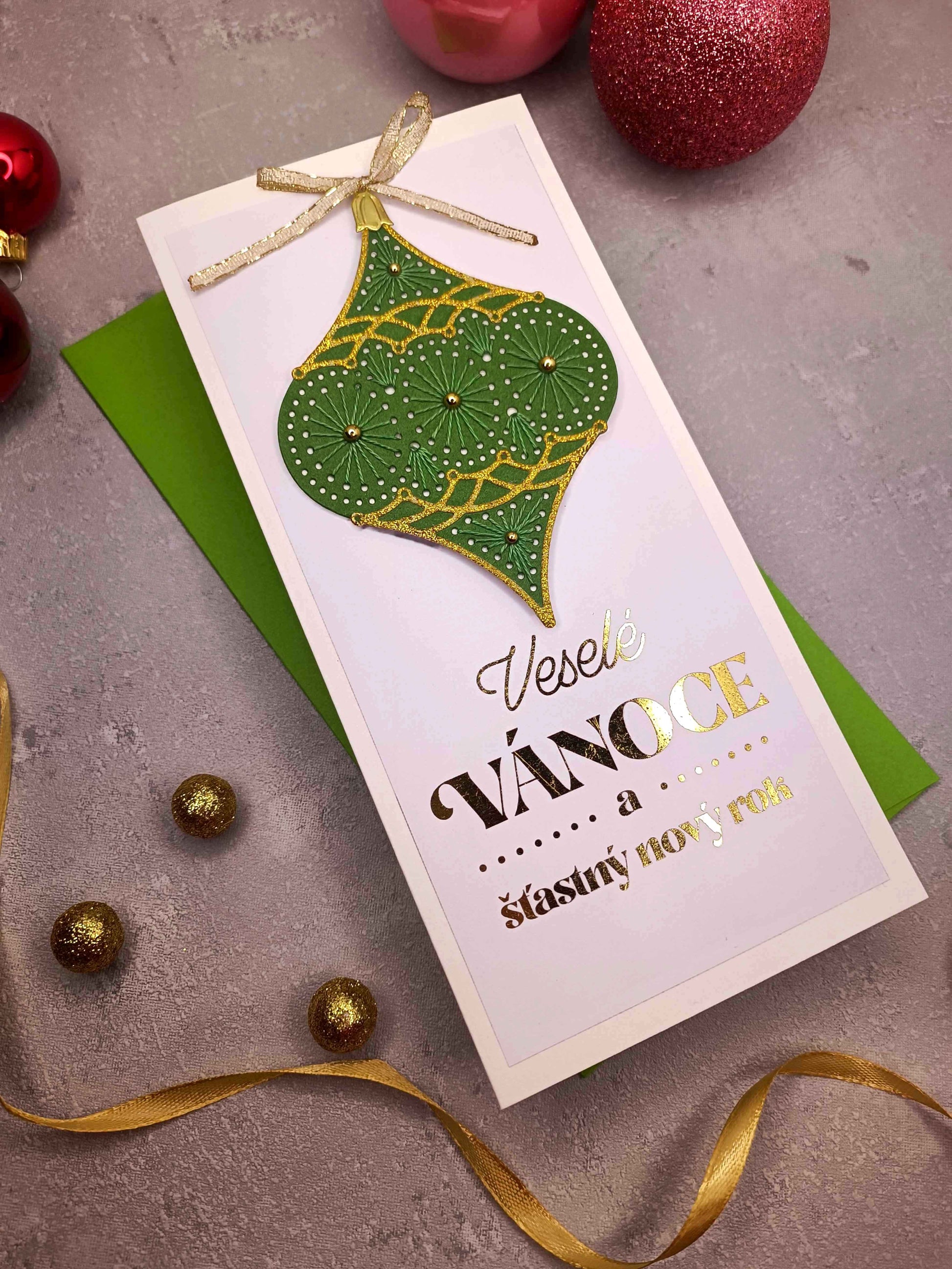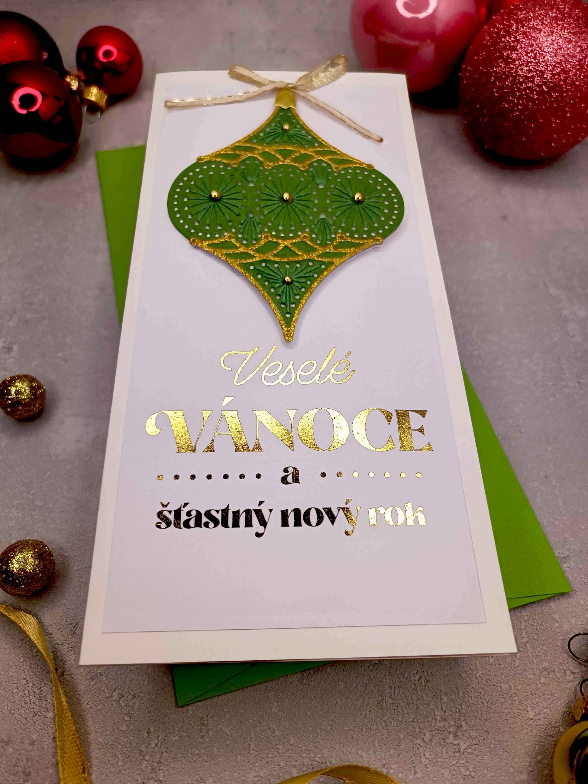 - Přání je zdobeno zlatým metalickým nápisem a vyšívanou vánoční baňkou
