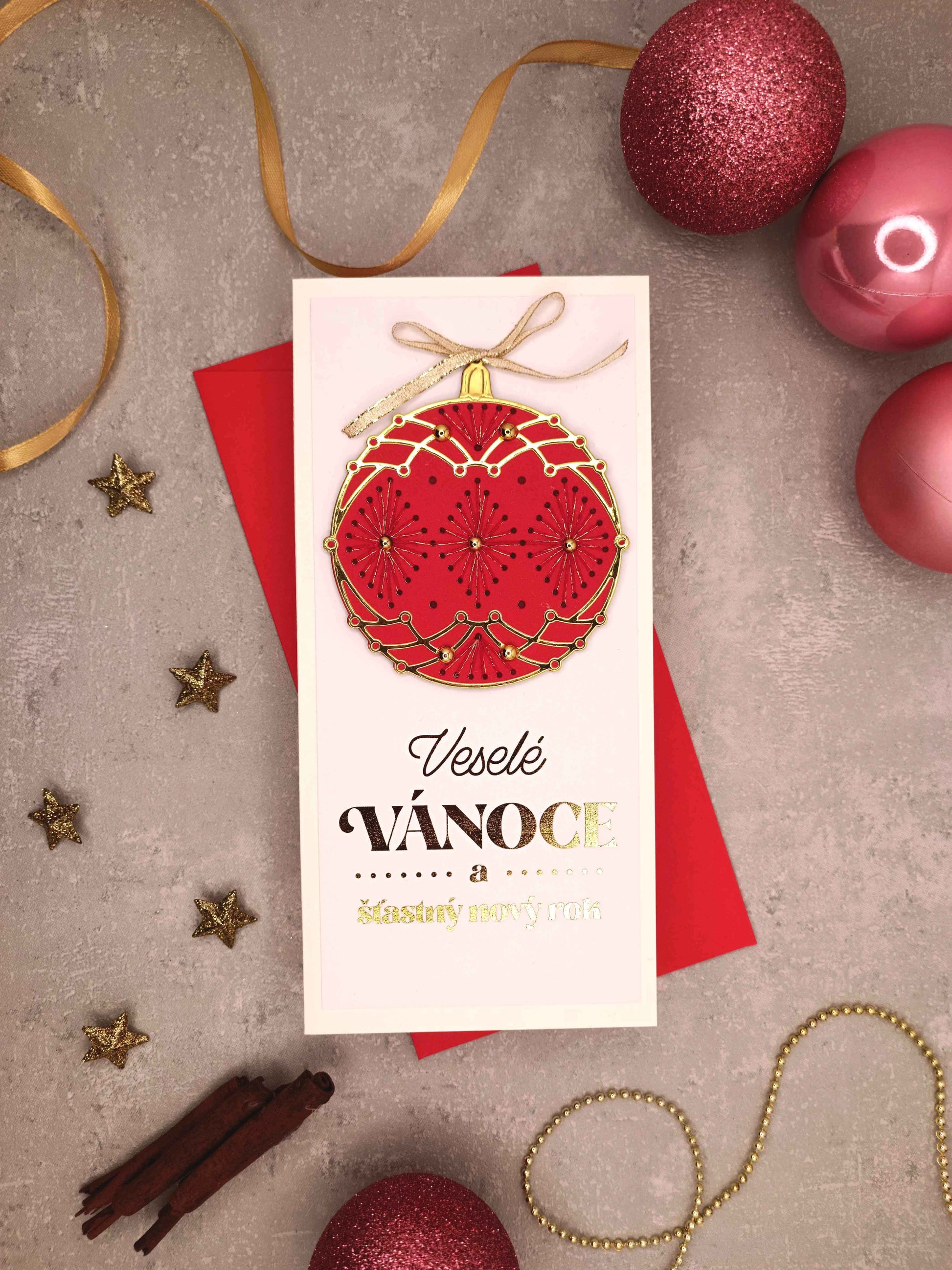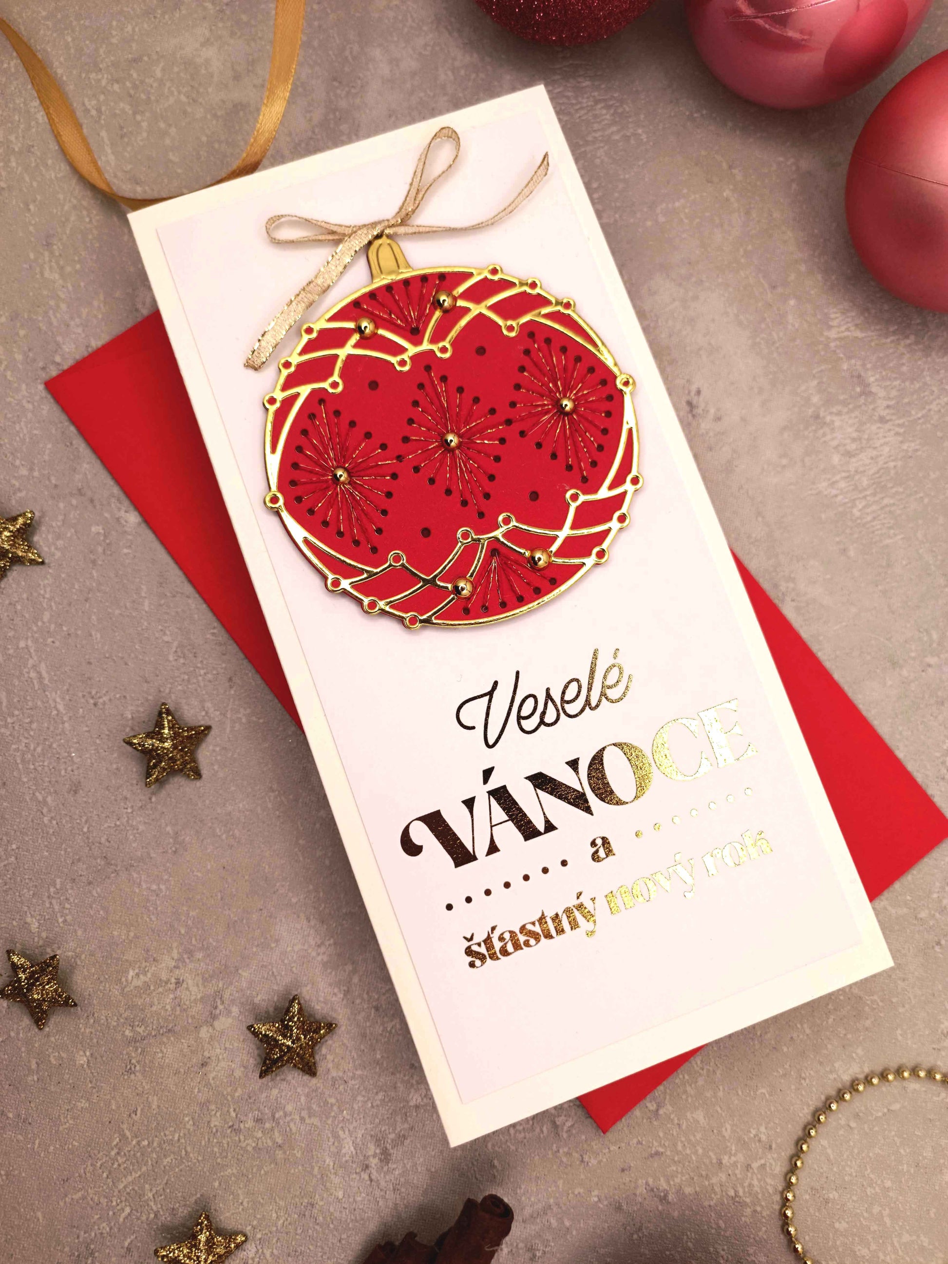 - Přání je zdobeno zlatým metalickým nápisem a vyšívanou vánoční baňkou