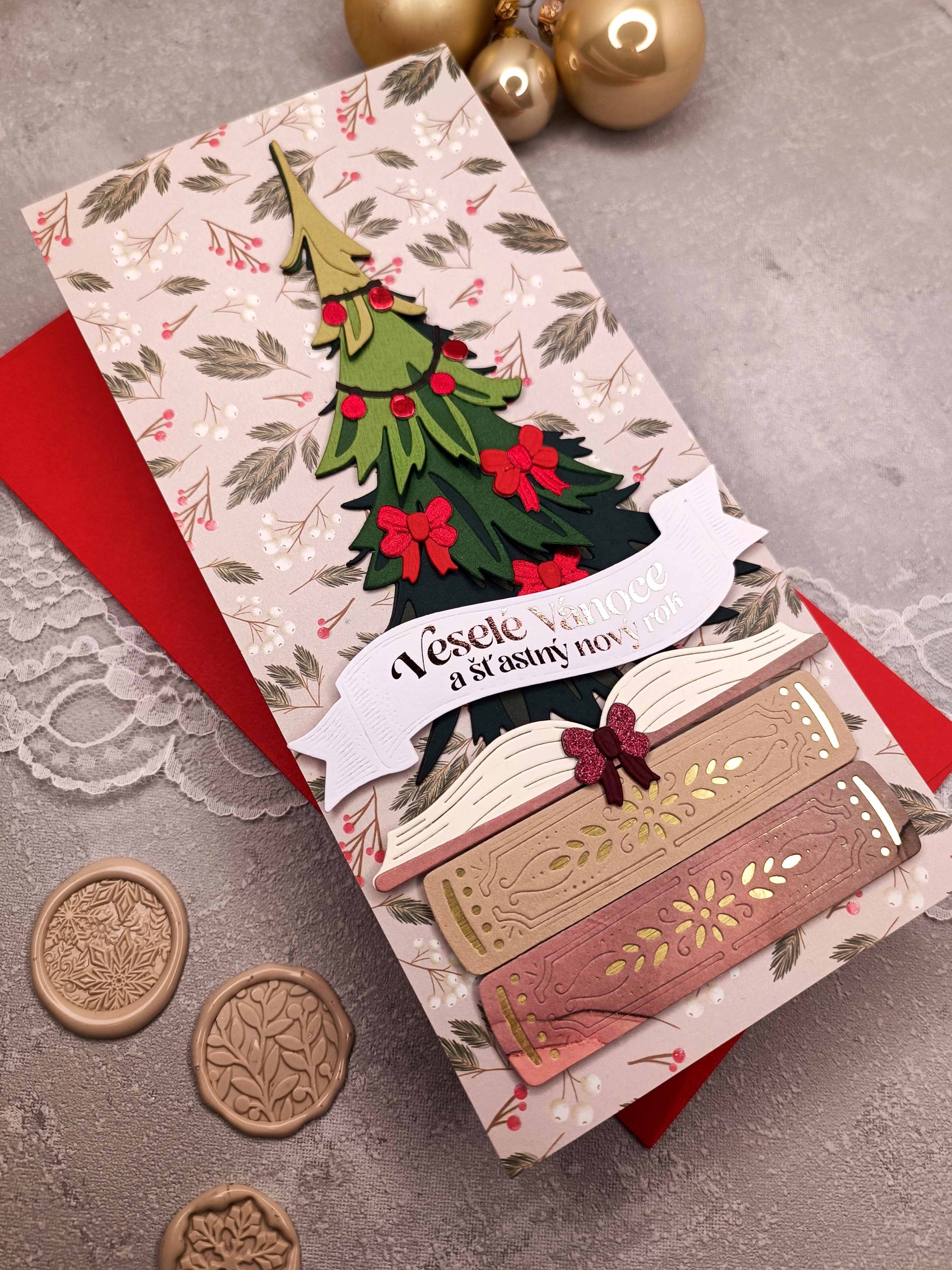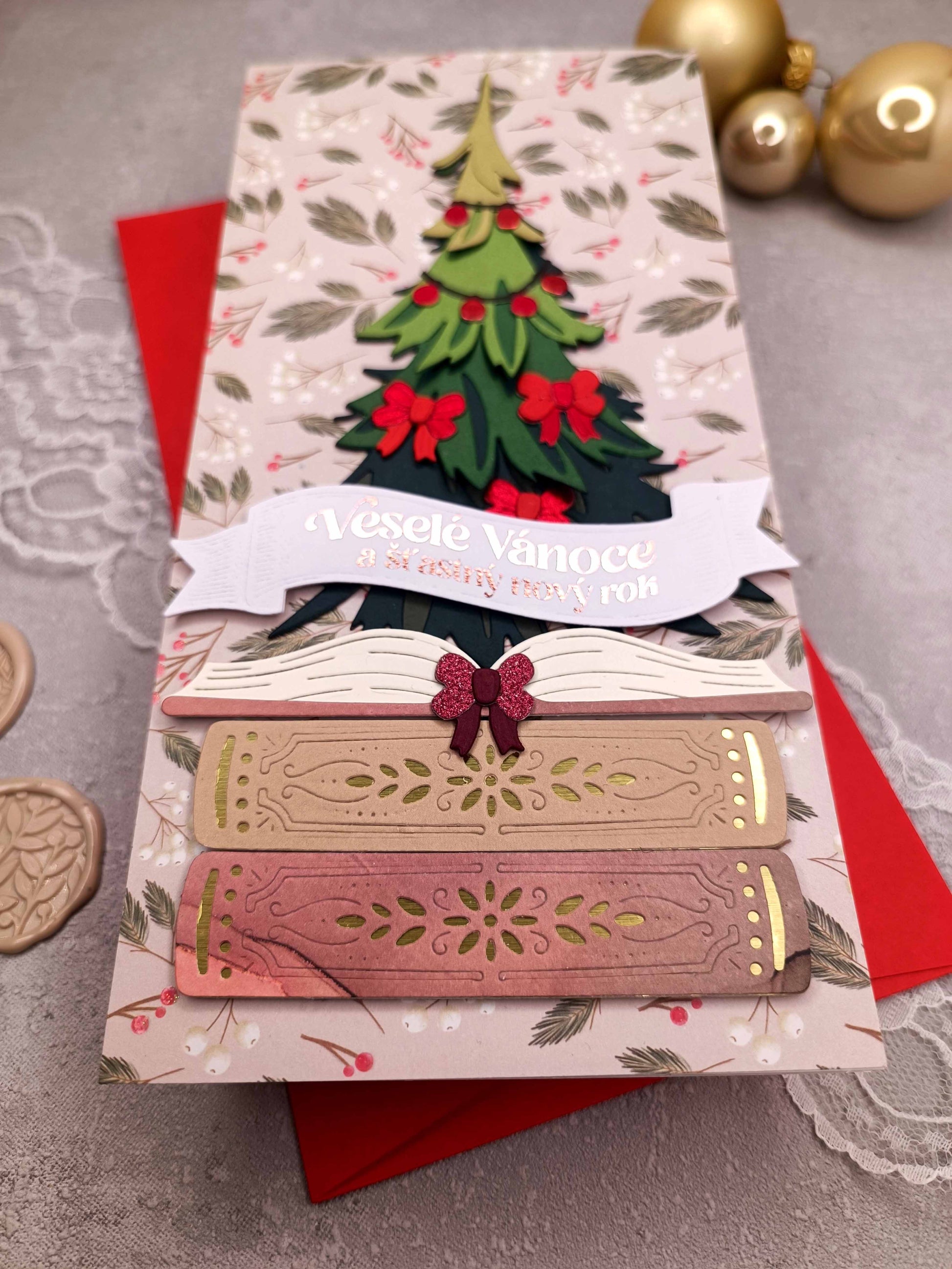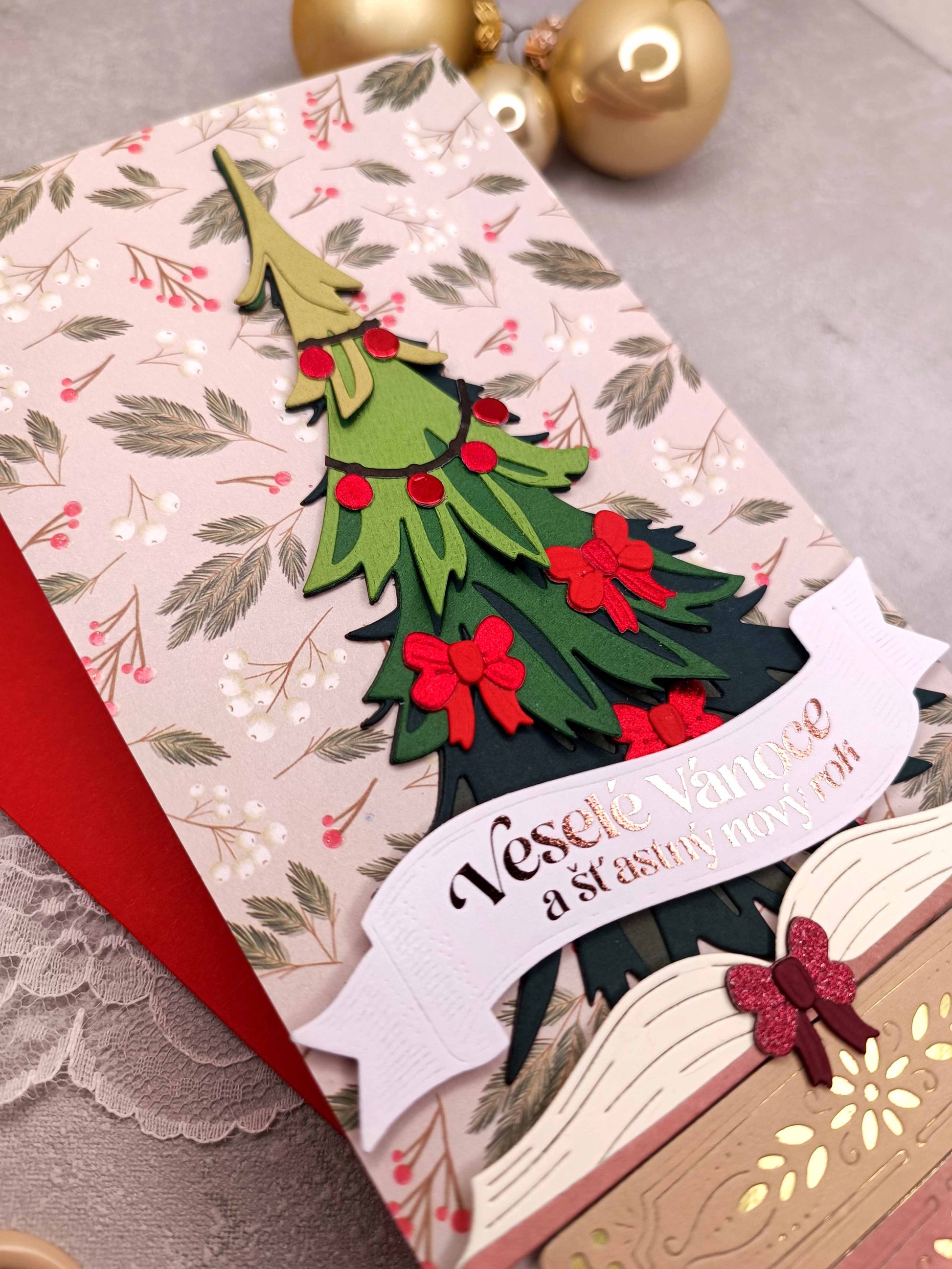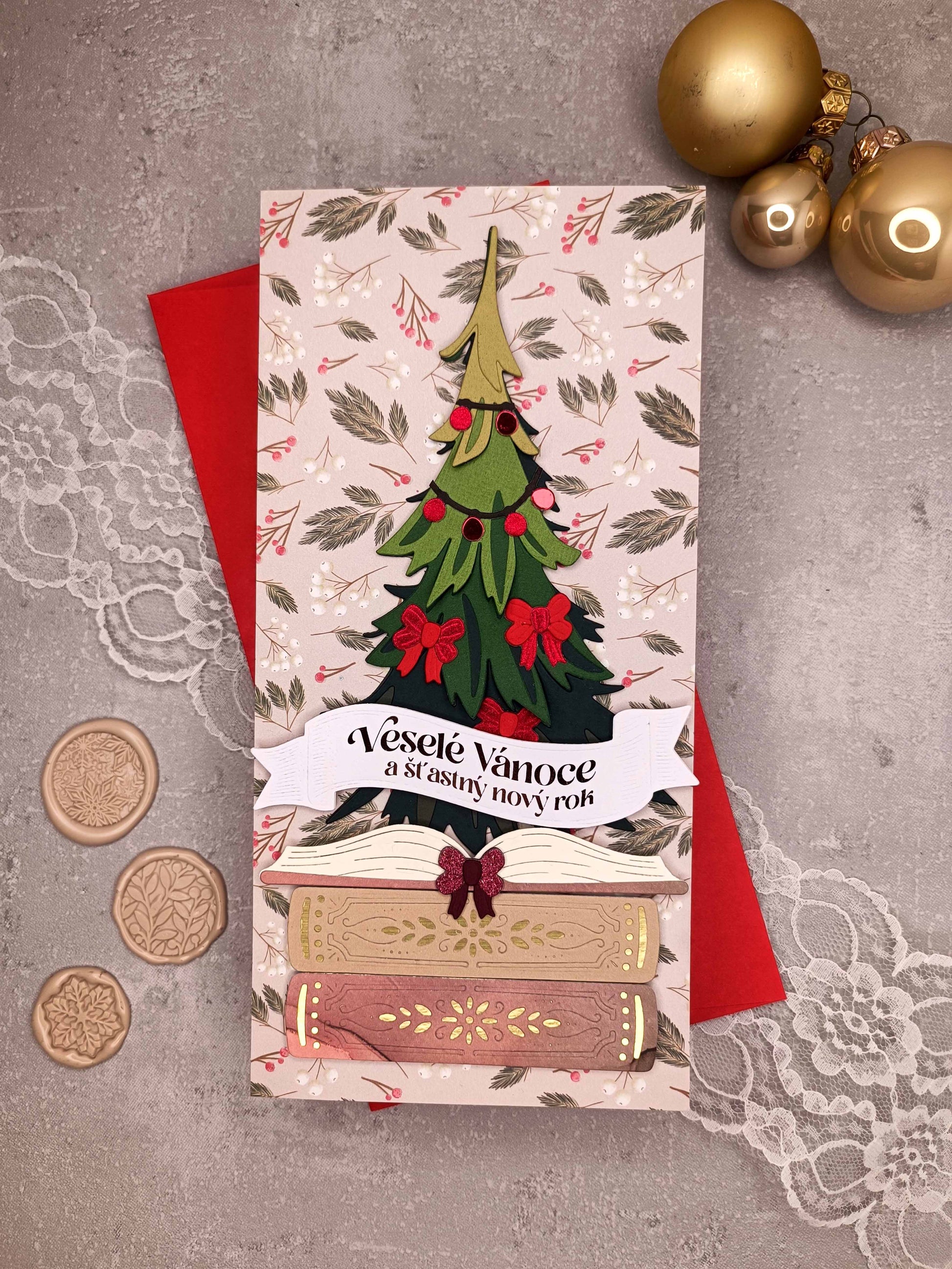- Ručně vyrobené vánoční přání s vánočním stromečkem a knížkami