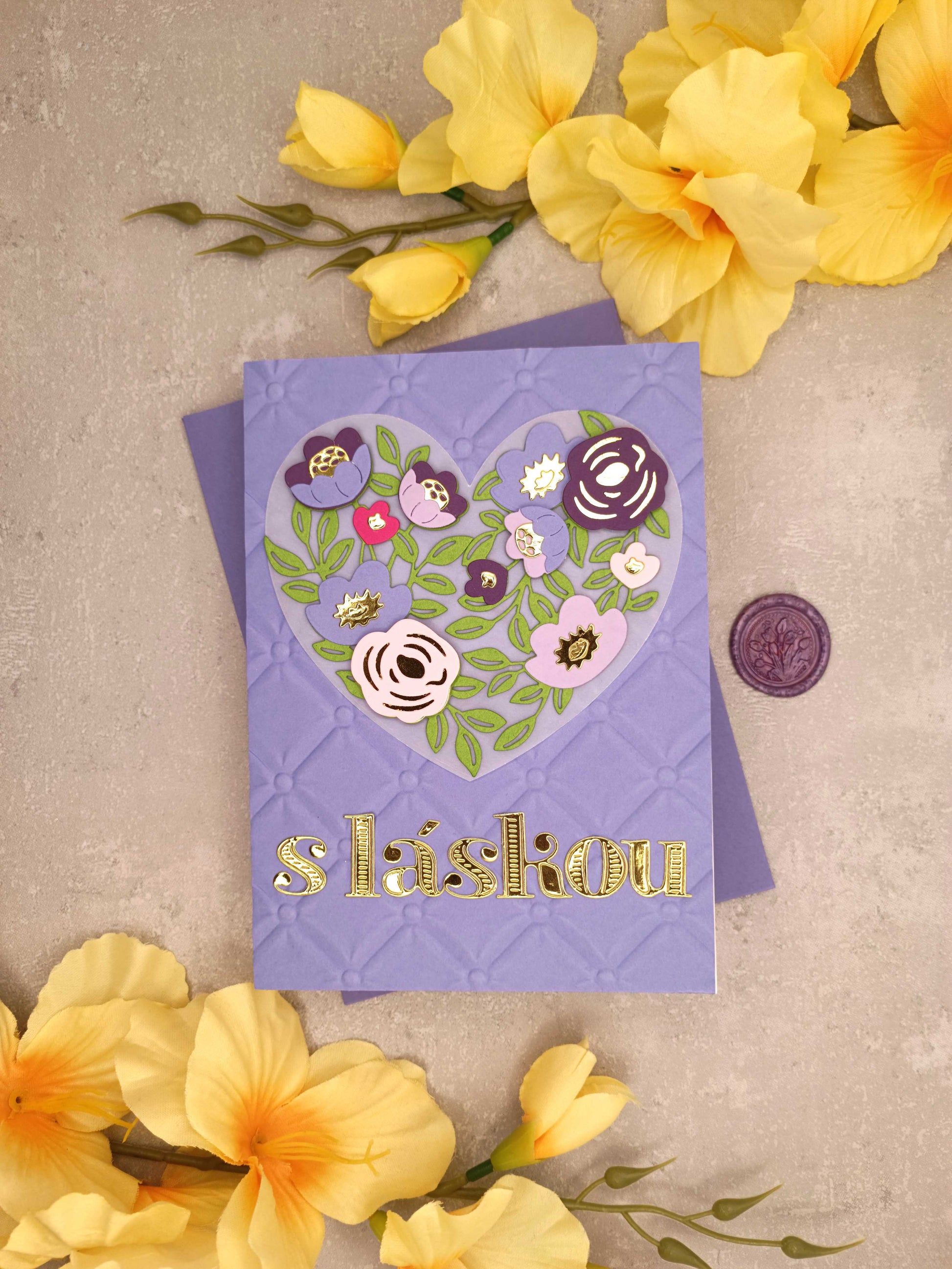 - Součástí je ručně vyrobená fialová obálka a samolepící pečeť
