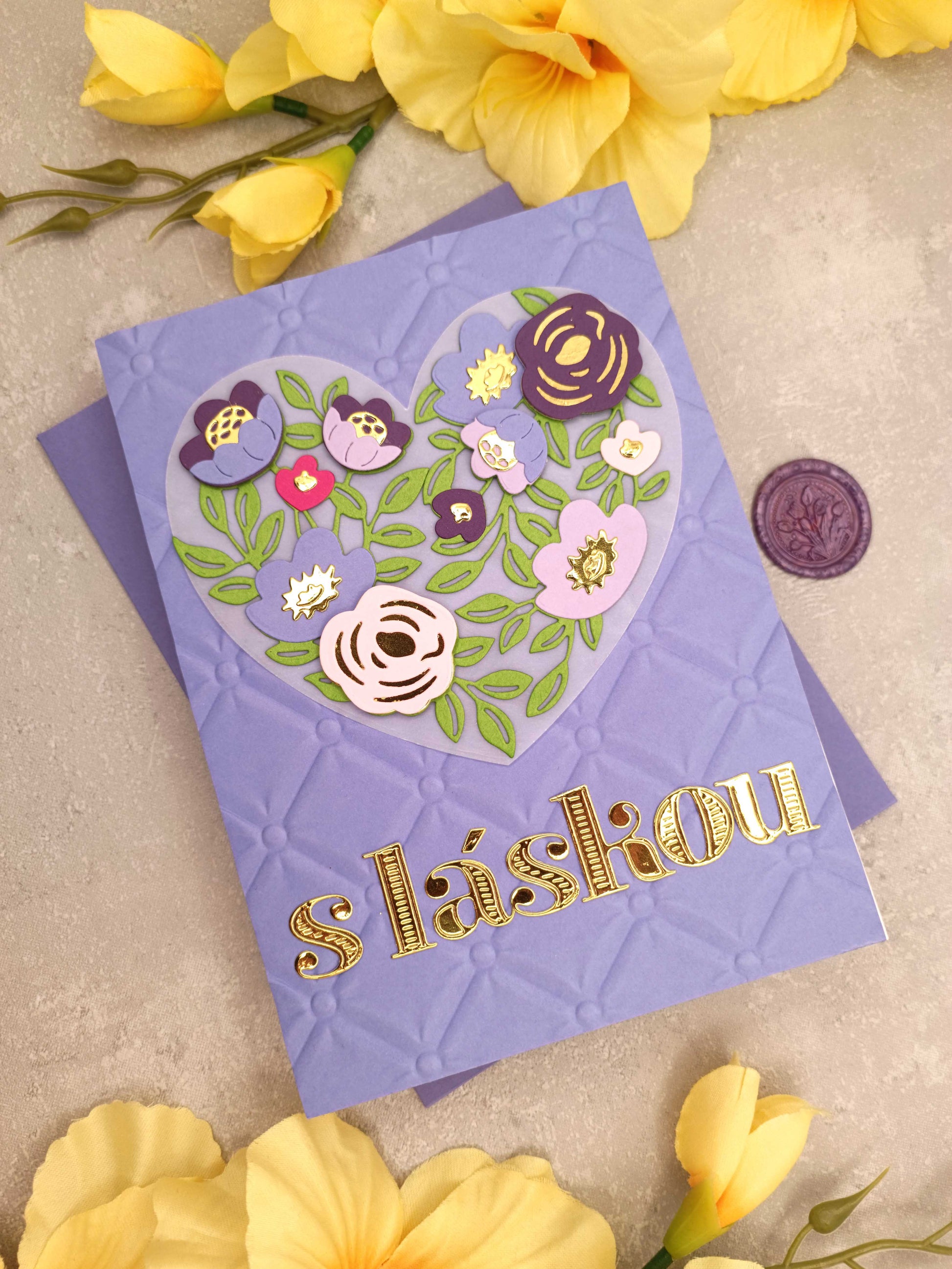 - Přáníčko je zdobeno embosovaným papírem a zlatým nápisem