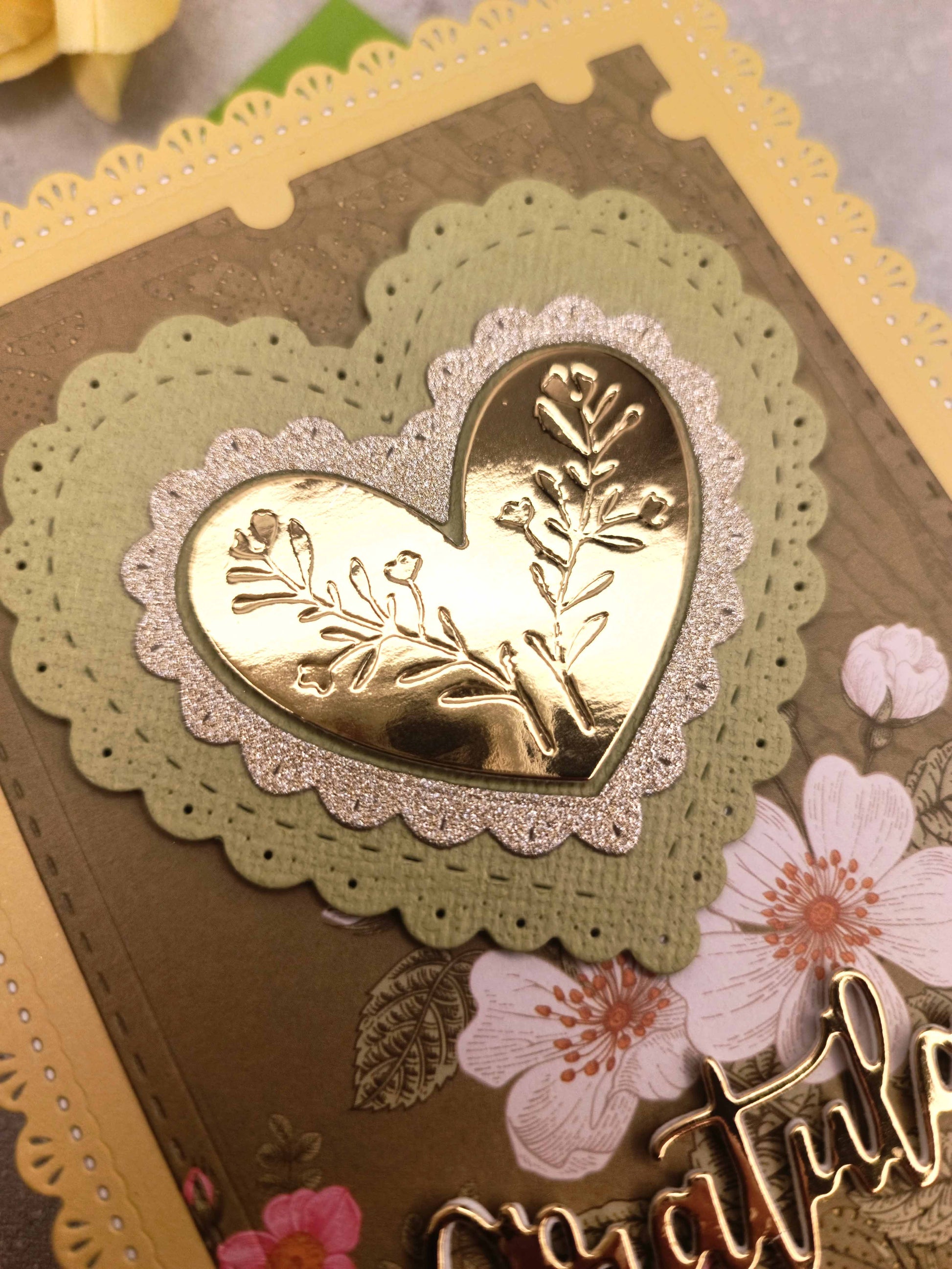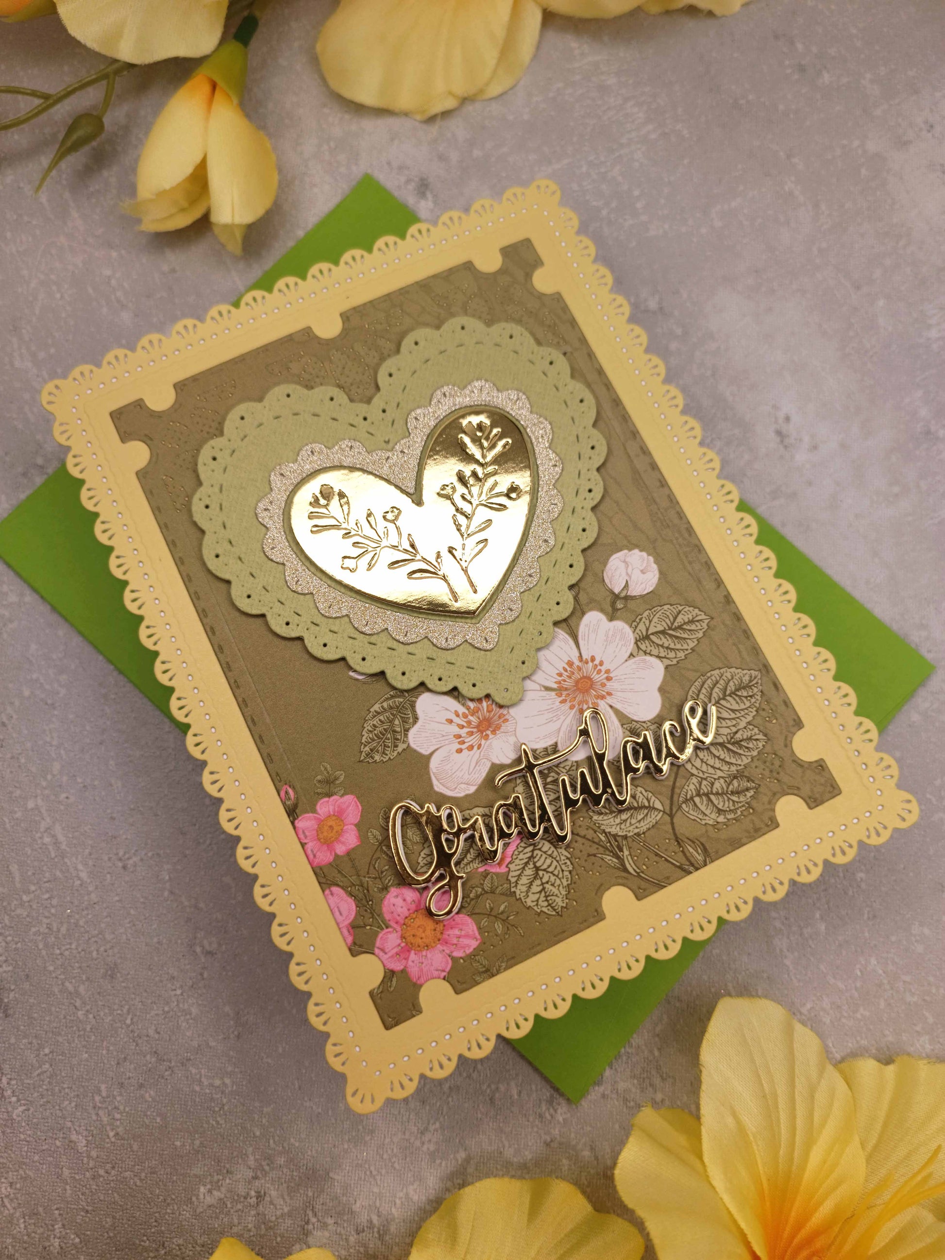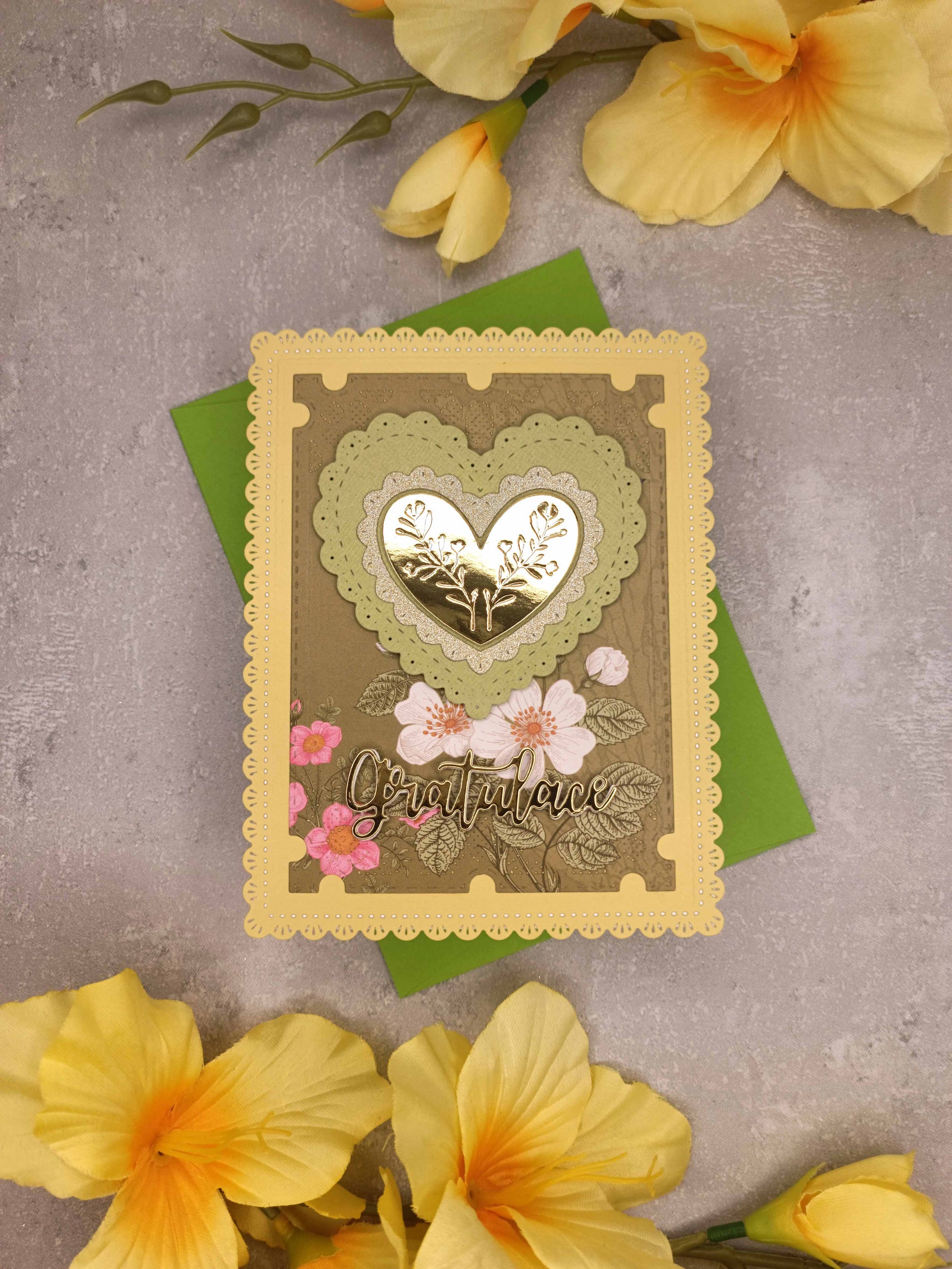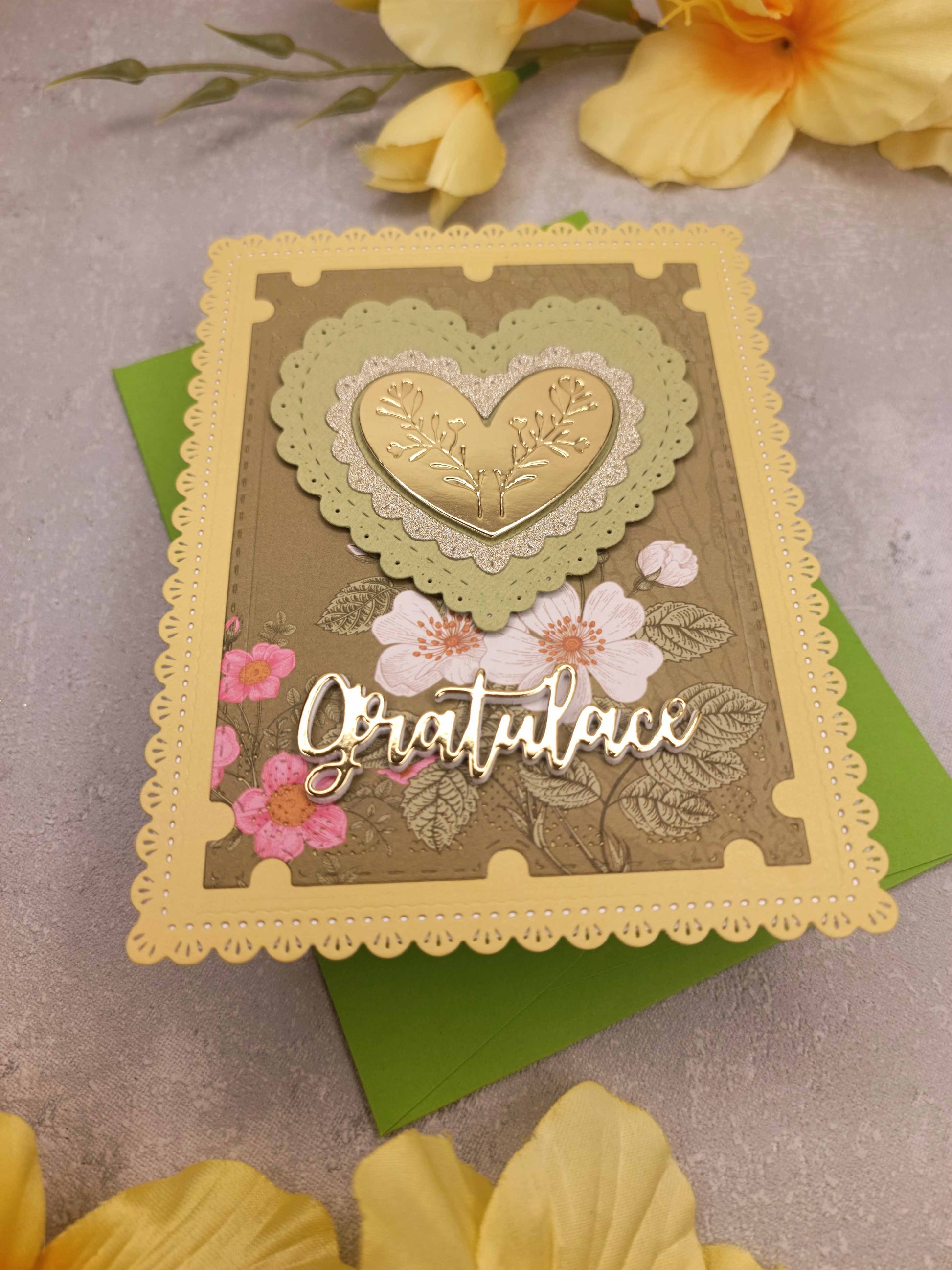 - Přáníčko je zdobeno zlatými elementy a zlatým nápisem Gratulace