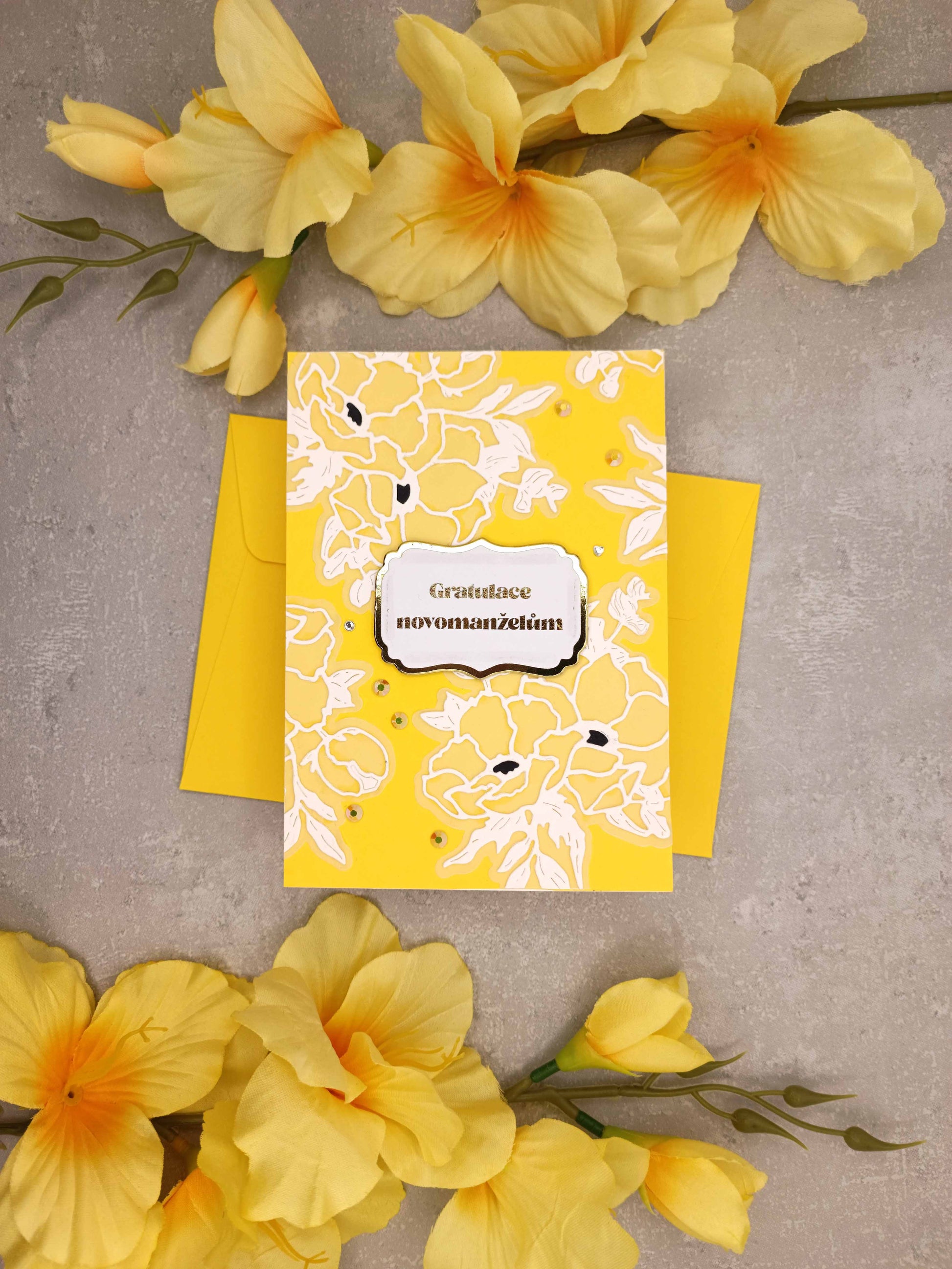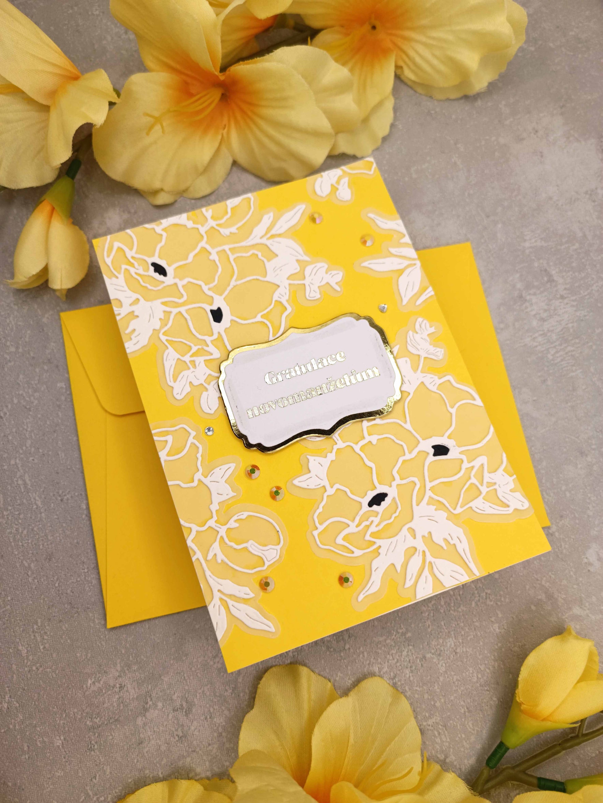 Žluté svatební přání s bílými květinami